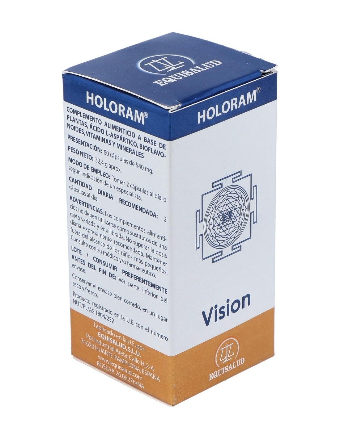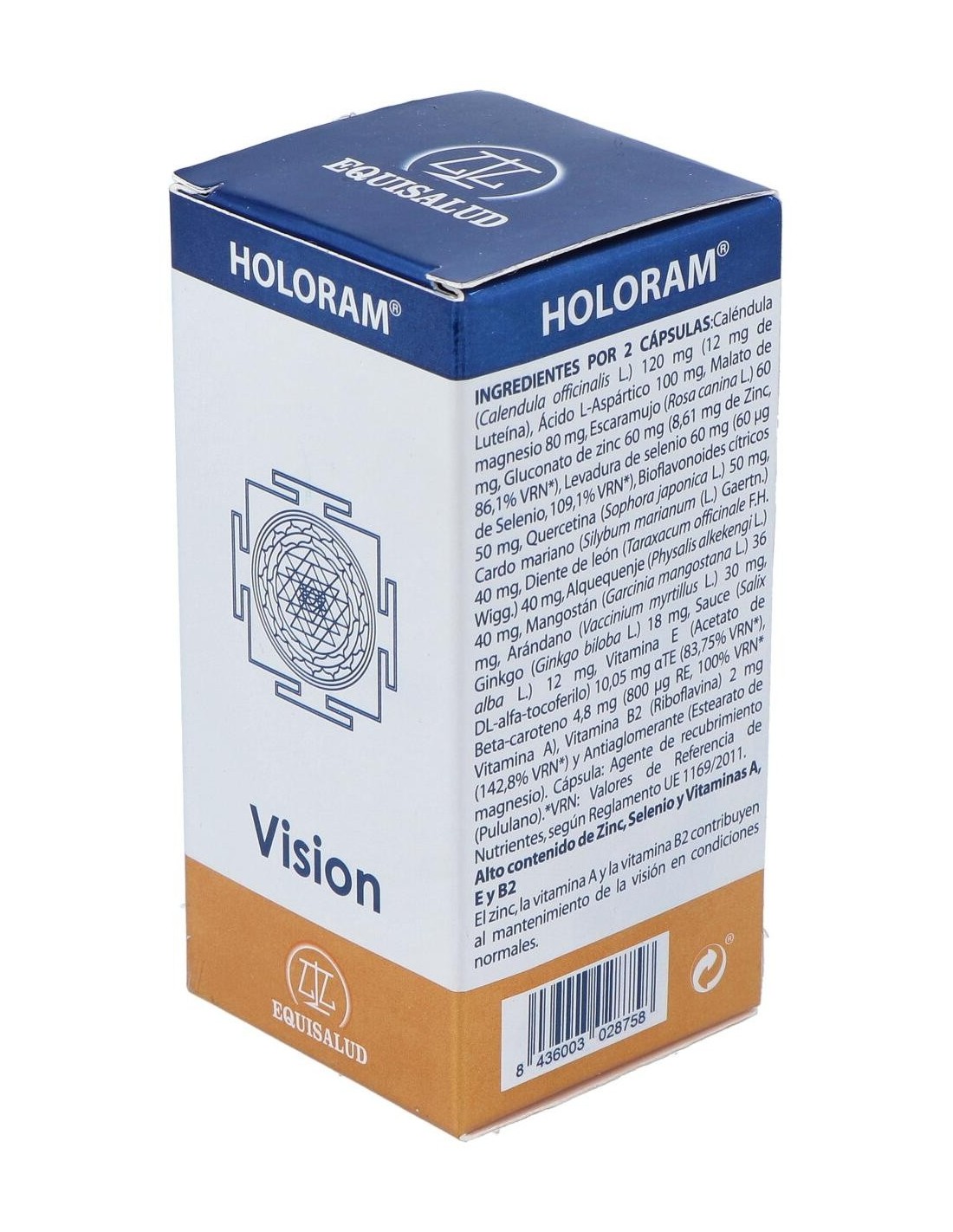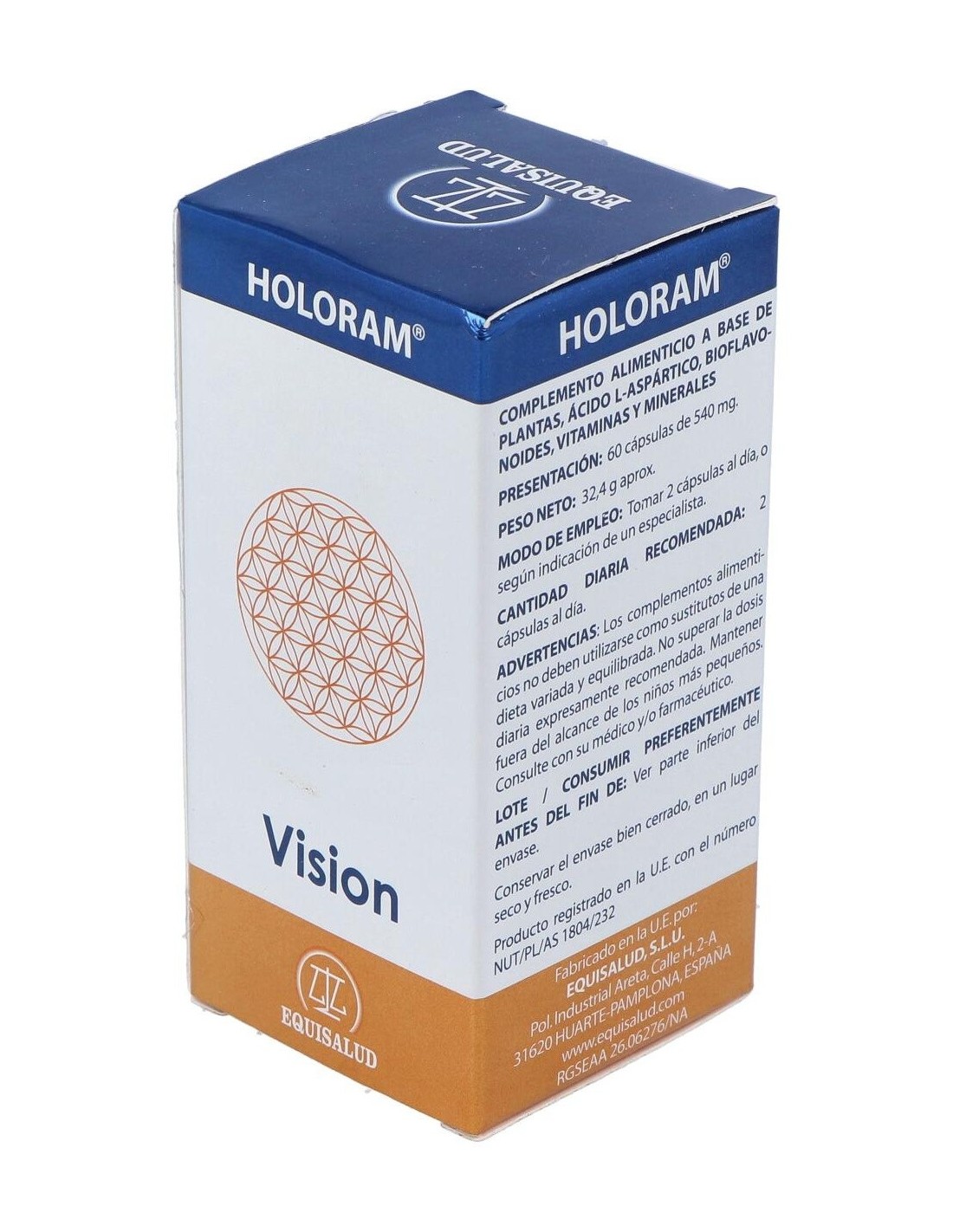 Grupo I. Fitoterapéuticos: Su combinación y dosificación precisa aporta la información indispensable al equilibrio nutricional de las células de la retina. Biorreguladores de los procesos naturales que mantienen el equilibrio de la microcirculación, la integridad del endotelio vascular y la inmunidad necesarias para la preservación de la función visual: escaramujo extracto seco (Rosa canina, fruto, 0,2% ácido ascórbico) 30 mg; arándano extracto seco (Vaccinium myrtillus, fruto, > 25% antocianósidos), 15 mg; ginkgo extracto seco (Ginkgo biloba, hoja, 24% ginkgoflavonas), 9 mg. Cardo mariano extracto seco (Silybum marianum, semilla, 80% silimarina), 20 mg; diente de león extracto seco (Taraxacum officinale, raíz, > 2% inulina) 20 mg. Estos dos ingredientes tonifican la función hepática que es indispensable para el equilibrio energético de la retina, Además por el aporte de vitamina A mejoran la calidad de la visión y previenen la ceguera nocturna. Alquequenje (Physalis alkekengi, fruto, ratio 4:1), 20 mg. Por su contenido en Zeaxanthina y la luteolina aportan la información necesaria a la prevención de la degeneración macular y la consiguiente pérdida de visión. Su actividad es reforzada por la luteína contenida en el HoloRam Vision. Aporte de la información que estimula los procesos antiinflamatorios y antigregantes plaquetarios propios del organismo. Sauce extracto seco (Salix alba, corteza, 15% salicina), 6 mg.