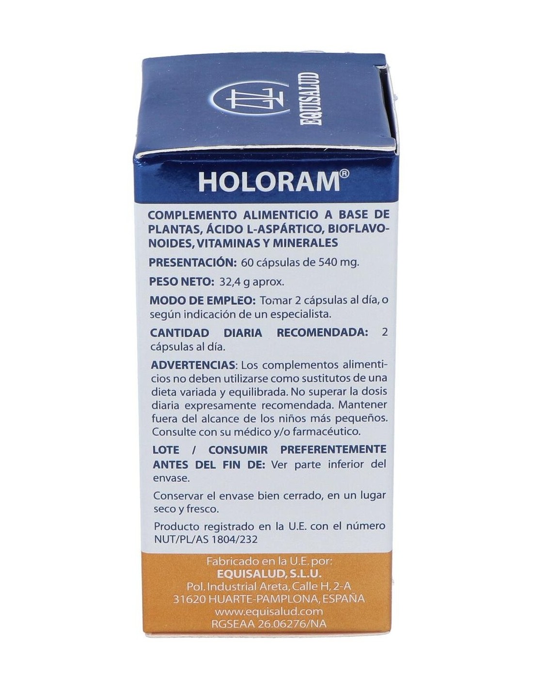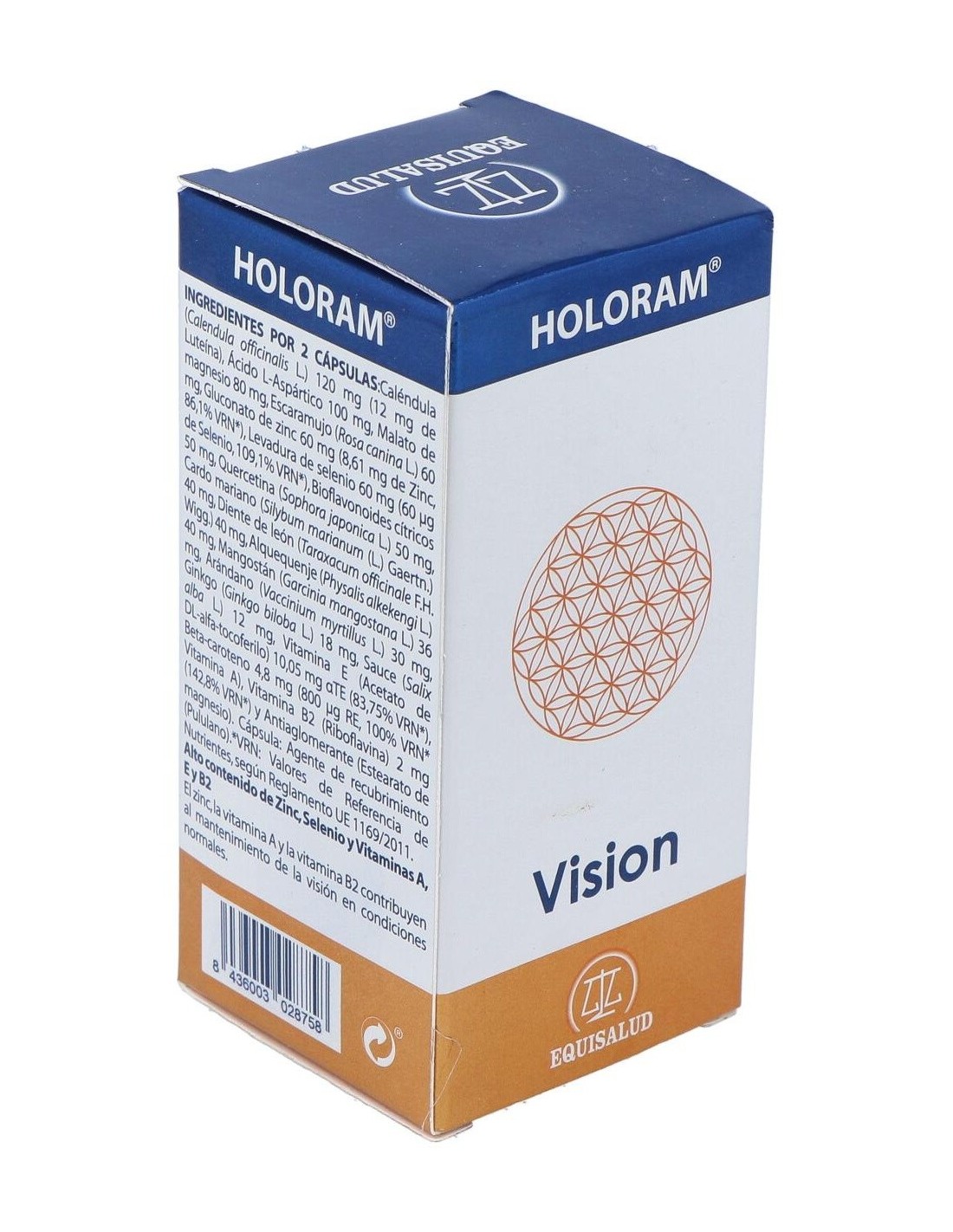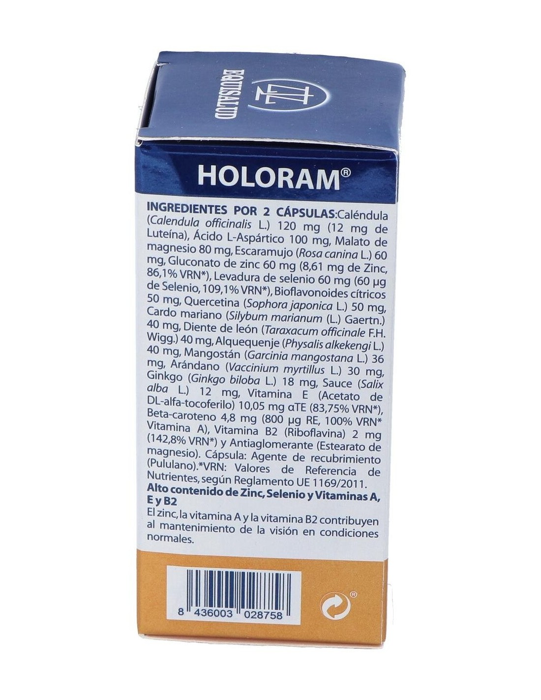 Grupo I. Fitoterapéuticos: Su combinación y dosificación precisa aporta la información indispensable al equilibrio nutricional de las células de la retina. Biorreguladores de los procesos naturales que mantienen el equilibrio de la microcirculación, la integridad del endotelio vascular y la inmunidad necesarias para la preservación de la función visual: escaramujo extracto seco (Rosa canina, fruto, 0,2% ácido ascórbico) 30 mg; arándano extracto seco (Vaccinium myrtillus, fruto, > 25% antocianósidos), 15 mg; ginkgo extracto seco (Ginkgo biloba, hoja, 24% ginkgoflavonas), 9 mg. Cardo mariano extracto seco (Silybum marianum, semilla, 80% silimarina), 20 mg; diente de león extracto seco (Taraxacum officinale, raíz, > 2% inulina) 20 mg. Estos dos ingredientes tonifican la función hepática que es indispensable para el equilibrio energético de la retina, Además por el aporte de vitamina A mejoran la calidad de la visión y previenen la ceguera nocturna. Alquequenje (Physalis alkekengi, fruto, ratio 4:1), 20 mg. Por su contenido en Zeaxanthina y la luteolina aportan la información necesaria a la prevención de la degeneración macular y la consiguiente pérdida de visión. Su actividad es reforzada por la luteína contenida en el HoloRam Vision. Aporte de la información que estimula los procesos antiinflamatorios y antigregantes plaquetarios propios del organismo. Sauce extracto seco (Salix alba, corteza, 15% salicina), 6 mg.