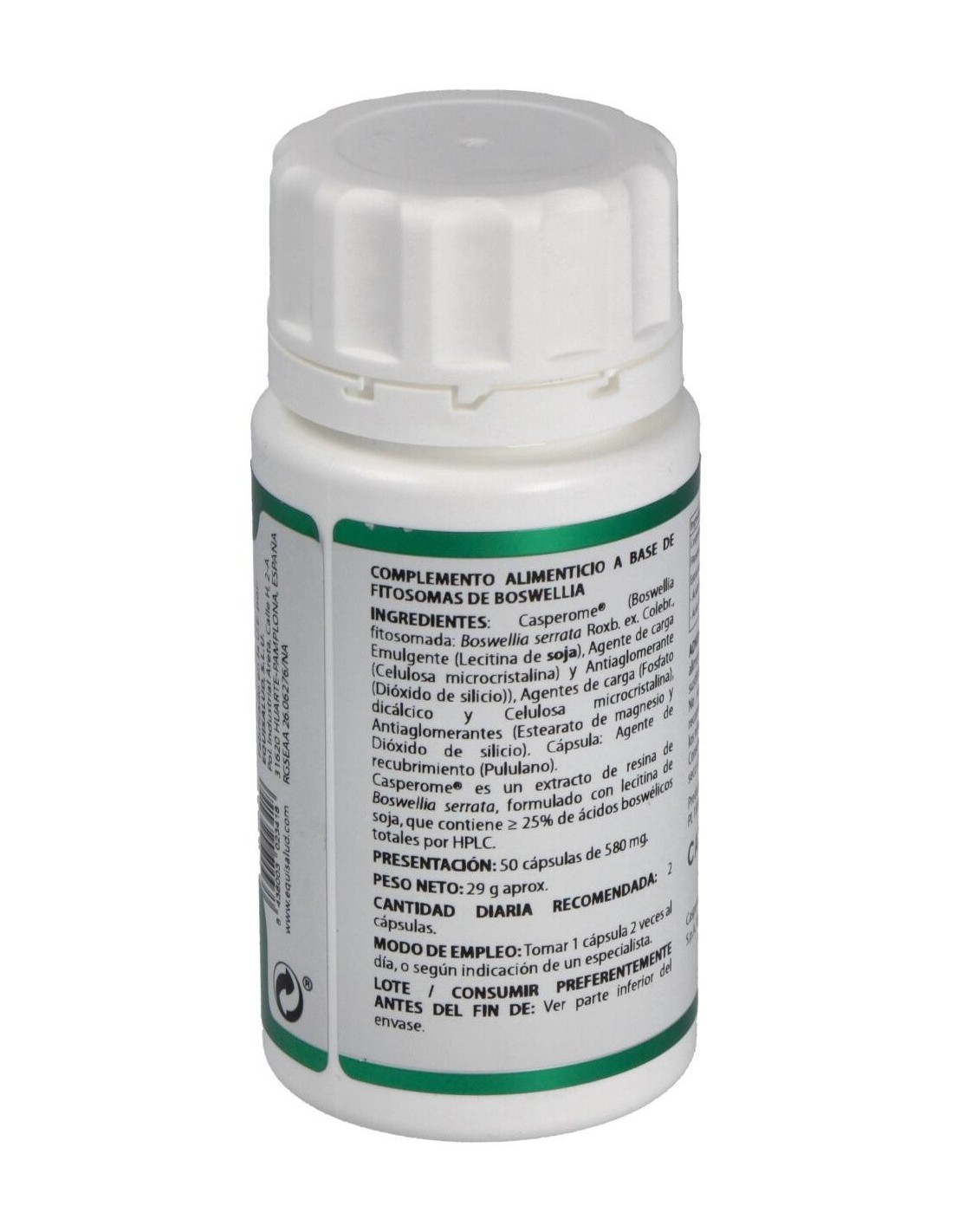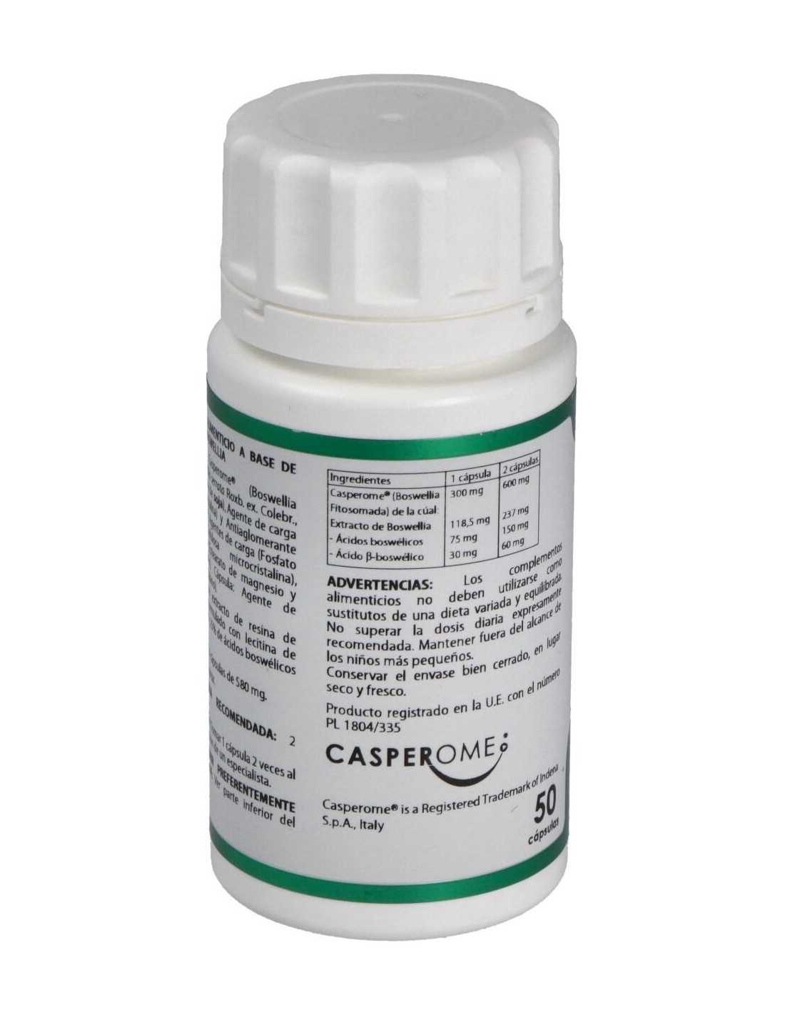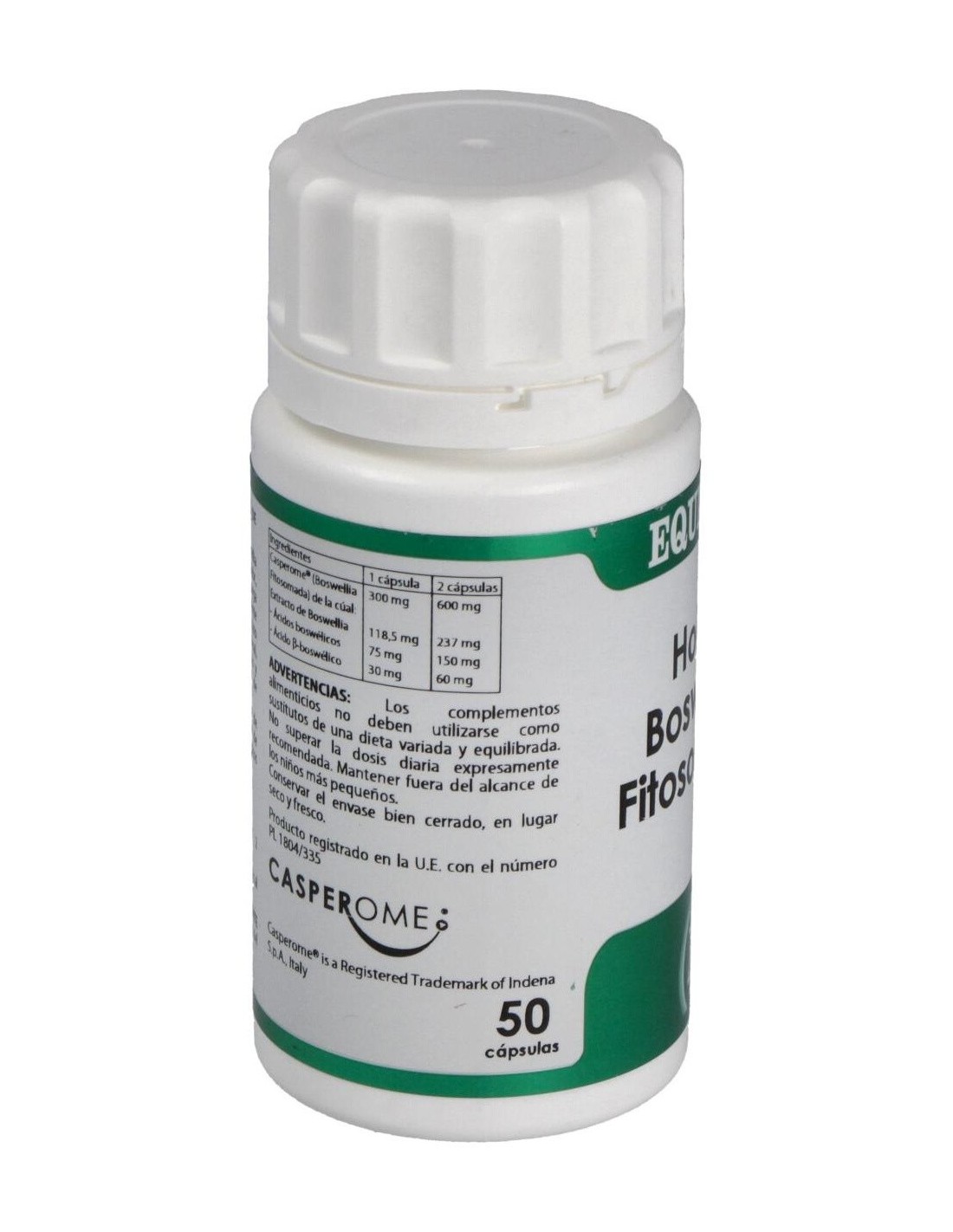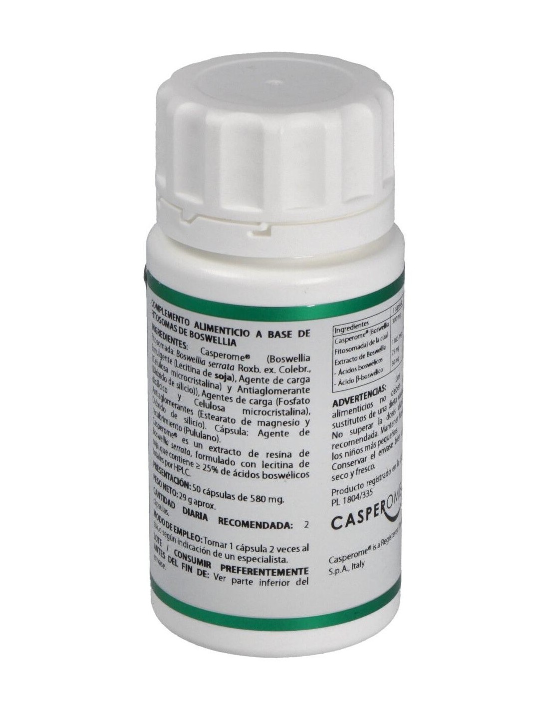 La Boswellia inhibe las enzimas mediadoras de la inflamación, reduciendo muy pronto el dolor y la inflamación. Desinflama la articulación, mejora la movilidad, disminuye la rigidez matutinal, estimula los condrocitos, y modula los mecanismos de feedback de formación de hueso, evitando la destrucción de la matriz del hueso y cartílago.Ingredientes activos por cápsulas:300 mg de Casperome® (Boswellia Fitosomada) (118,5 mg de extracto de boswellia, 75 mg de ácidos boswélicos y 30 mg de ácido ß-boswélico).Modo de empleo:Tomar 1 cápsulas, dos veces al día.Presentación:Bote de 50 cápsulas.