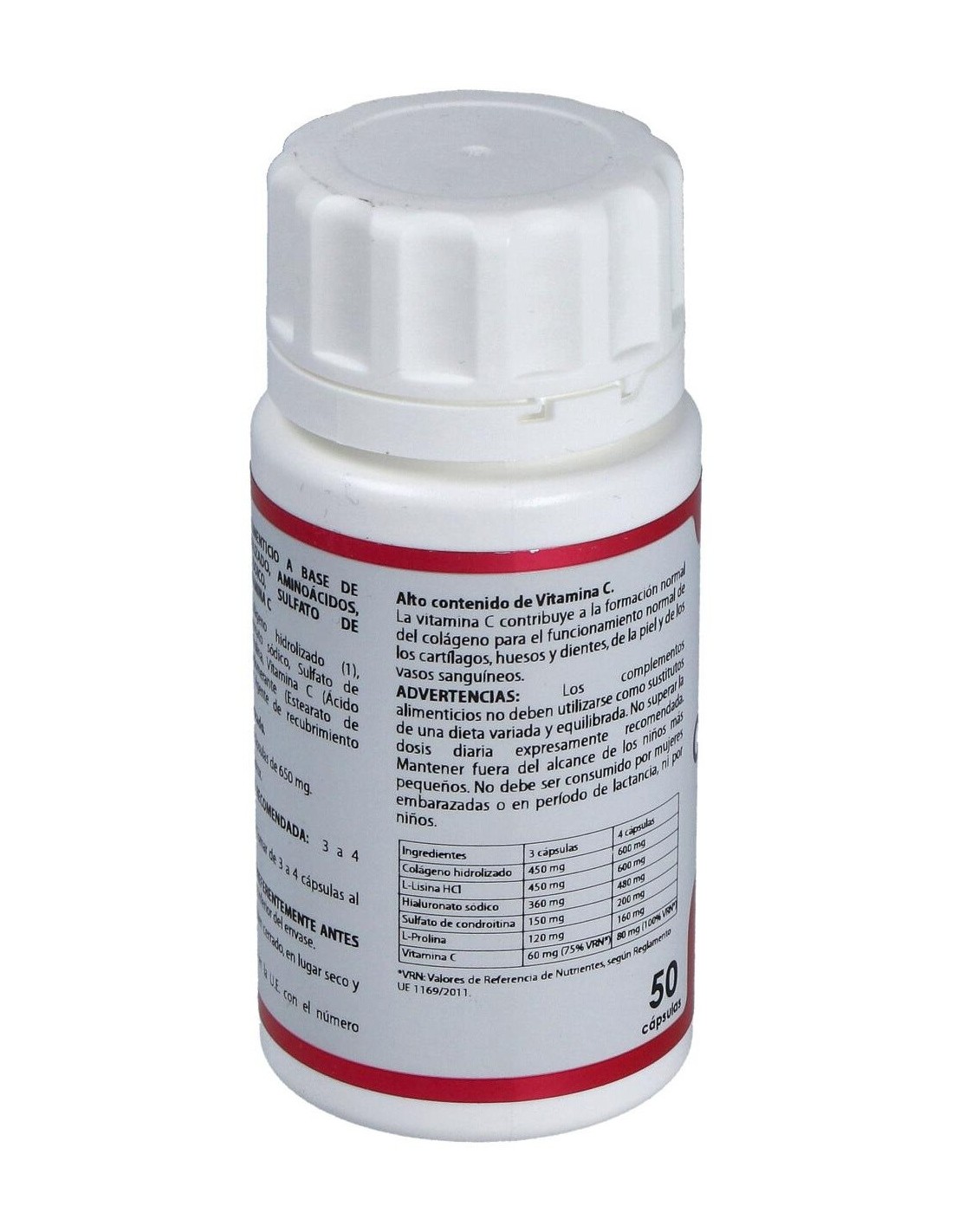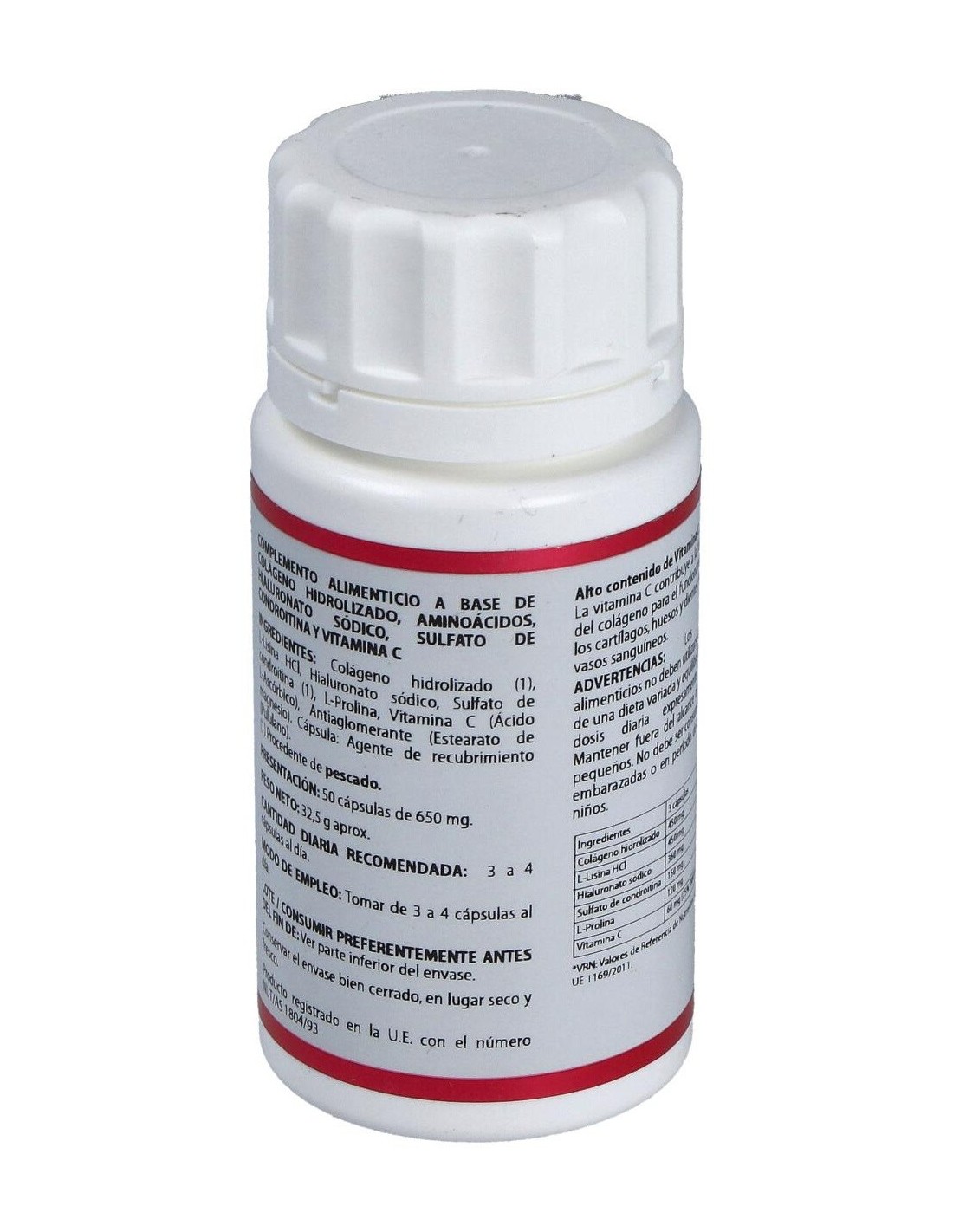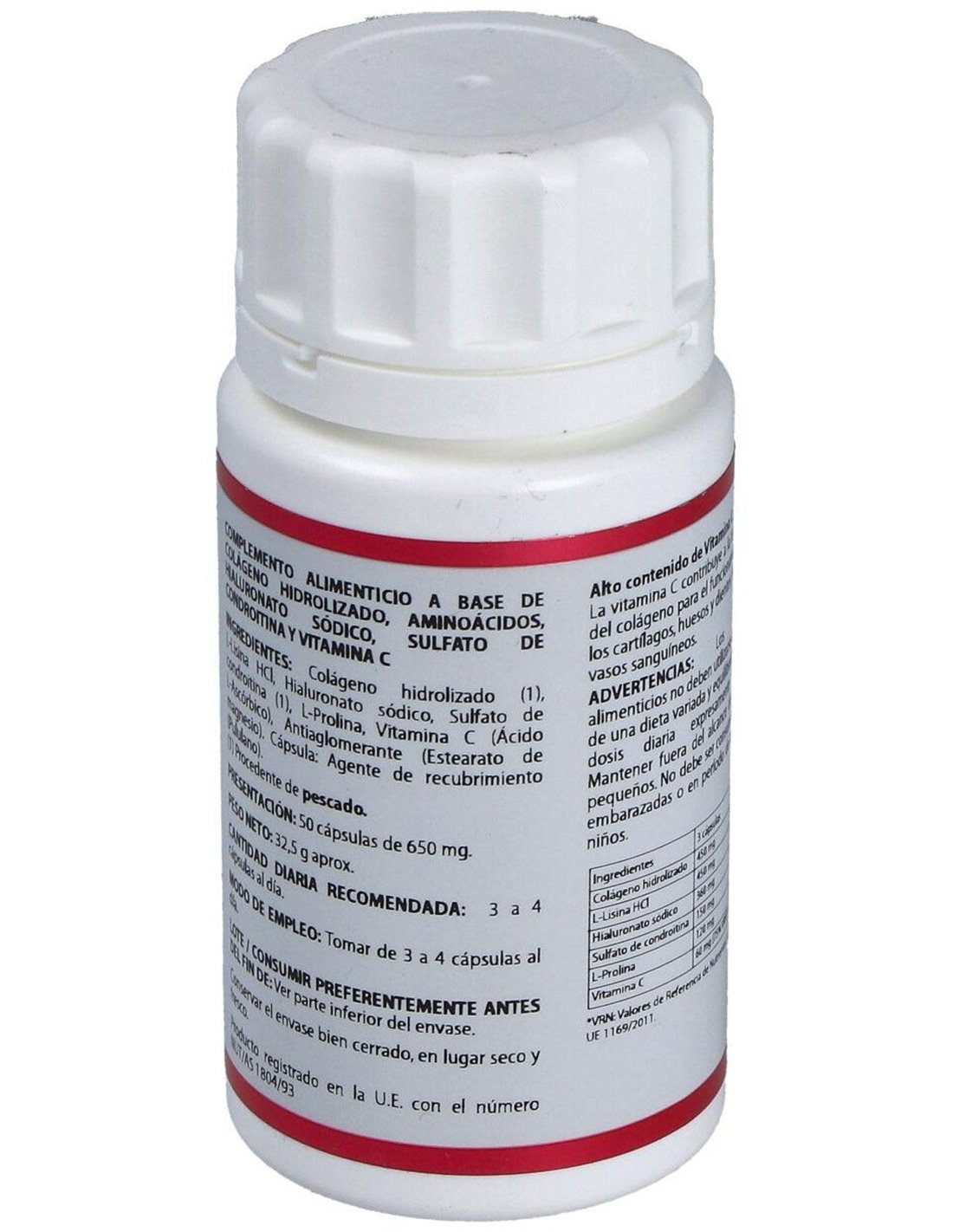 Muchos de los pasos metabólicos de la formación de colágeno necesitan de la vitamina C para que tengan lugar.La condroitina sulfato es un importante glucosaminoglicano, que forma parte de la matriz del hueso y cartílago.El colágeno es un conjunto de proteínas que contienen unos 10 aminoácidos y forma parte de los ligamentos, arterias, huesos, cartílagos, músculo, piel, uñas y pelo.El ácido hialurónico es muy utilizado en dermatología, en medicina estética como regenerador de las piel, en arrugas, implantes, etc. Existe en las articulaciones, en los cartílagos y en la piel, principalmente. Tiene la propiedad de estimular la producción de colágeno y la retención de agua, haciendo de almohadilla de protección en las articulaciones o hidratando la epidermis. También actúa como lubricante en las articulaciones. Se usa en osteoartritis y en artrosis, así como en las arrugas y pieles envejecidas.La unión de estas sustancias forma un conjunto único, especialmente diseñado para regenerar cartílagos y arrugas en la piel, así como ligamentos y tendones.Composición por cápsula: