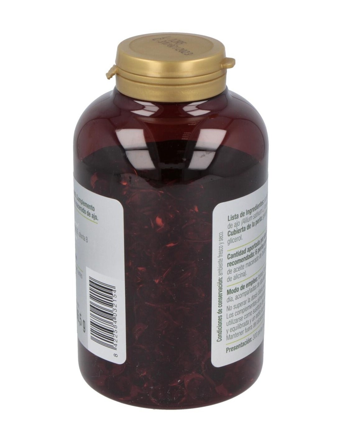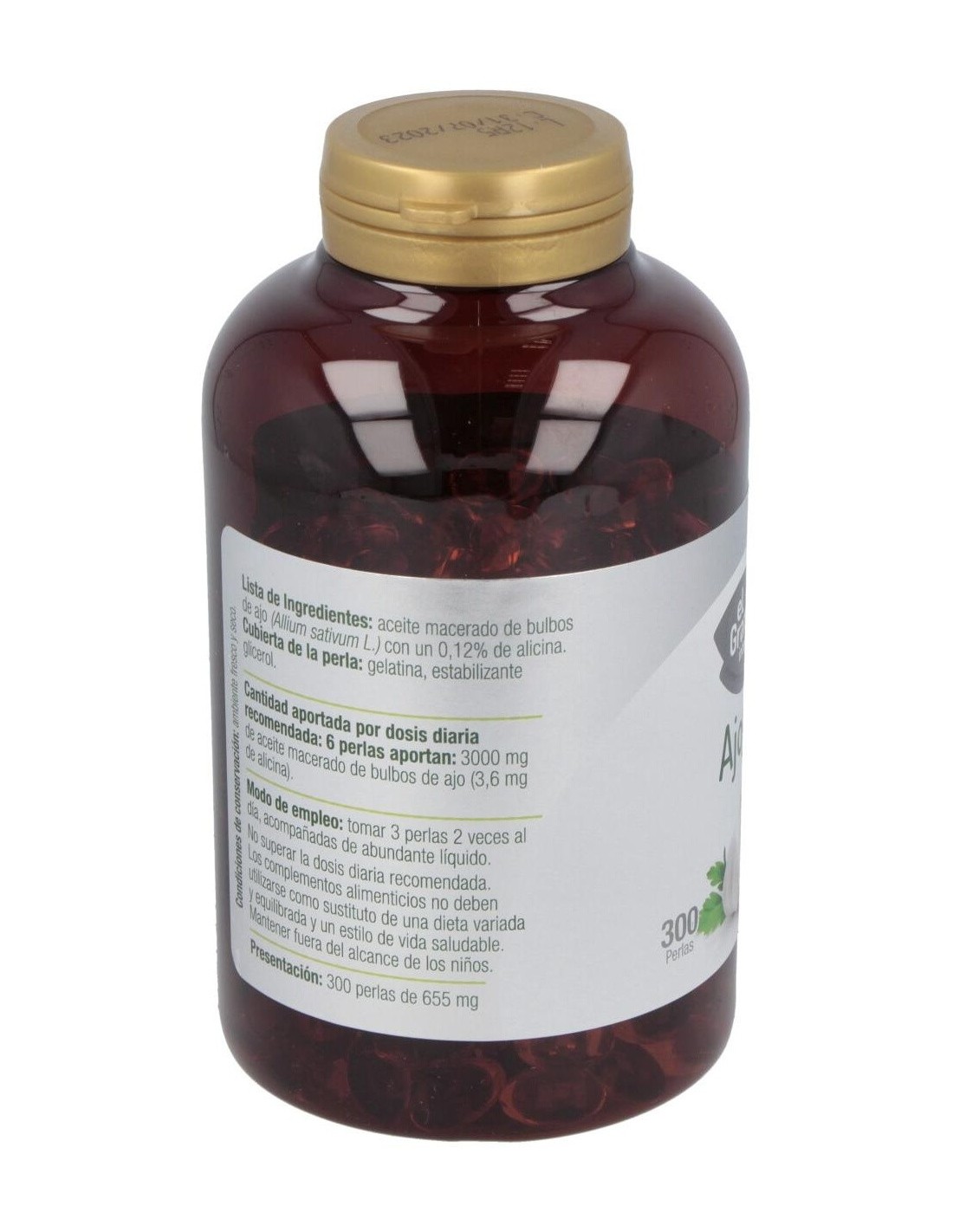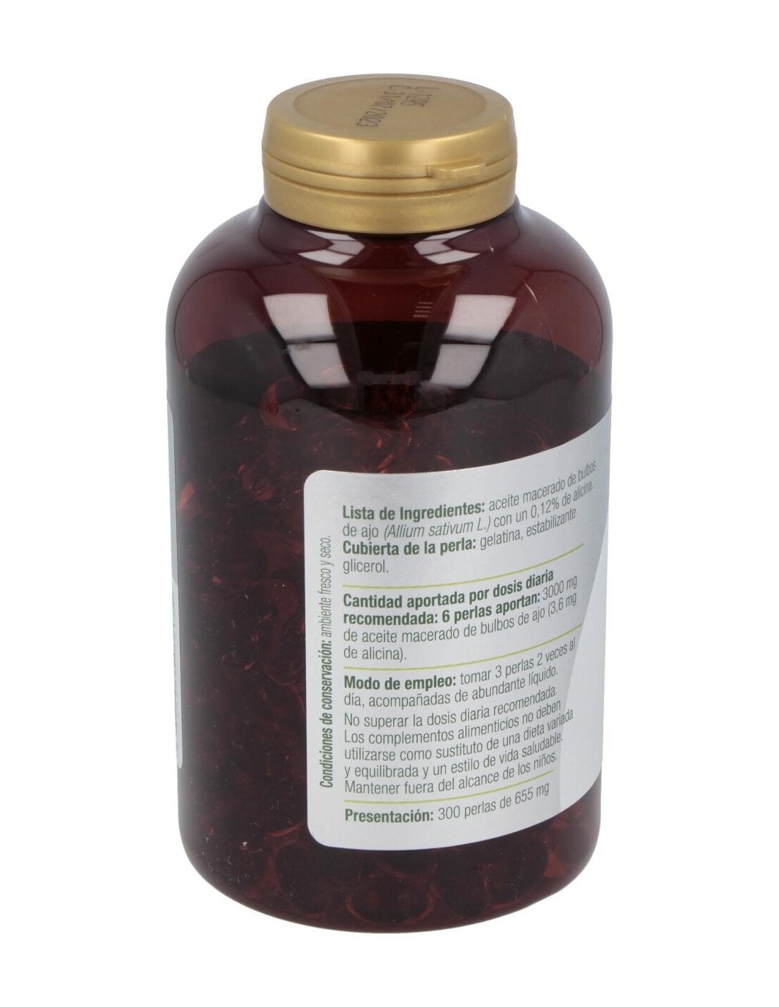 Composición por perla:300 mg de ajo macerado en aceite vegetal. Modo de empleo:Tomar 3 perlas 2 veces al día. Presentación:Bote de 300 perlas.