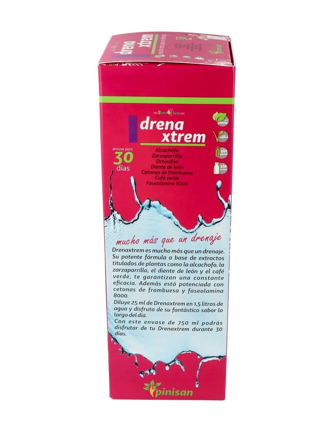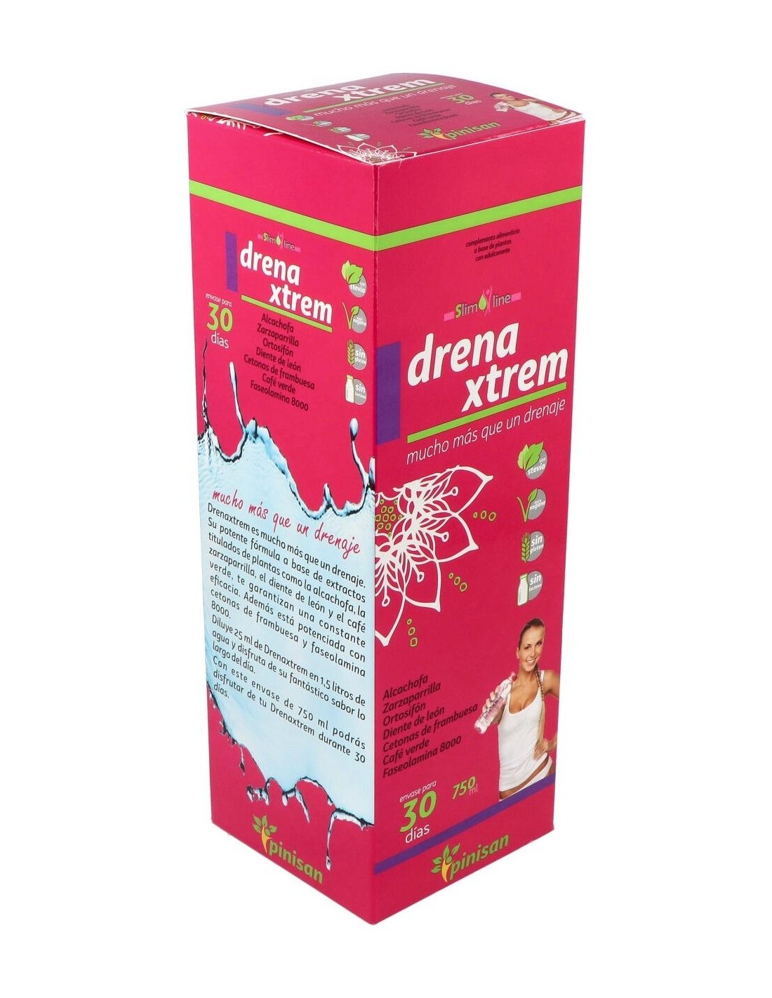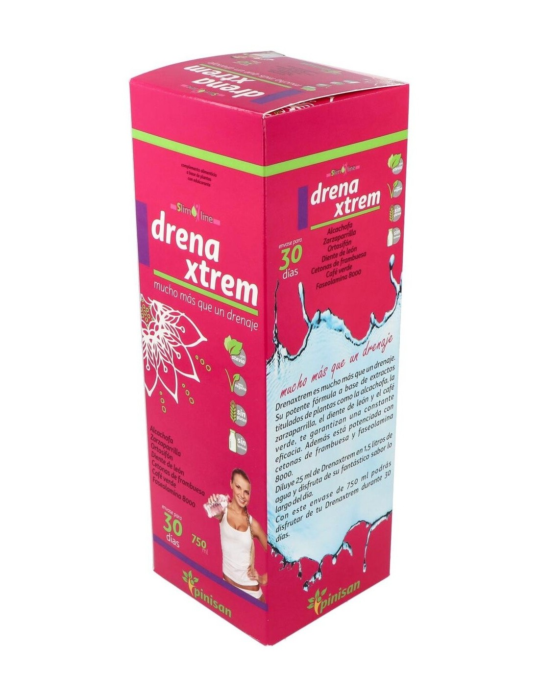 Sus siete activos vegetales: ortosifón, zarzaparrilla, alcachofa, diente de león, café verde (todos ellos en forma de extracto tilulado, para garantizarte la constante presencia de sus principios acticos), cetonas de frambuesa y faseolamina 8.000, componen una formulación mucho más allá de un simple drenaje, tanto por la sinergia de sus ingredientes como por la concentración de los mismos. Su moderno y cómodo envase de 750 ml, que incluye un practico vasito dosificador, contiene el producto suficiente para que disfrutes de sus beneficios durante 30 días. Para usarlo solo debes diluir 25 ml de DrenaXtrem en 1,5 litros de agua, y tomar la mezcla a lo largo del día. Obtendrás así una refrescante bebida edulcorada con estevia, ideal como coadyuvante en dietas de control de peso.Composición activa por 25 ml: