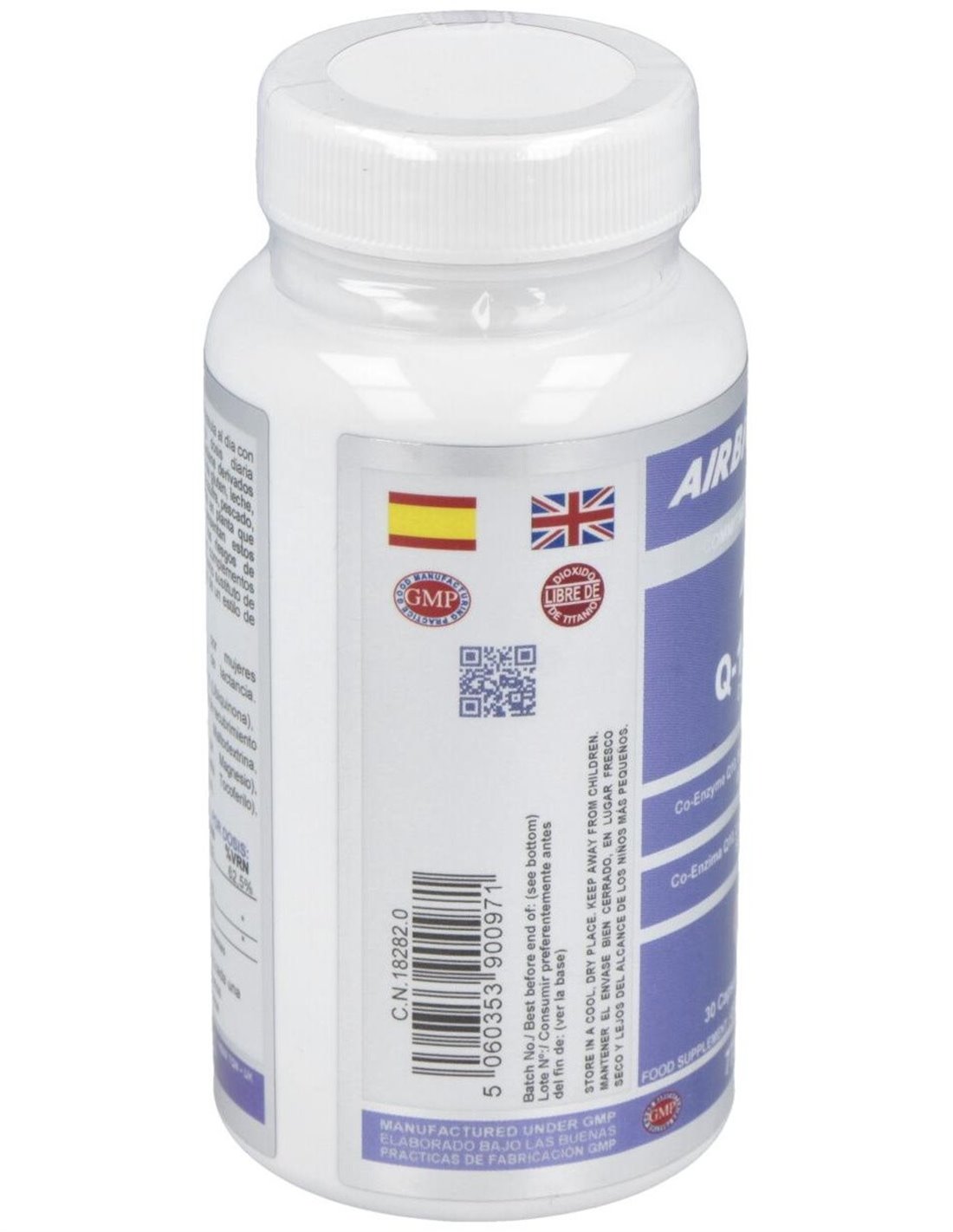 La CoQ10 (Coenzima Q10) es una sustancia soluble en grasa que se encuentra en las mitocondrias celulares. Se la conoce también como ubiquinona, por estar presente en todos los organismos vivos. Los tejidos con mayor concentración de Co-Enzima Q10 son aquellos con necesidades energéticas más elevadas y los que se regeneran muy rápidamente, como tejido muscular, tejido cardíaco y encías. Cada cápsula de Co-Enzima Q10 200 mg de Airbiotic® contiene 200 mg de Co-Enzima Q10 junto con vitamina E, un nutriente sinérgico que contribuye a la protección de las células frente al daño oxidativo y lecitina de soja que mejora la absorción de la Co-Enzima Q10. Es probablemente uno de los productos de Co-Enzima Q10 más concentrados del mercado. Composición activa por cápsula: