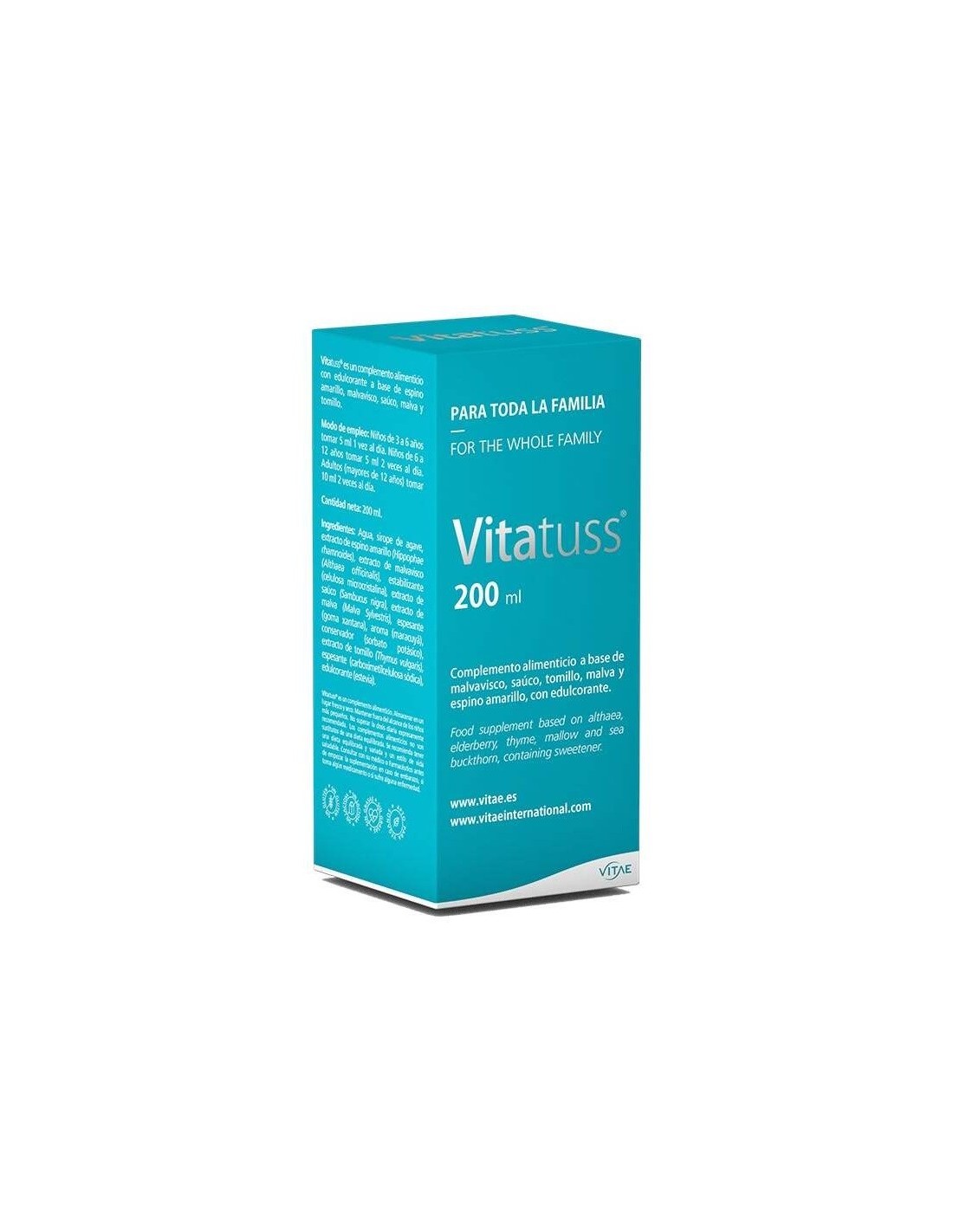 Vitae Vitatuss 200ml es un jarabe compuesto a base de extracto de malvavisco (Althaea officinalis), extracto de saúco (Sambucus nigra), extracto de tomillo (Thymus vulgaris), extracto de malva (Malva sylvestris) y extracto de espino amarillo (Hippophae rhamnoides) con sabor afrutado. Favorece la hidratación de la mucosa, al mismo tiempo que reduce los síntomas del resfriado y el malestar.