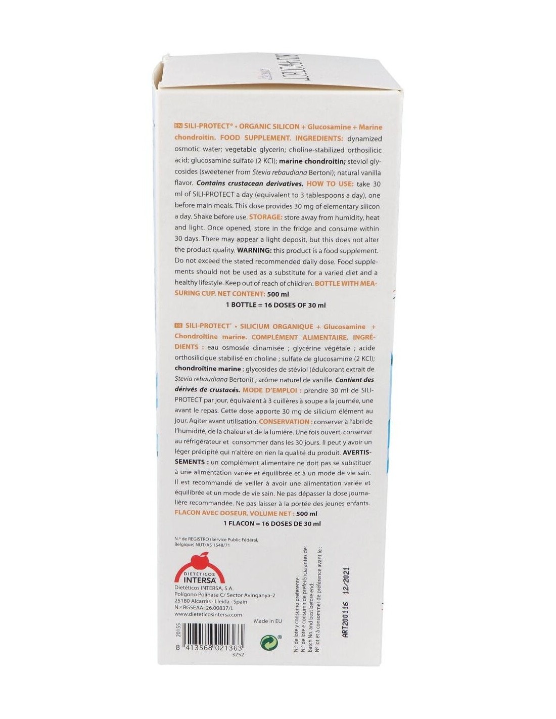 Modo de empleo:Tomar 30 ml al día, que equivalen a 3 cucharadas soperas al día, a repartir antes de las comidas. Disolver el contenido en un poco de agua y tomar. Con esta dosificación se aporta 30 mg de silicio elemental al día.Presentación:Frasco de 500 ml con dosificador.