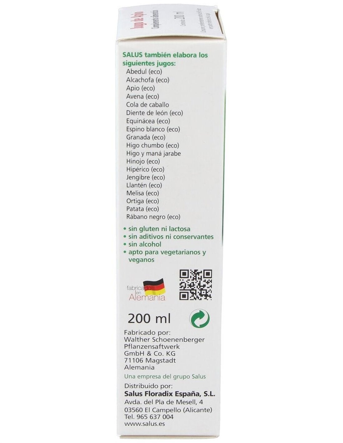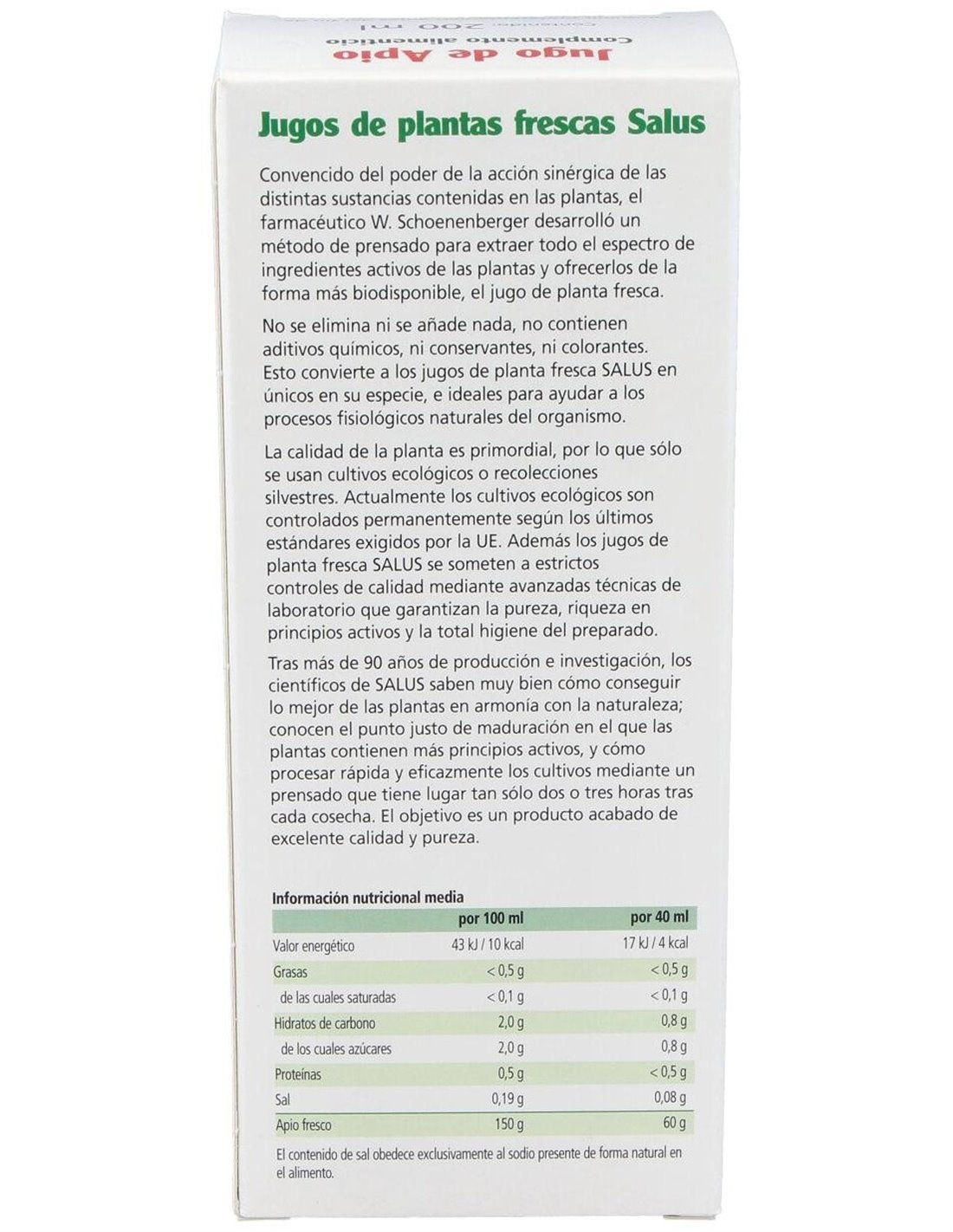 Ingredientes:Jugo natural de planta fresca de tubérculos y hojas frescas de apio de cultivo ecológico. Modo de empleo:Tomar antes de las comidas dos veces al día 20 ml de jugo natural de apio diluido en 120 ml de agua o de alguna infusión. Presentación:Frasco de 200 ml.
