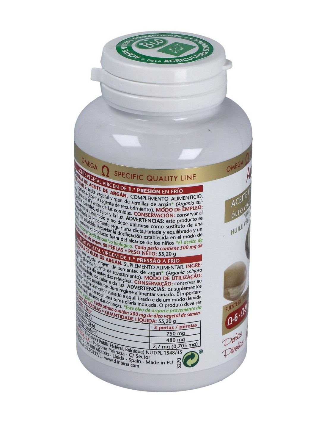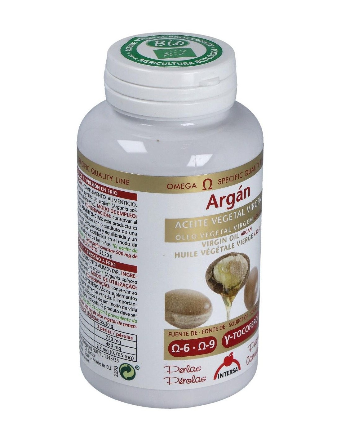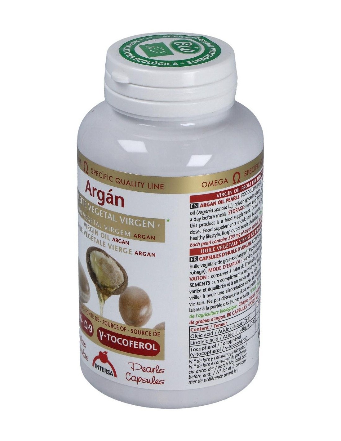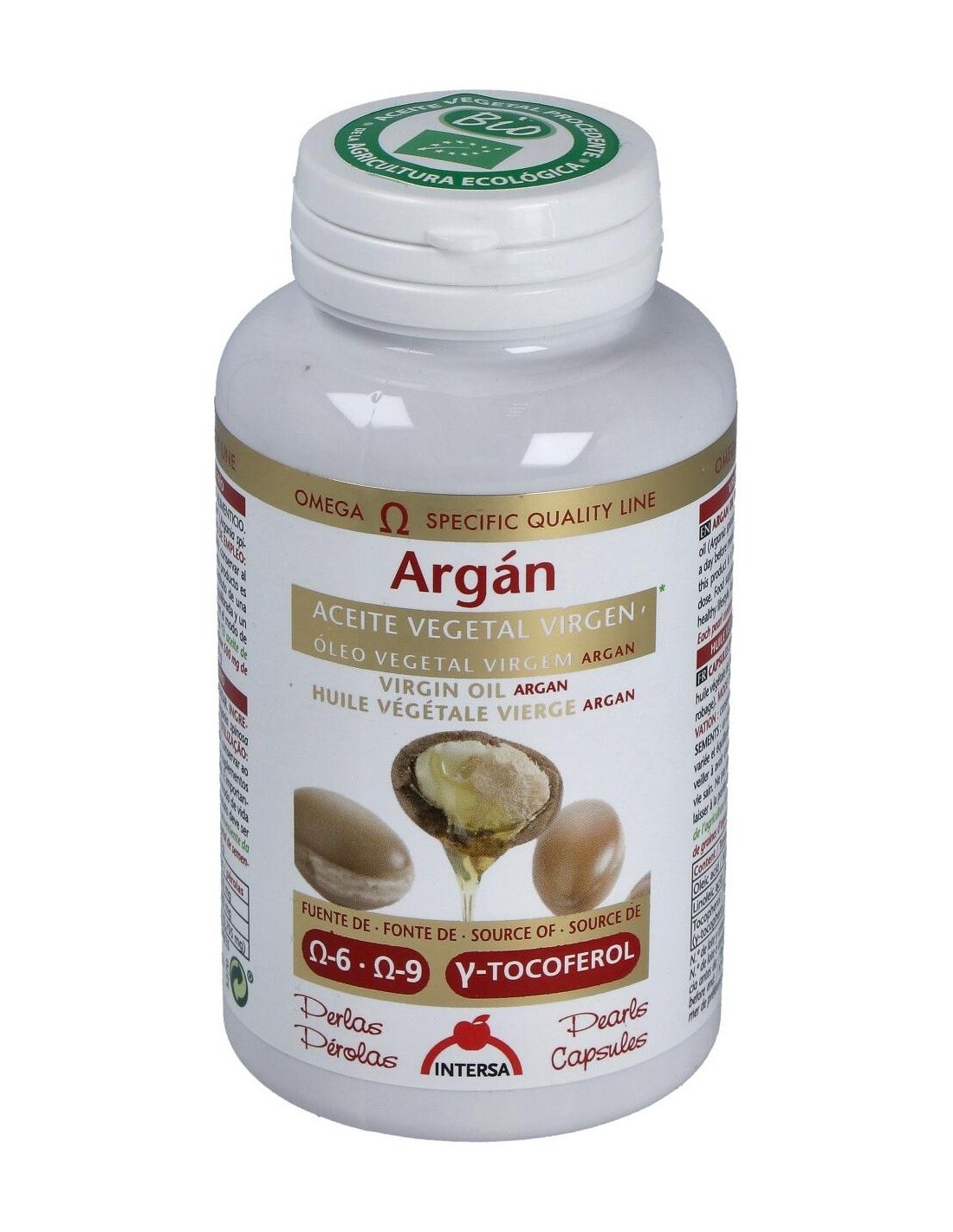 Aceite vegetal virgen de 1ª presión en frío de semillas de Argán (Argania spinosa L.) de cultivo biológico (Procedente de la agricultura ecológica). Excipientes: perlas de gelatina glicerina (envoltura de la perla).