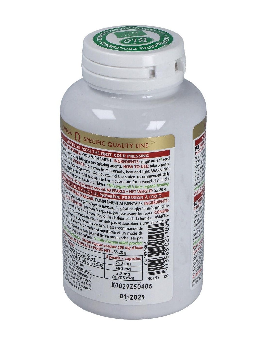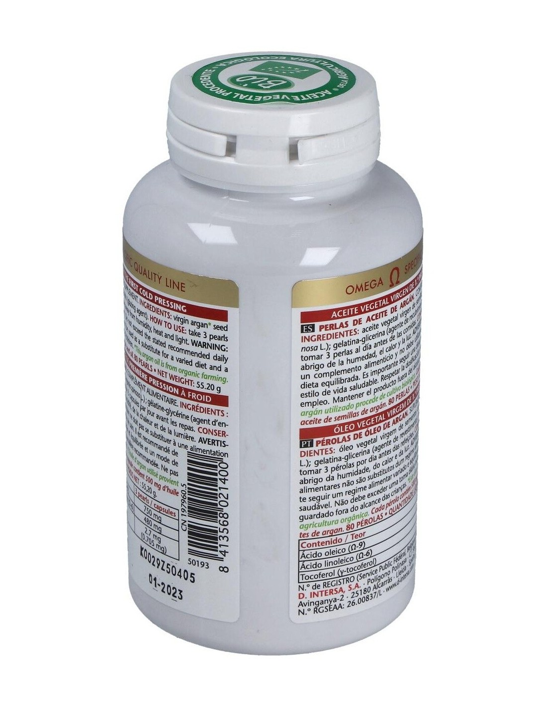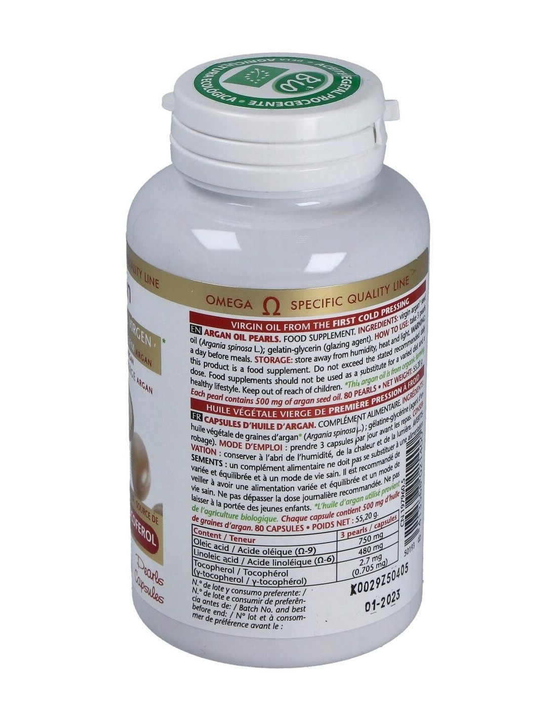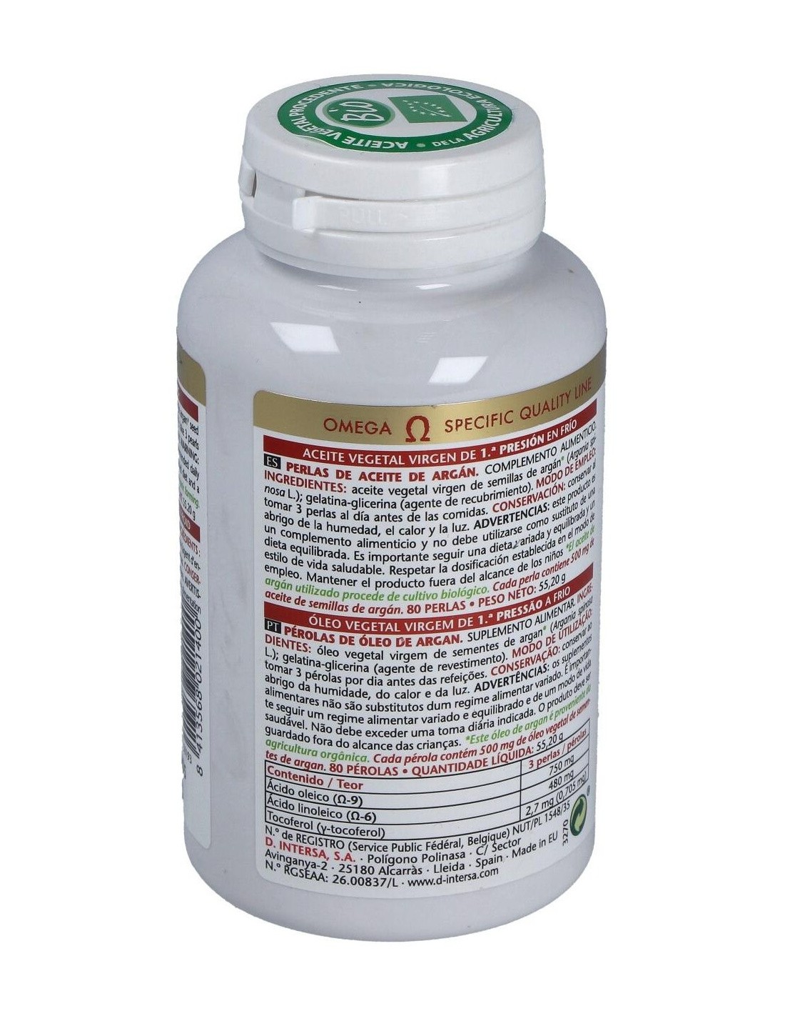 Aceite vegetal virgen de 1ª presión en frío de semillas de Argán (Argania spinosa L.) de cultivo biológico (Procedente de la agricultura ecológica). Excipientes: perlas de gelatina glicerina (envoltura de la perla).