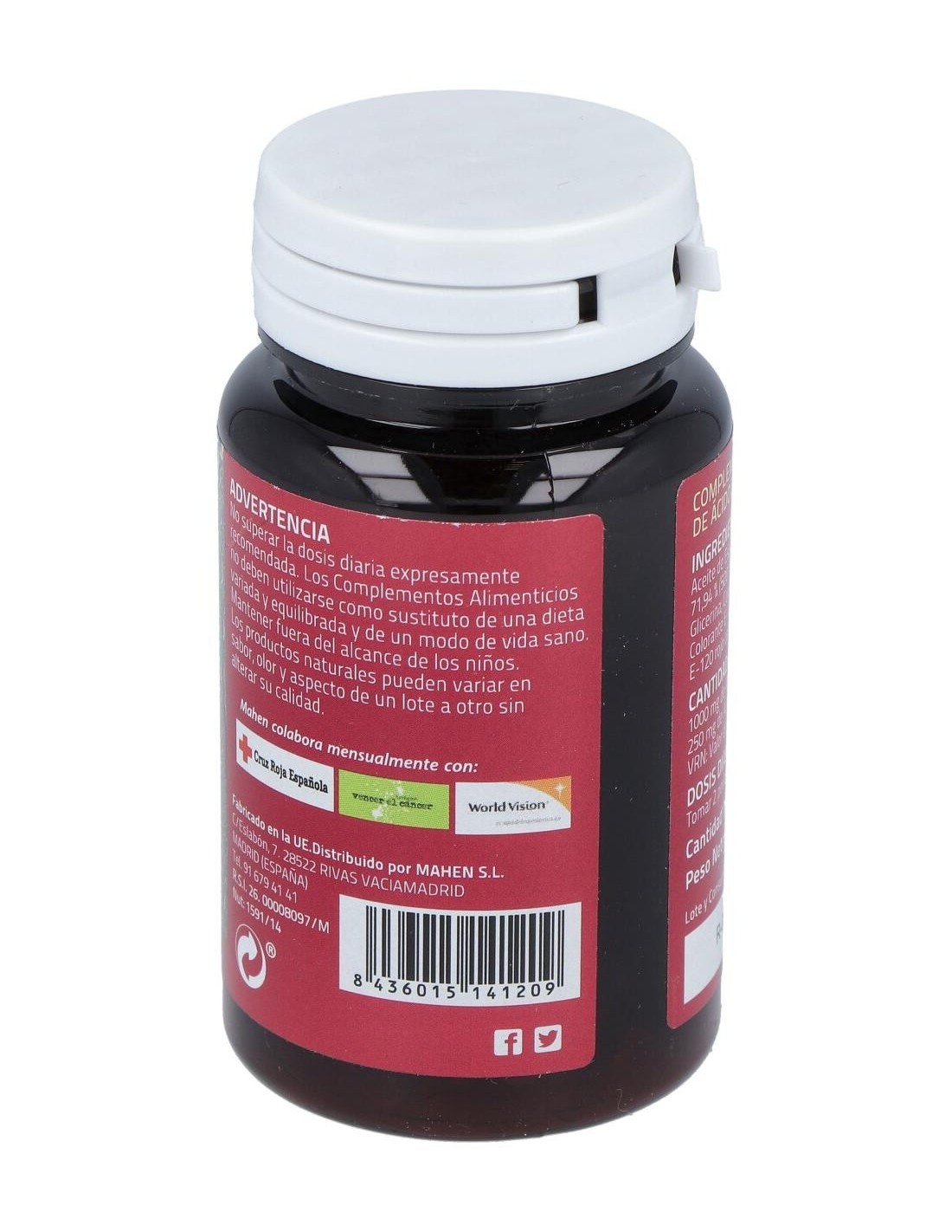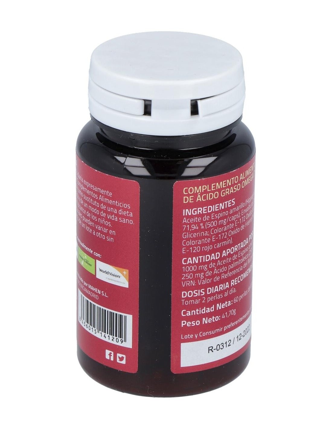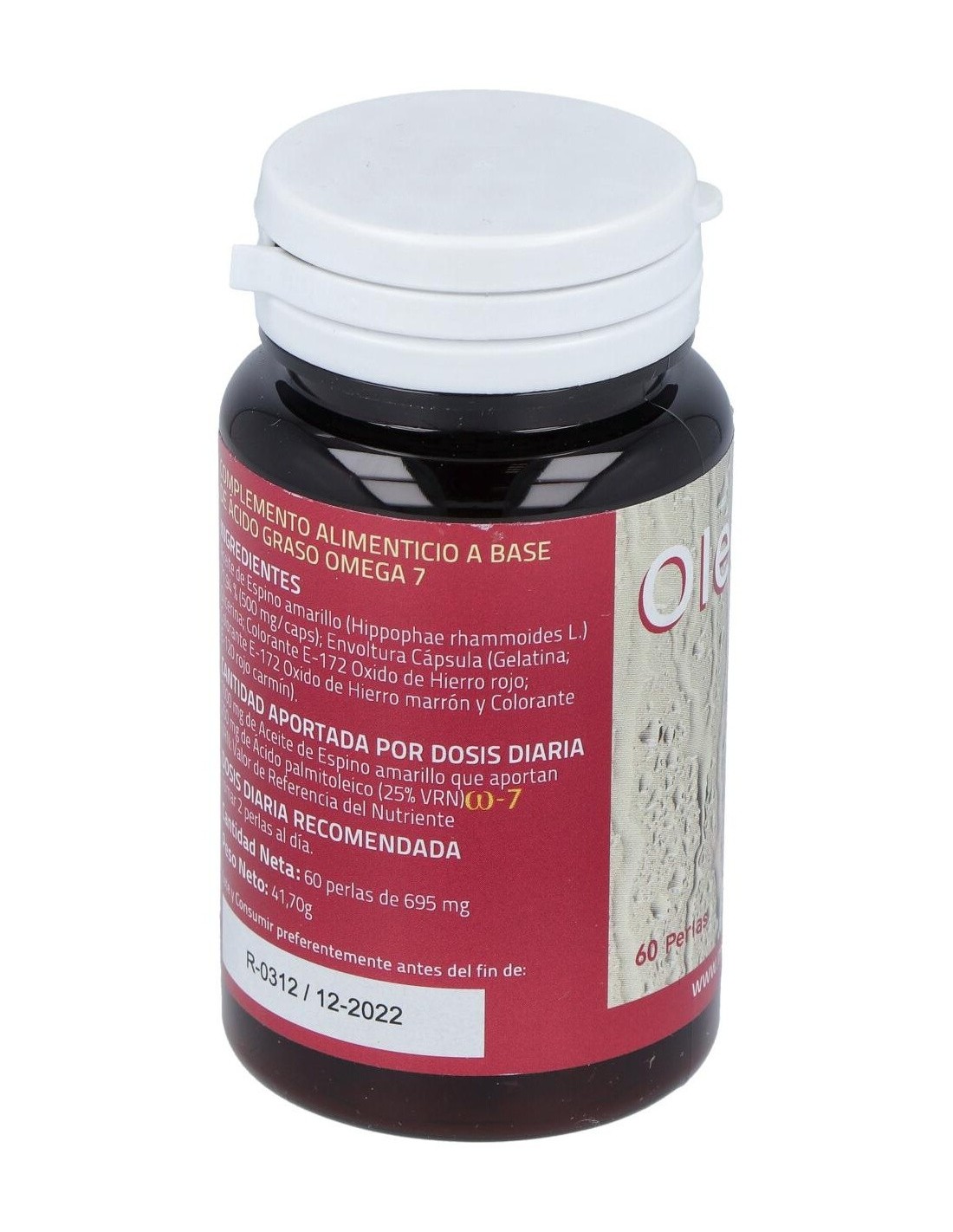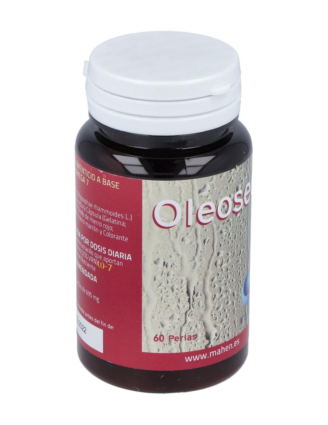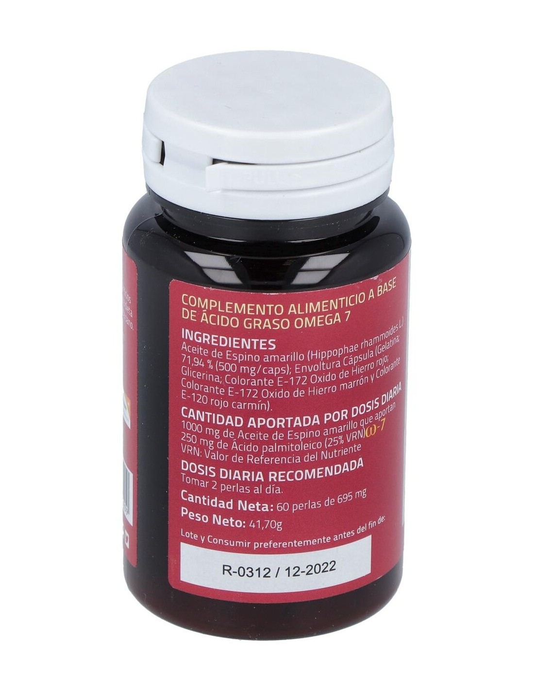 El espino amarillo es un arbusto originario de Asia y de la costa Atlántica de Europa. Crece en terrenos arenosos y a orillas del mar. El aceite que se extrae de los frutos de este arbusto, contiene cerca de un 30% de omega 7 o ácido palmitoléico que ayuda a mejorar afecciones de piel y mucosas, así como a mantener éstas nutridas e hidratadas. El omega 7 es un ácido graso esencial (no lo produce el organismo), por tanto tenemos que aportarlo con la dieta o con suplementos. Composición activa por 2 perlas:1.000 mg de aceite de espino amarillo (250 mg de omega 7).Ingredientes:Aceite de espino amarillo (hippophae rhammoides L.) (500 mg/caps); envoltura cápsula (gelatina; glicerina; colorante óxido de hierro rojo; colorante óxido de hierro marrón y colorante: ácido carmínico). Modo de empleo:Tomar 2 perlas al día. Presentación:Envase de 60 perlas.