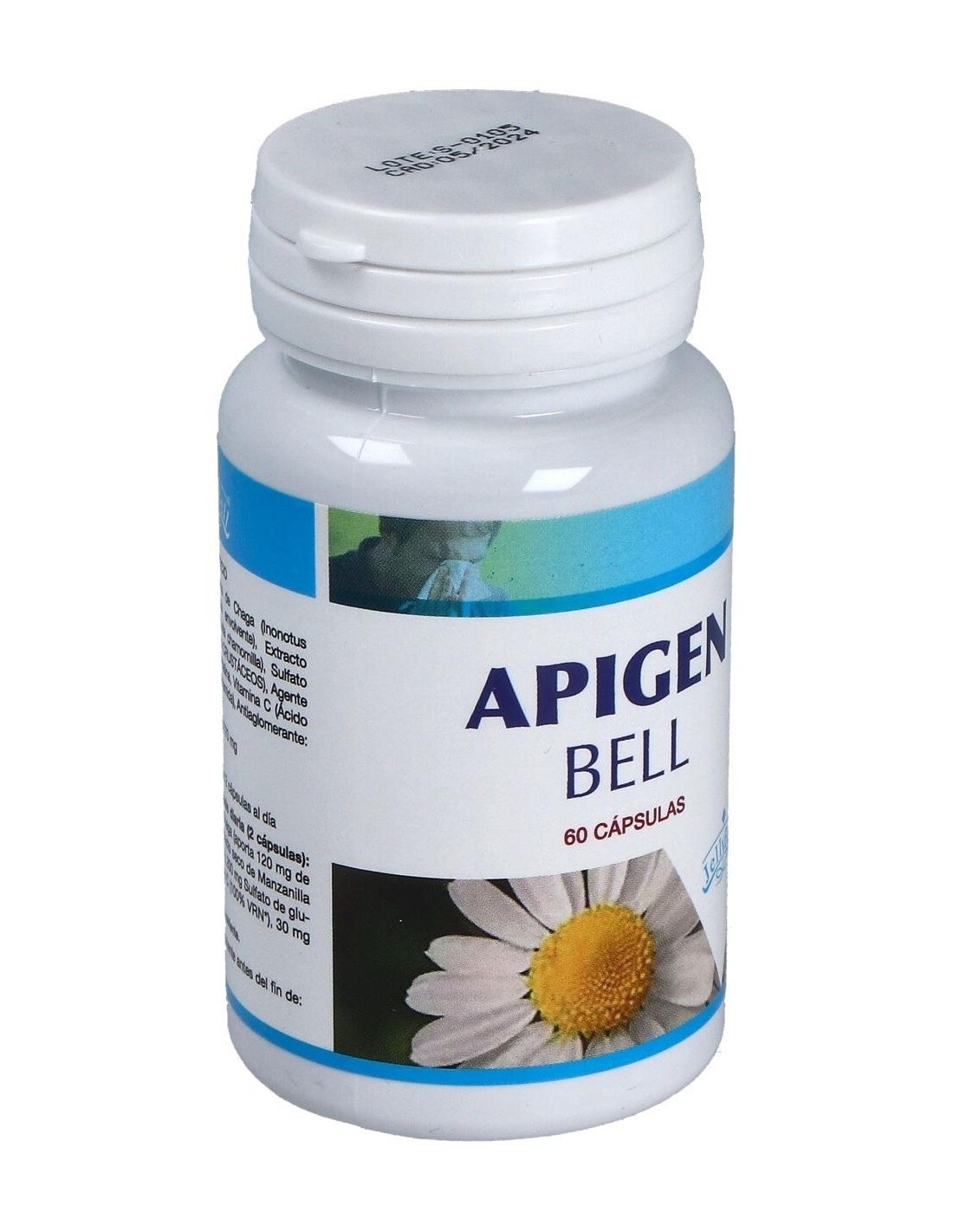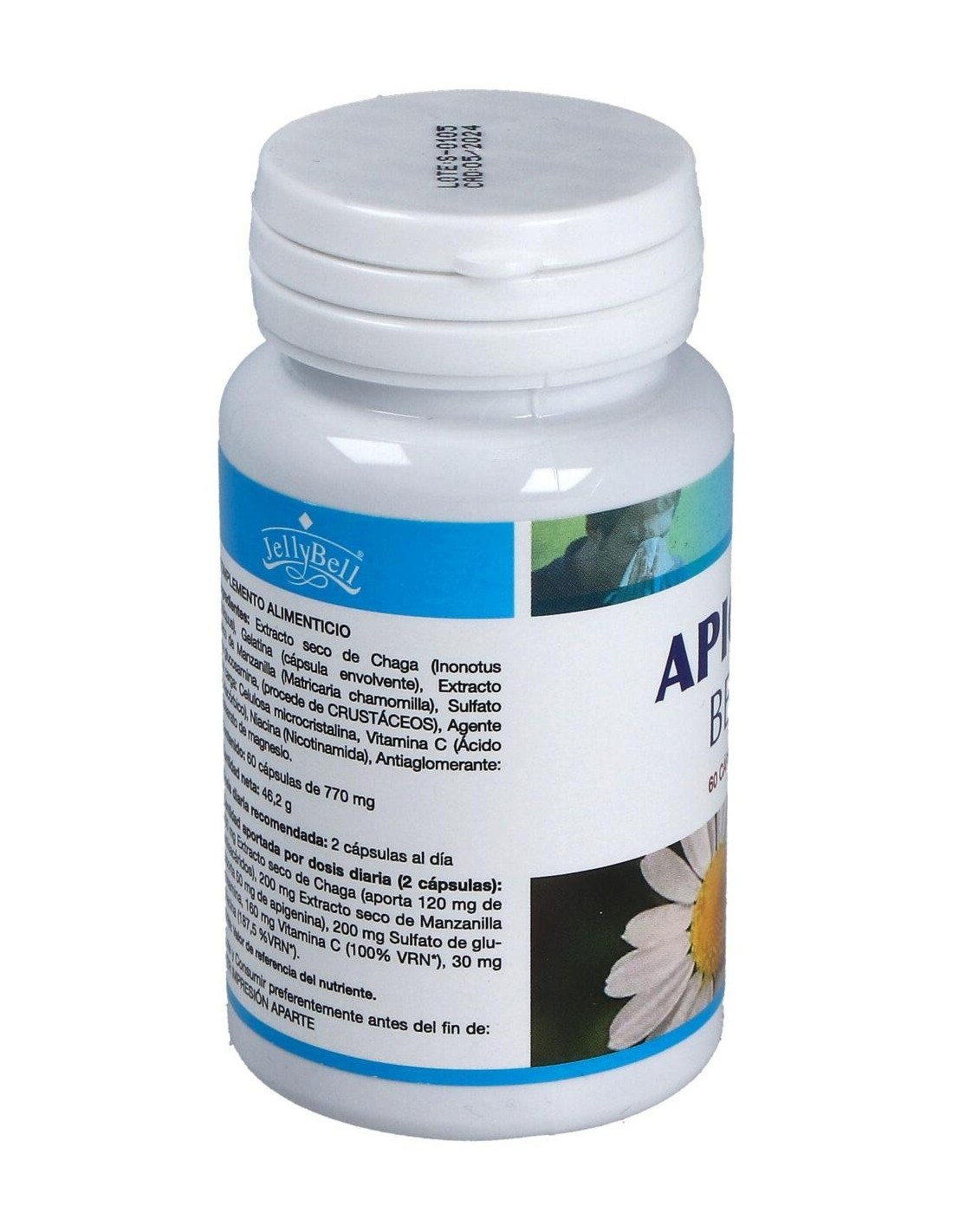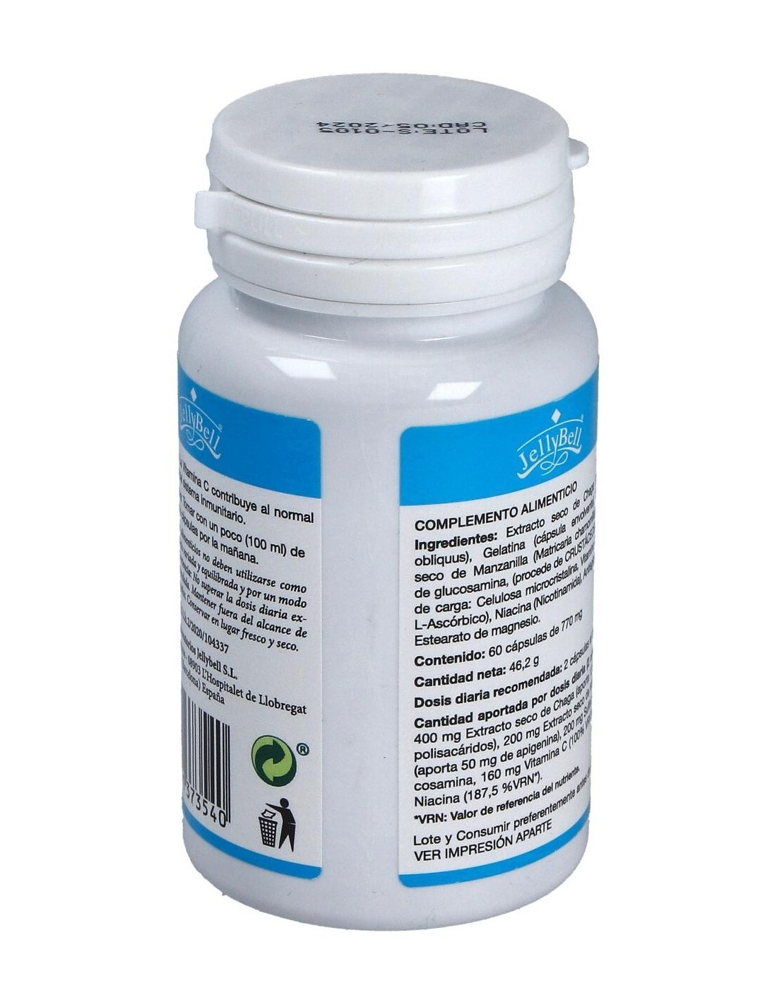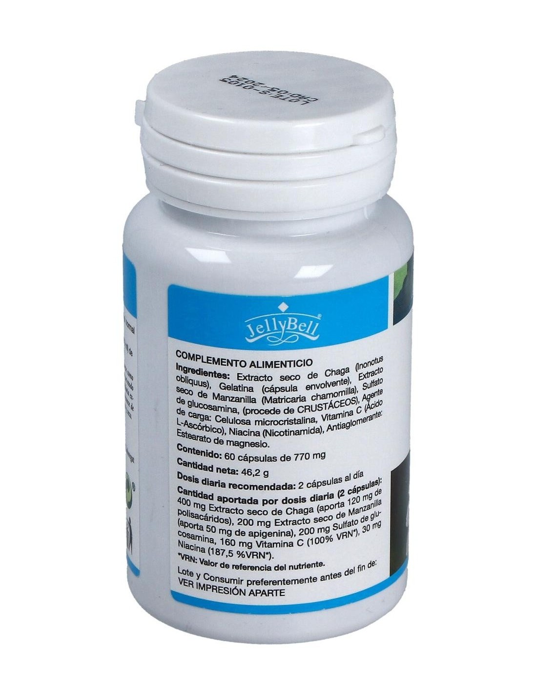 Extracto seco de Chaga (Inonotus obliquus), Gelatina (cápsula envolvente), Extracto seco de Manzanilla (Matricaria chamomilla), Sulfato de glucosamina (procede de crustáceos), Agente de carga: Celulosa microcristalina, Vitamina C (Ácido L-Ascórbico), Niacina (Nicotinamida), Antiaglomerante: Estearato de magnesio. Por 2 cápsulas: 400 mg Extracto seco de Chaga (aporta 120 mg de polisacáridos) 200 mg Extracto seco de Manzanilla (aporta 50 mg de apigenina) 200 mg Sulfato de glucosamina 160 mg Vitamina C 30 mg Niacina.