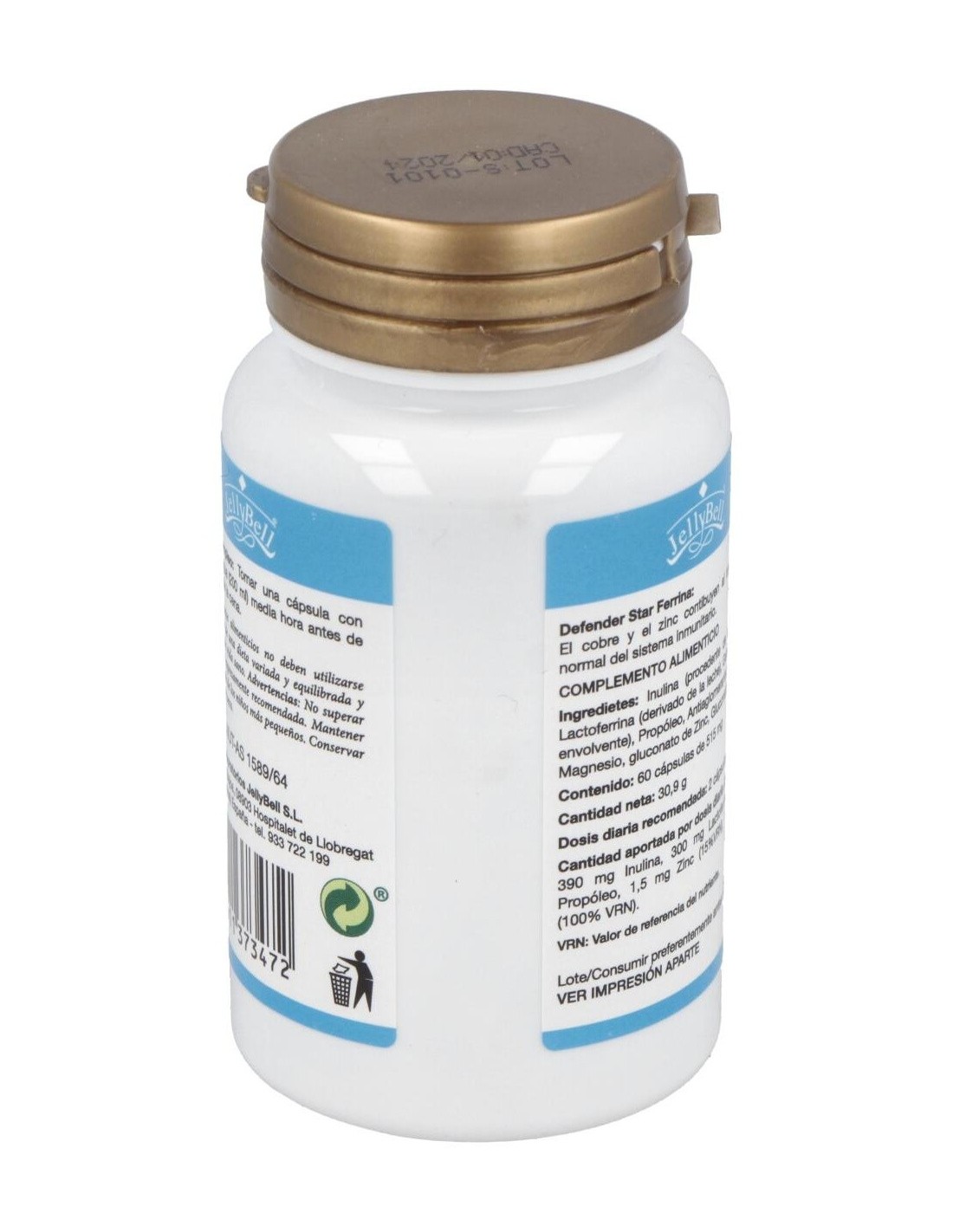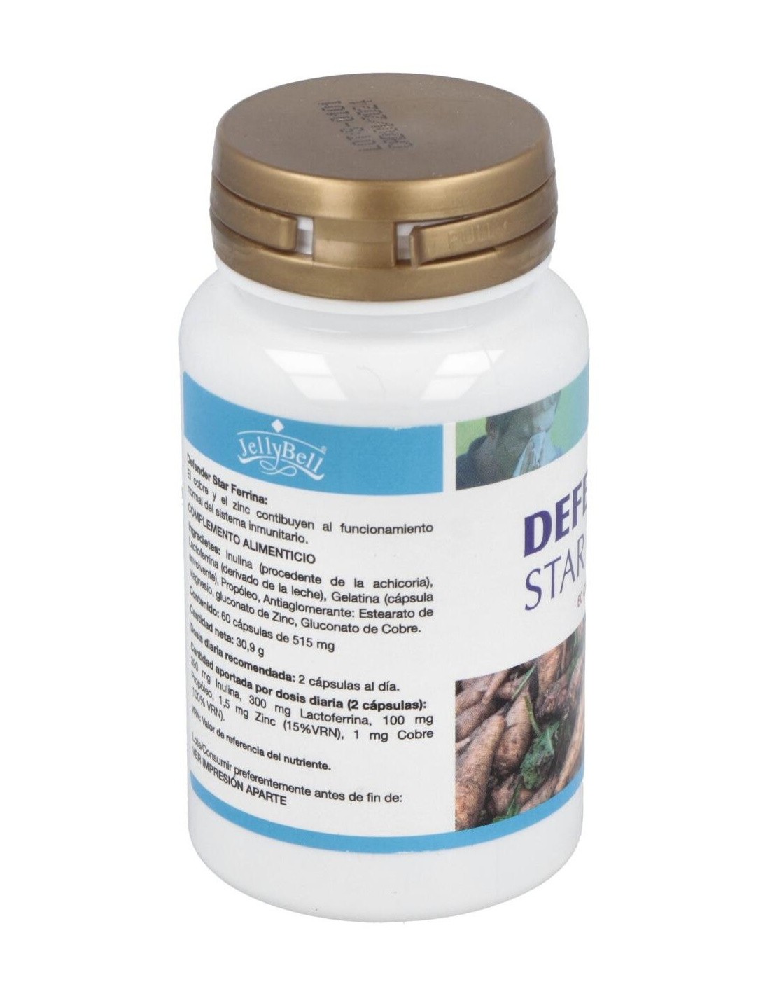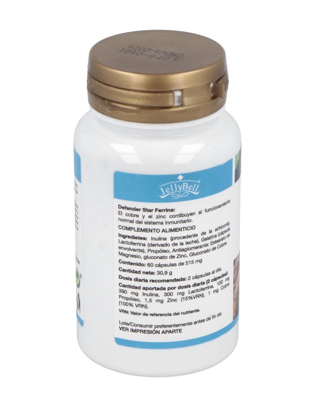 Ingredientes:Inulina (procedente de achicoria), Lactoferrina (producto derivado de la leche), Gelatina (cápsula envolvente), Propóleo, Antiaglomerante: Estearato de magnesio, Gluconato de zinc, Gluconato de cobre.Modo de empleo:Tomar 1 cápsula media hora antes de la comida y de la cena.Presentación:Bote de 60 cápsulas.