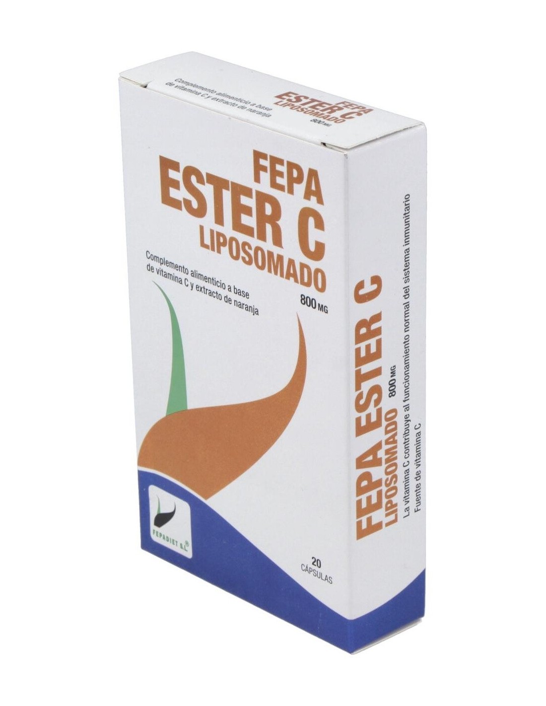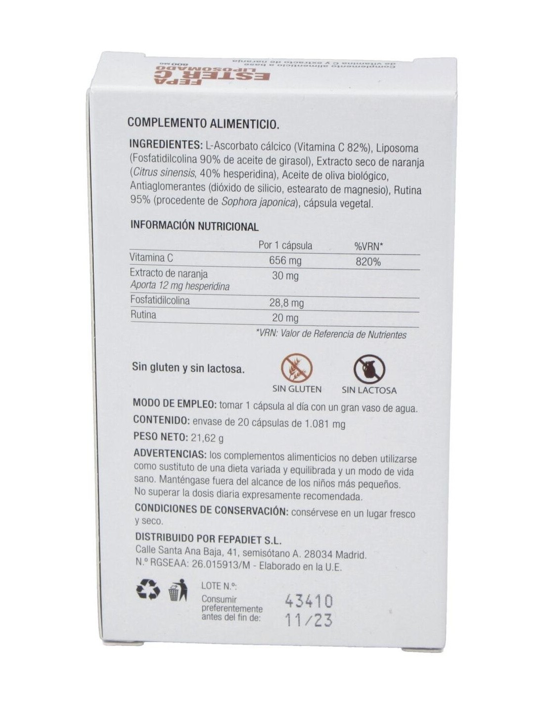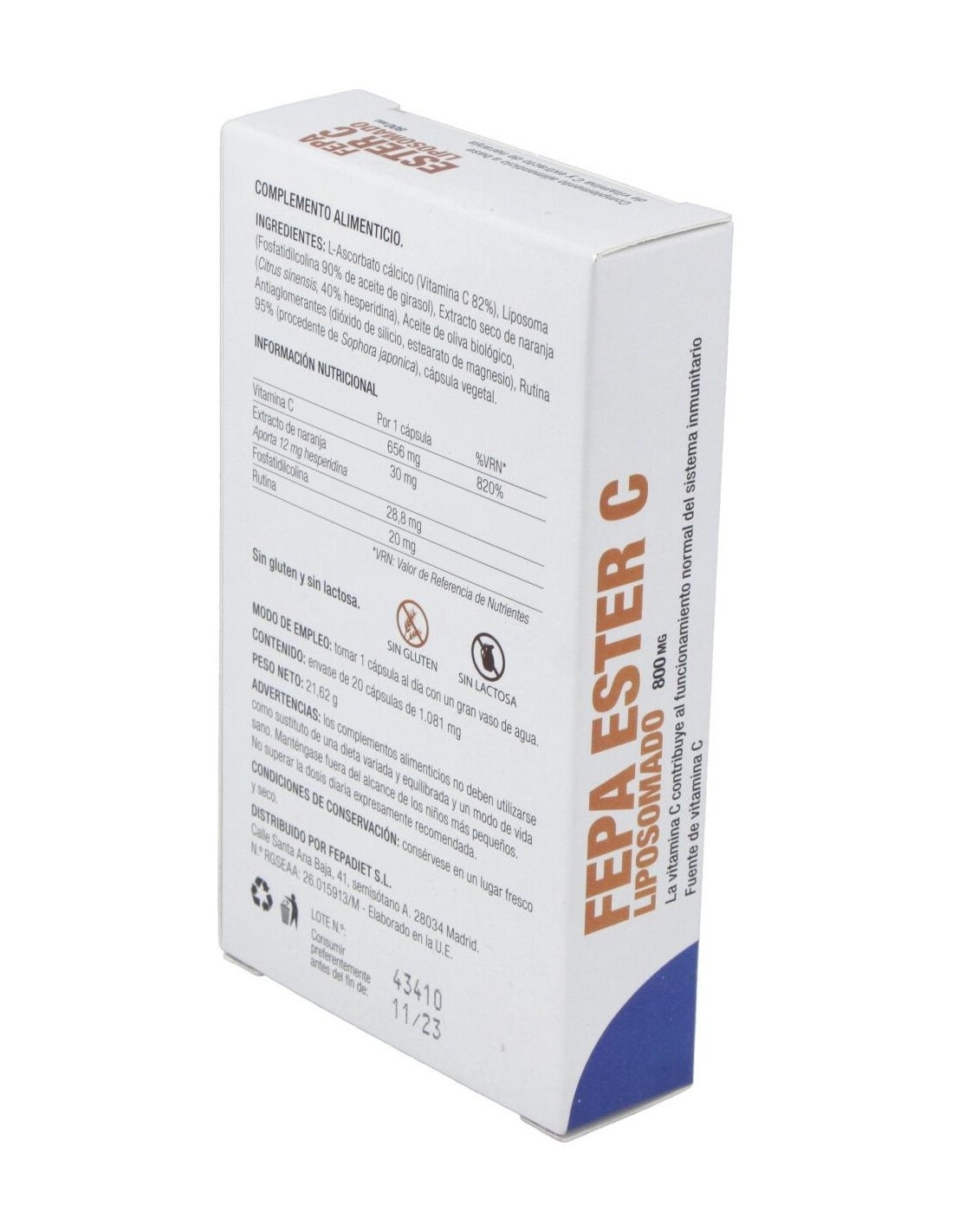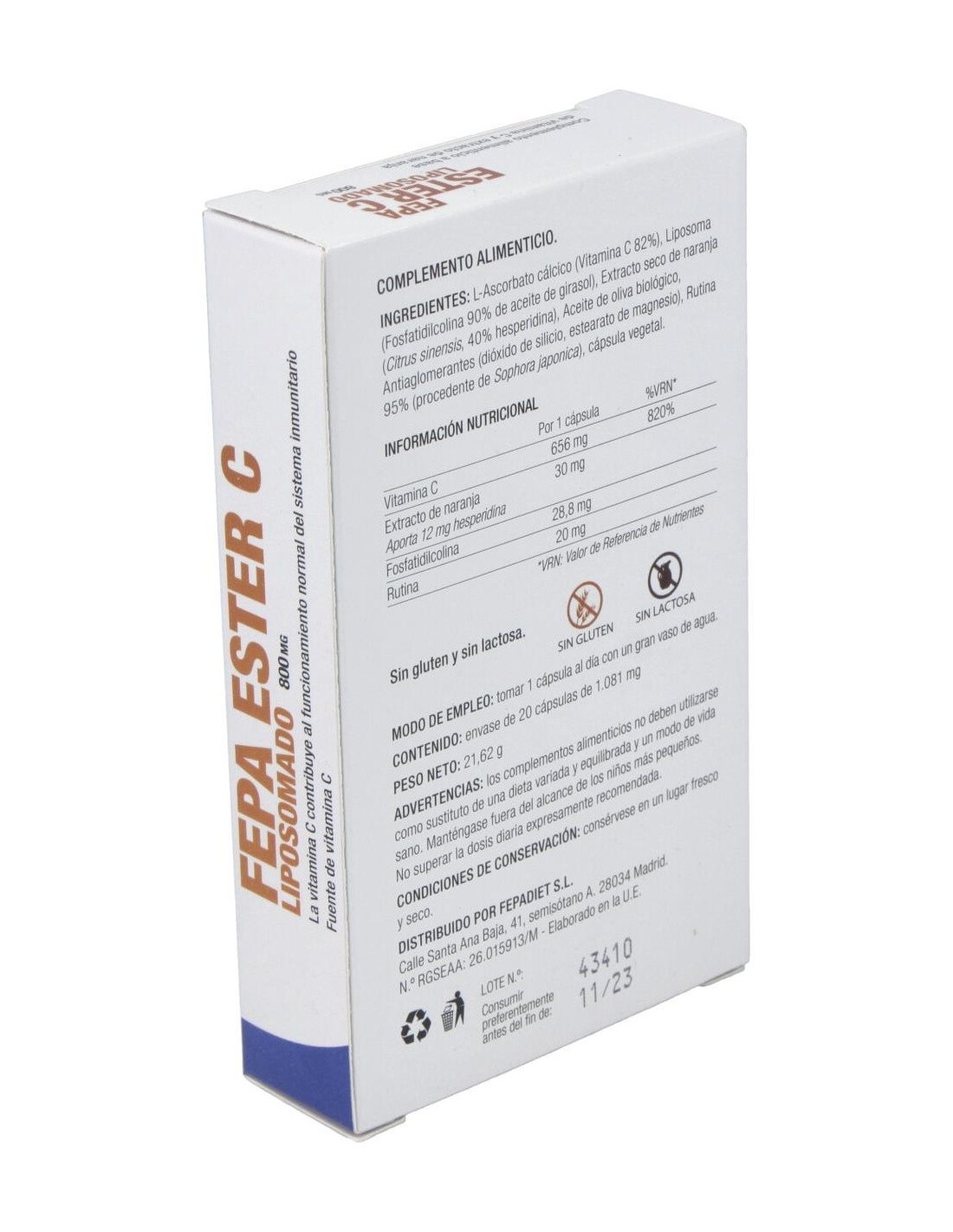 800 mg de ascorbato de calcio, 30 mg citrus sinensis estandarizado al 40% de hesperidina 12,5 mg, liposoma 100 mg, rutina 20 mg, estearato de magnesio 20 mg y siliceo 32 mg.