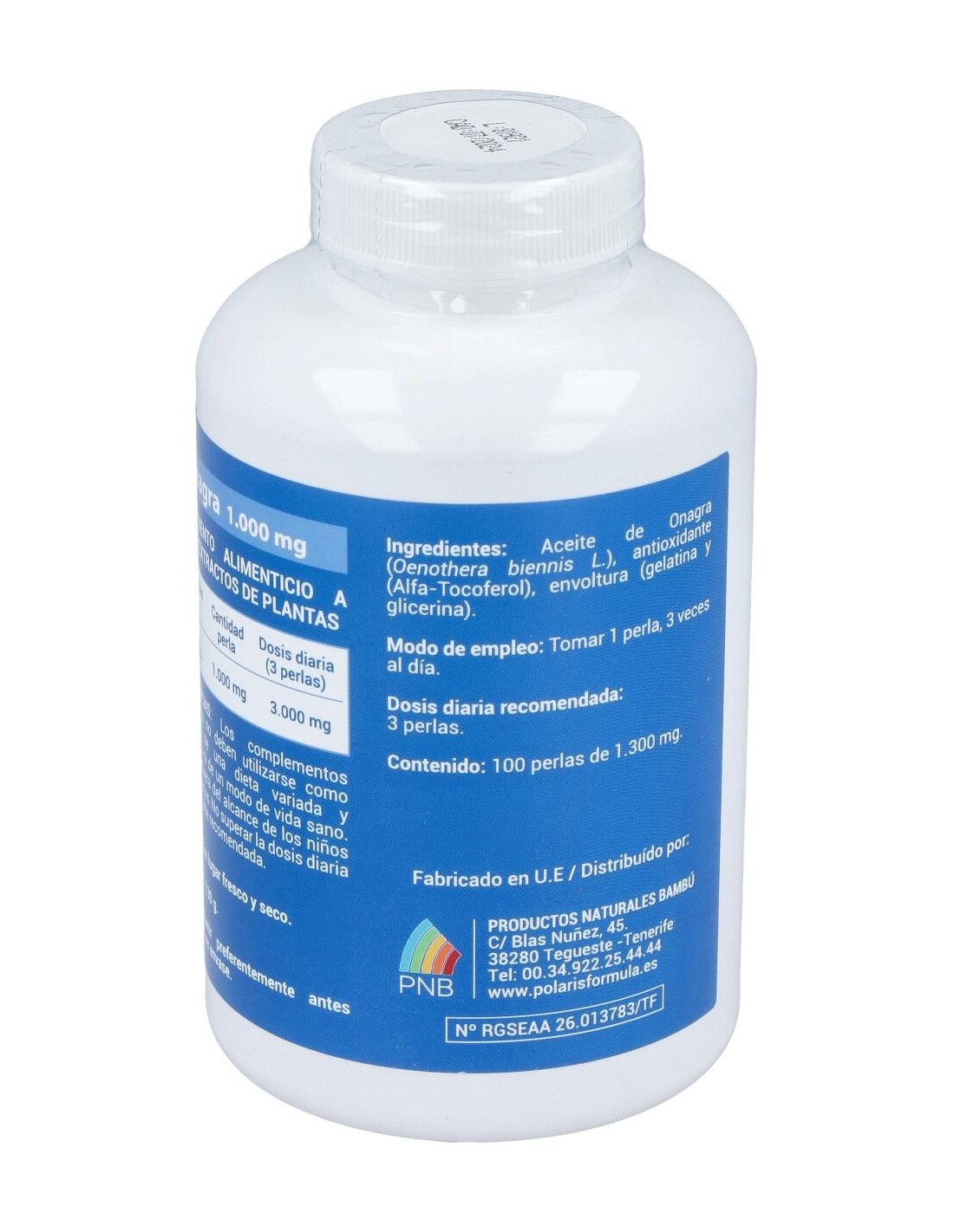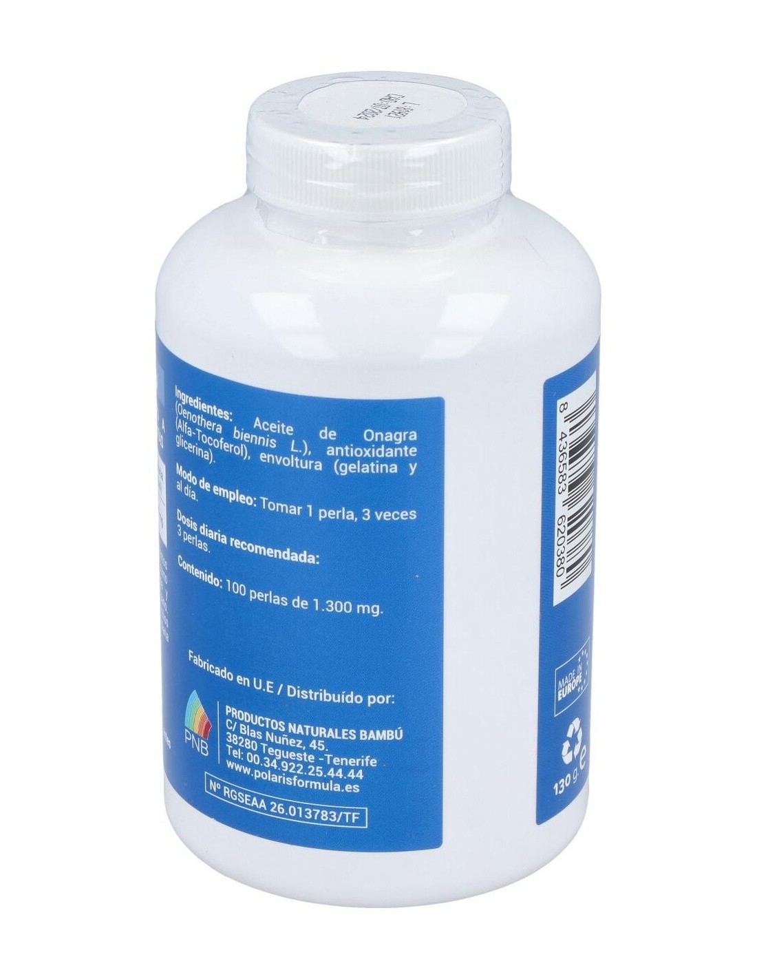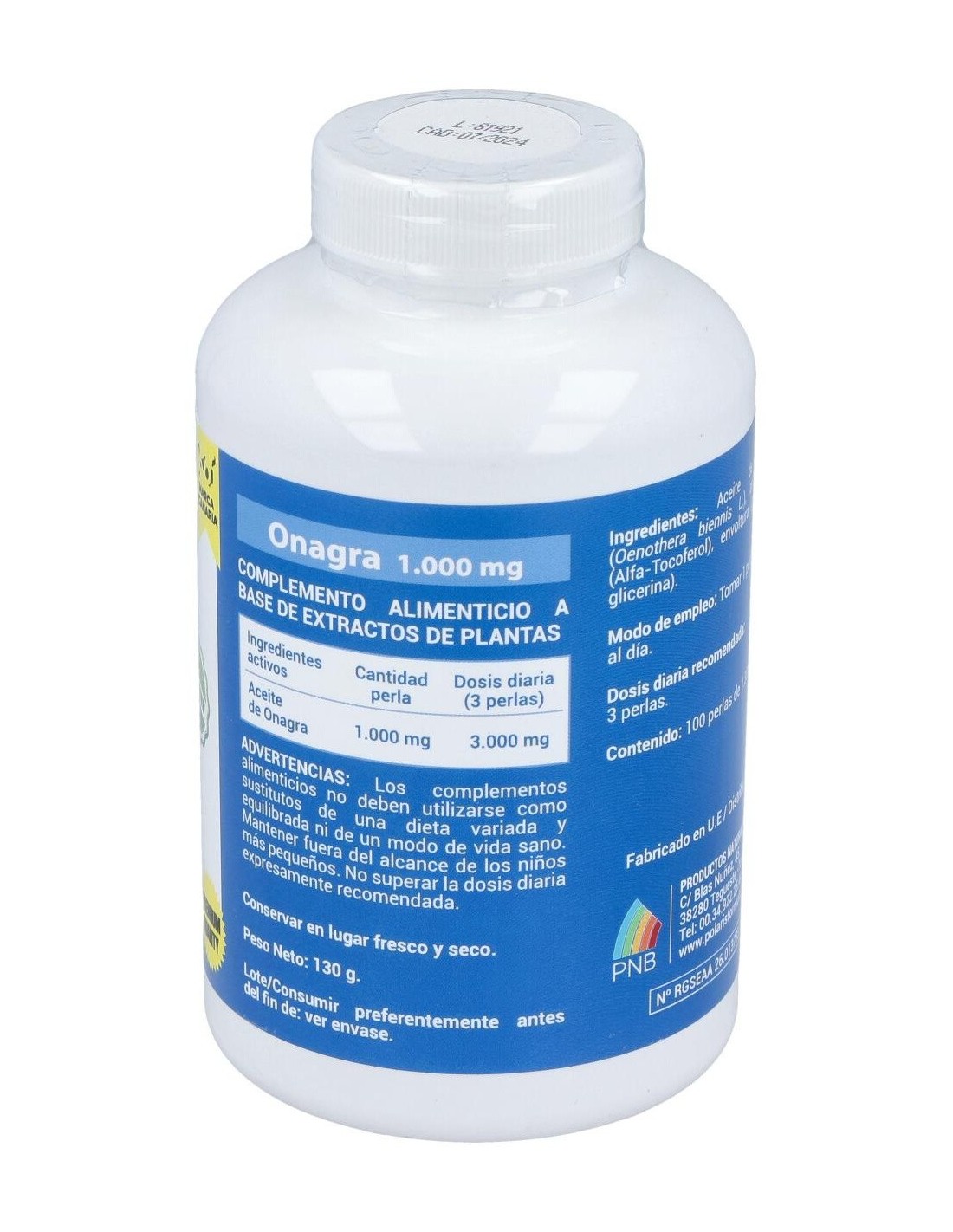 Composición activa por perla:1.000 mg de aceite de onagra.Ingredientes:Aceite de onagra (Oenothera biennis L.), antioxidante (alfa-tocoferol), envoltura (gelatina, glicerina).Modo de empleo:Tomar 1 perla, 3 veces al día.Presentación:Envase de 100 perlas.Recomendaciones y advertencias:No contiene gluten, lactosa ni huevo. No GMO.