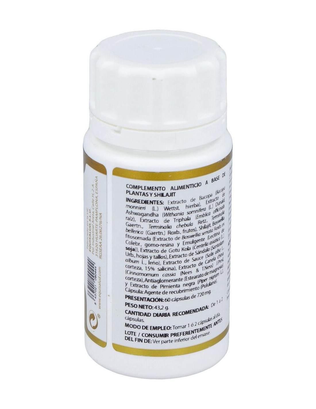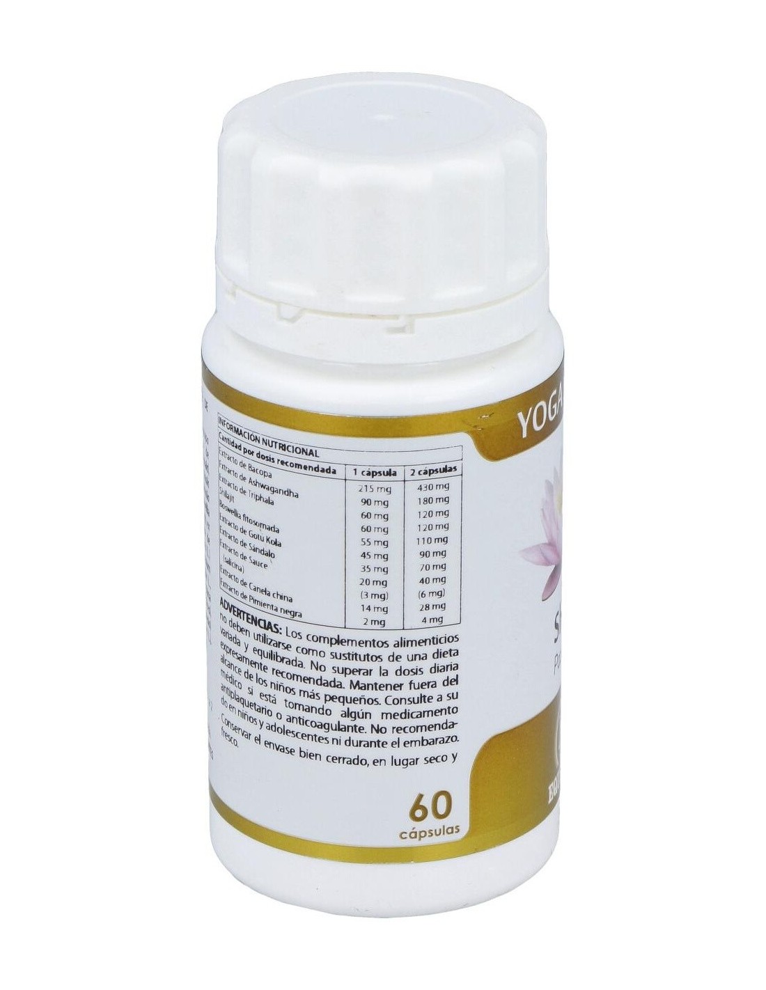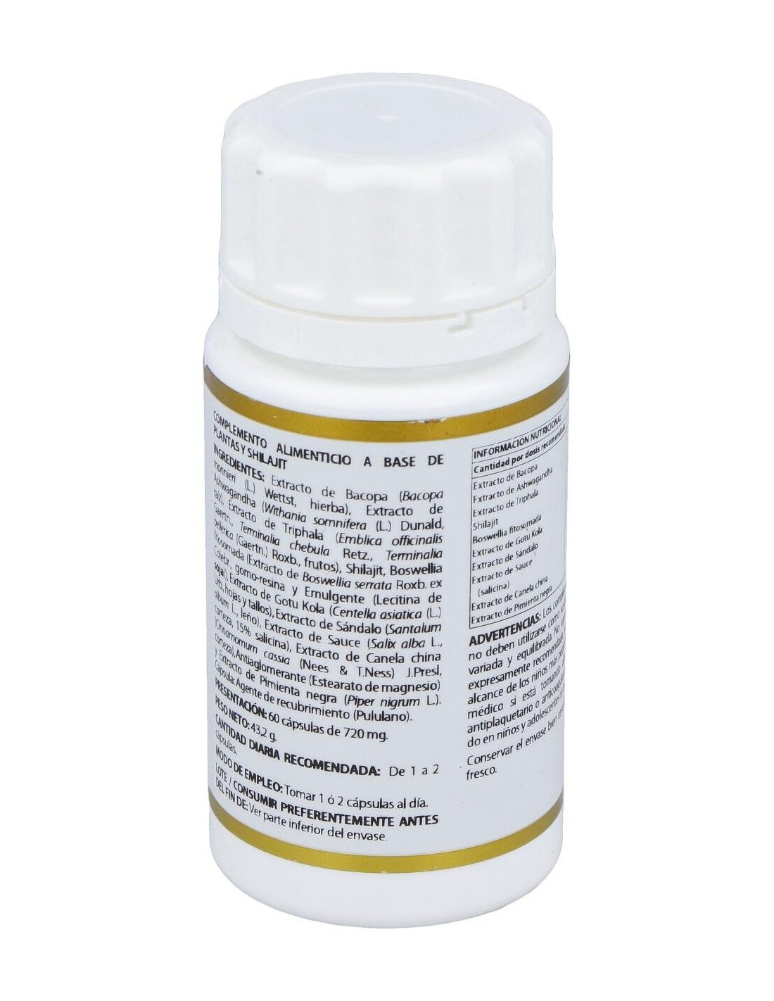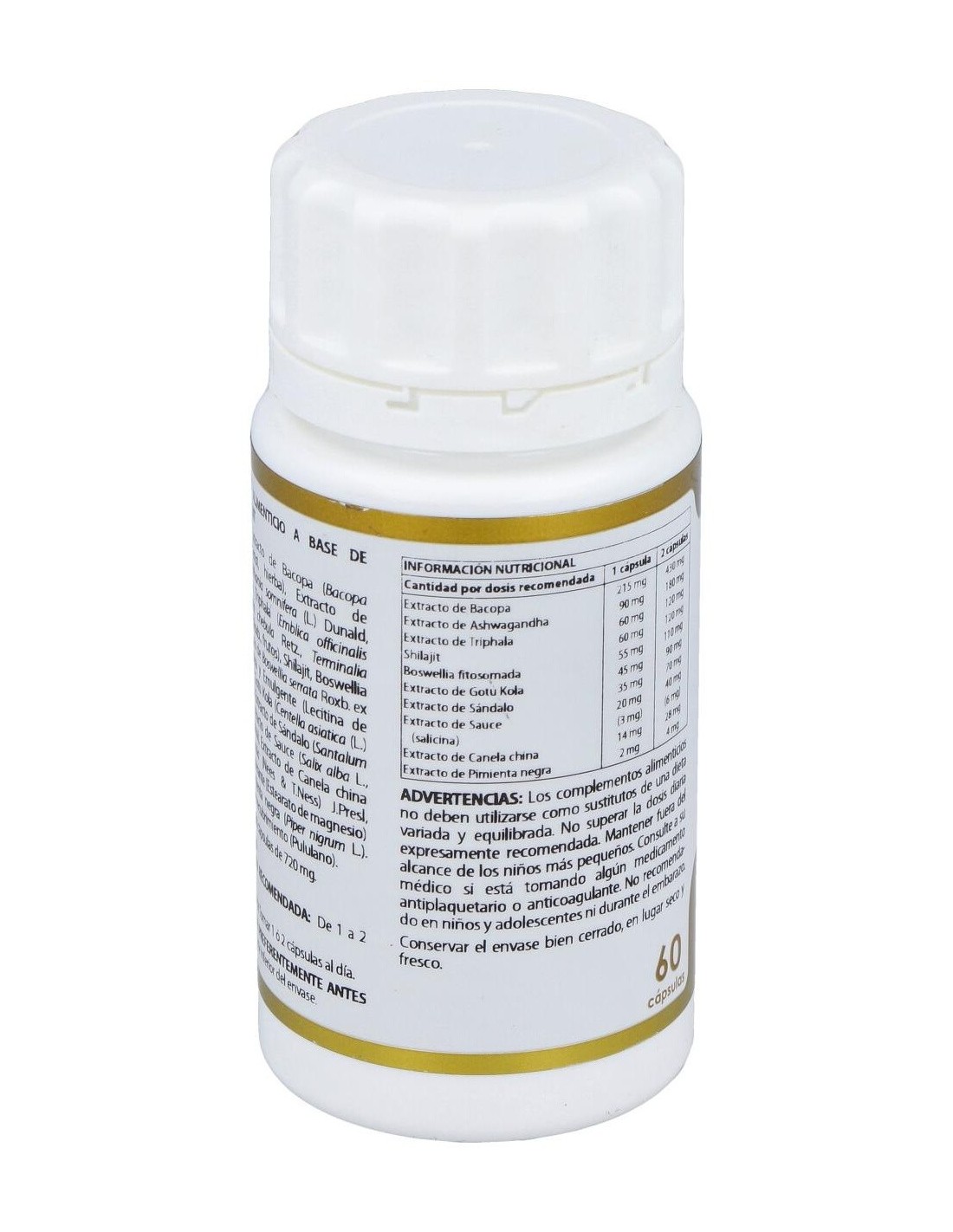 Bacopa extracto seco (Bacopa monnieri (L.) Wettst, hierba, 20% bacósidos, ratio 10:1), 215 mg: ashwagandha (Withania somnifera (L.) Dunal, raíz, 1,5% witanólidos, ratio 5:1), 90 mg: triphala extracto seco ((Emblica officinalis Gaertn., Terminalia chebula Retz., Terminalia bellerica (Gaertn.) Roxb., frutos, 30% taninos, ratio 20:1), 60 mg: PrimaVie® (shilajit purificado, 50% ácidos fúlvicos, >10,3% dibenzo-a-pironas más dibenzo-a-pironas cromoproteínas), 60 mg: Casperome® (boswellia fitosomada (Boswellia serrata Roxb. ex Colebr., gomo-resina, lecitinas de soja), 25% ácidos triterpénicos totales, 10% ácido ß-boswélico, ratio 3-9:1), 55 mg: gotu kola extracto seco (Centella asiatica (L.) Urb., hojas y tallos, 30% triterpenos totales, 10% asiaticósidos, ratio 9-10:1), 45 mg: sándalo extracto seco (Santalum album L., leño, ratio 4:1), 35 mg: sauce extracto seco (Salix alba L., corteza, 15% salicina, ratio 6-8:1), 20 mg: canela china extracto seco (Cinnamomum cassia (Nees & T. Nees) J. Presl., corteza, ratio 4:1), 14 mg: pimienta negra (Piper nigrum L., fruto, 95% piperina, raio 25:1), 2 mg. Excipiente tecnológico: estearato de magnesio (antiaglomerante), c.s. Envoltura: polisacárido de origen vegetal (pululano).