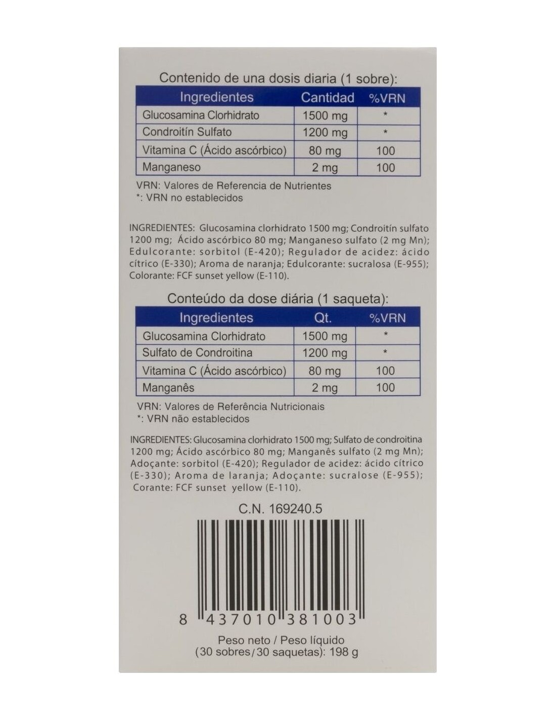 Por 1 sobre:\ 1500 mg Glucosamina Clorhidrato\ 1200 mg Condroitín Sulfato\ 80 mg Vitamina C\ 2 mg Manganeso\ Edulcorantes.