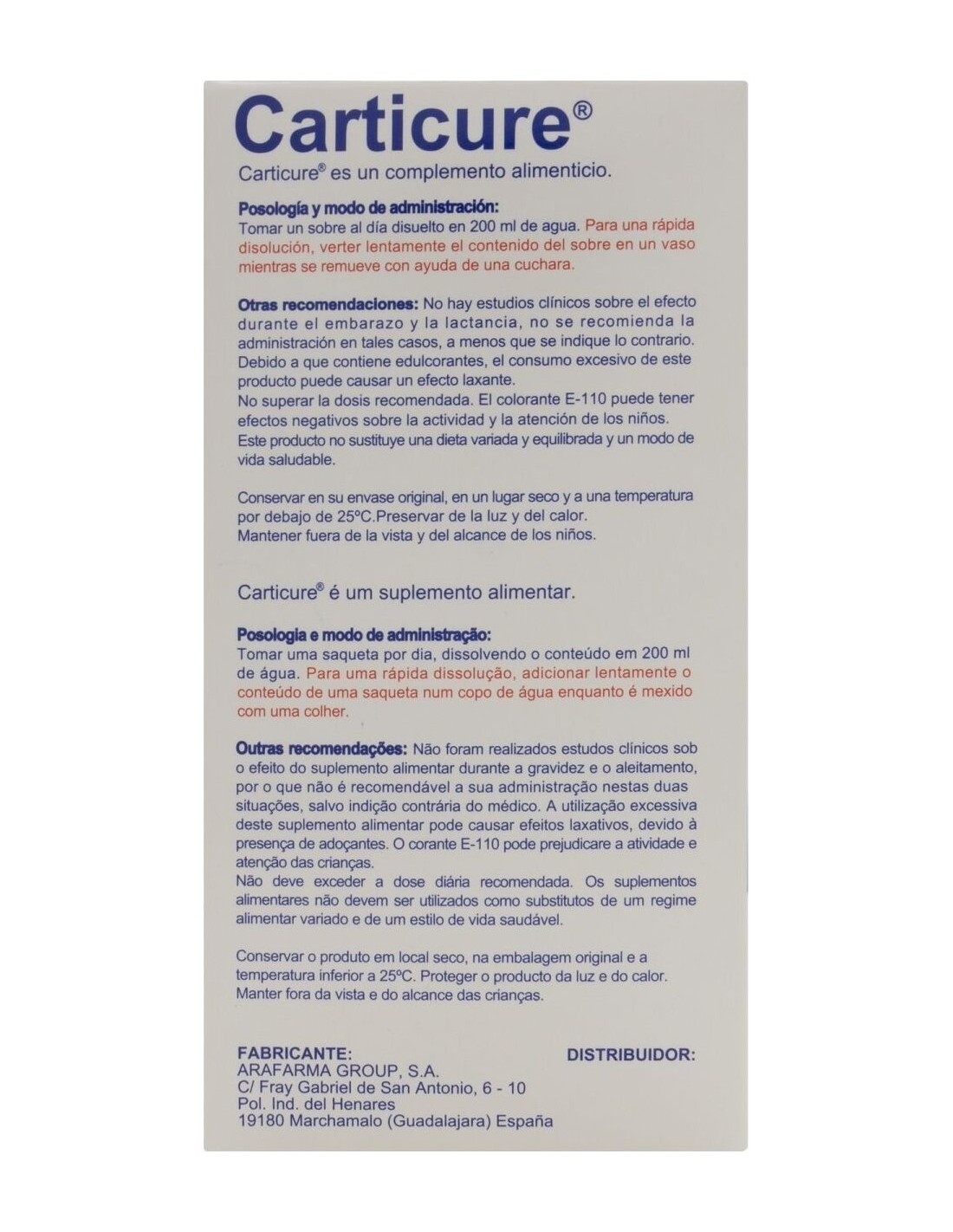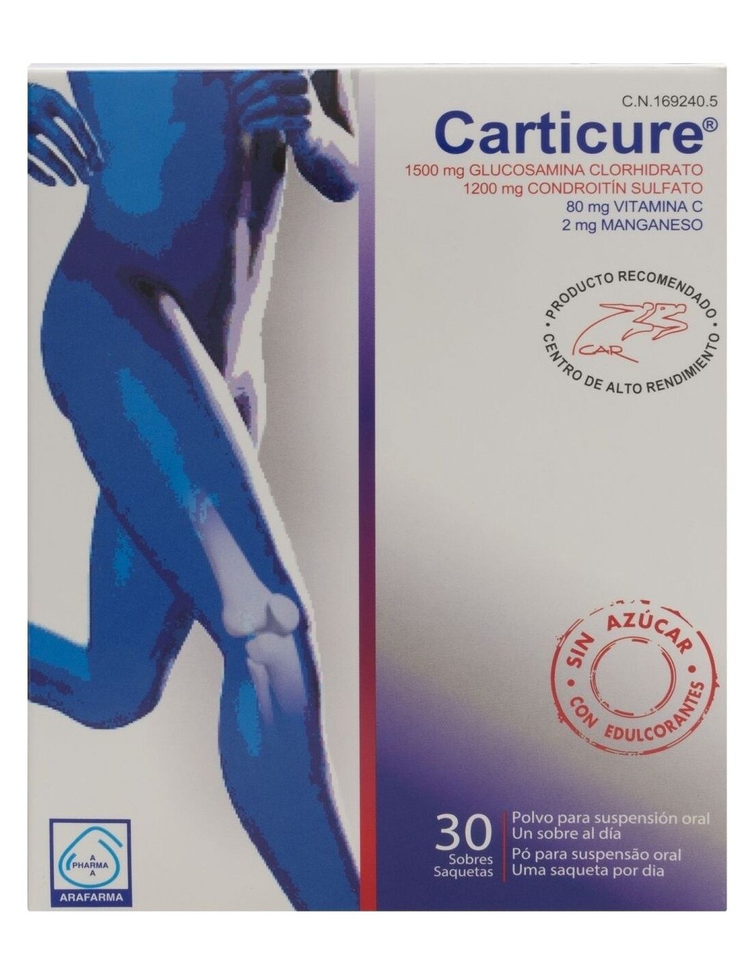 Combina glucosamina y condroitín sulfato, componentes naturales del cartílago. Además, contiene vitamina C y manganeso, en las cantidades diarias recomendadas para ayudar a la normal formación del colágeno y a la protección articular frente al estrés oxidativo.\ \ Carticure solución oral es un producto de la marca Arafarma que viene en presentación de 30 sobres. Cada sobre contiene una fórmula única y exclusiva que combina ingredientes de origen natural para el mantenimiento normal de las articulaciones.\ La fórmula de Carticure solución oral contiene ingredientes naturales que son beneficiosos para el desempeño de las articulaciones en condiciones normales. Entre estos ingredientes se encuentran:\ Colágeno hidrolizado tipo II: Este ingrediente ayuda a mantener la elasticidad de los tejidos conectivos, especialmente en las articulaciones. \ Ácido hialurónico: El ácido hialurónico es un componente natural de los tejidos conectivos y es importante para mantener las articulaciones en condiciones normales. Este ingrediente puede ser útil para mantener la hidratación y la lubricación de las articulaciones.\ Vitamina C: La vitamina C es un antioxidante que ayuda a proteger las células de los daños causados por los radicales libres. Además, la vitamina C es importante para \ dar apoyo a la síntesis del colágeno, que es un componente importante de los tejidos conectivos.\ Manganeso: El manganeso es un mineral importante para la formación de los tejidos conectivos y para la producción de energía en el cuerpo. Ell manganeso es importante para mantener los huesos y articulaciones en condiciones normales.