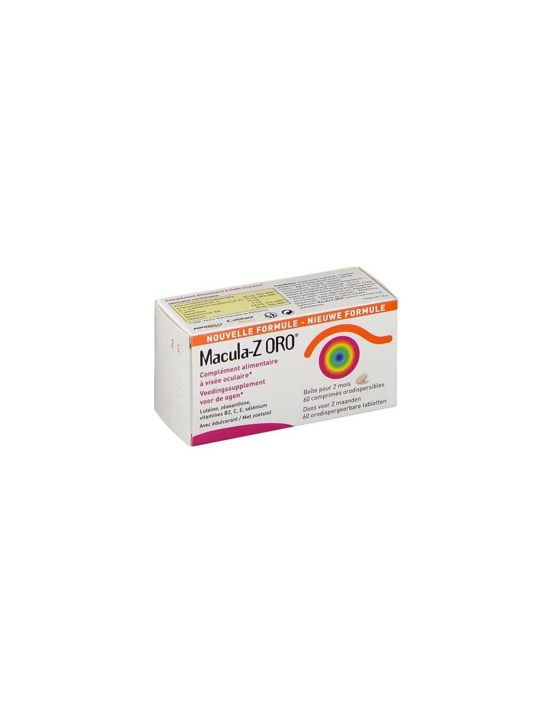 Macula-Z ORO® es un complemento alimenticio cuya composición permite un aporte razonable de antioxidantes. La vitamina B2 contribuye al mantenimiento de una visión normal. La luteína es uno de los componentes de la retina y del cristalino. La luteína y la zeaxantina son dos pigmentos amarillos de la familia de los carotenoides esenciales, ya que no son sintetizados por el organismo humano. El selenio contribuye a proteger a las células frente al daño oxidativo. Macula-Z ORO® se presenta en forma de comprimido bucodispersable. Se disgrega en pocos segundos dentro de la boca, eliminando de este modo cualquier riesgo de vía equivocada. La toma de Macula-Z ORO® facilita la ingesta, en particular a las personas que tienen dificultades para deglutir o que padecen disfagia.