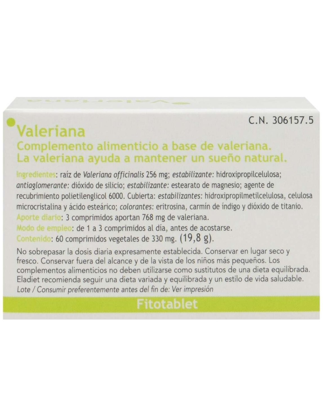 Valeriana (raíz) 300 mg y celulosa vegetal. Cubierta: hidroxipropilmetilcelulosa, celulosa microcristalina, ácido esteárico. Colorantes: E-127, E-132 y E-171.