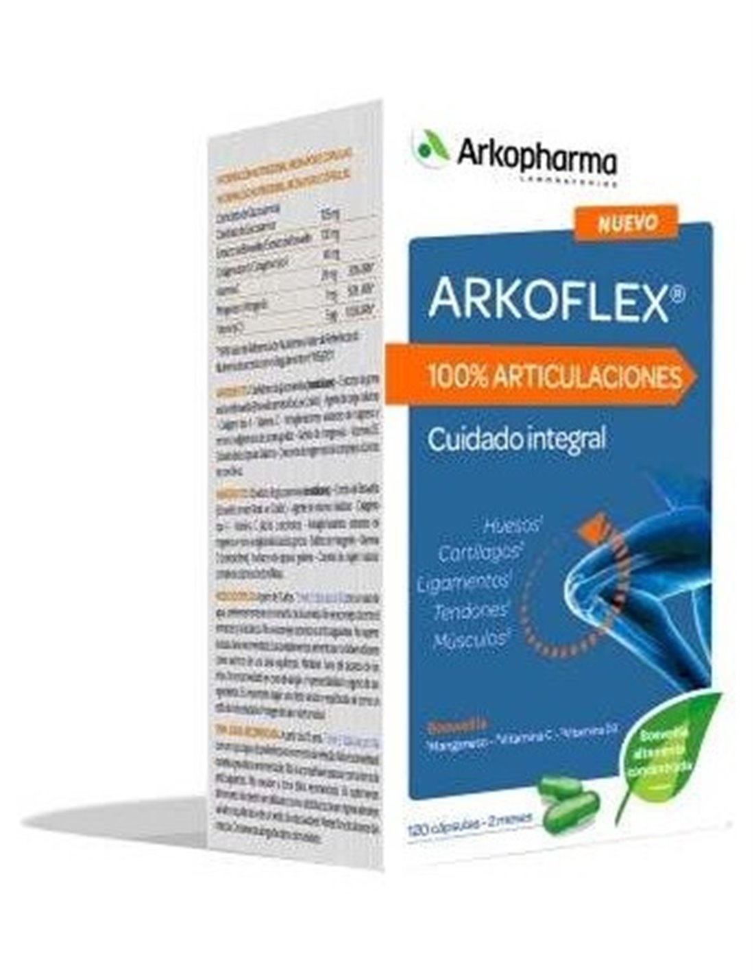 ARKOPHARMAArkoflex® 100% Articulaciones permite un cuidado integral de las articulaciones, huesos, cartílagos, ligamentos, tendones y músculos, debido a la sinergia de sus componentes: la Vitamina C participa en la formación de colágeno para un normal funcionamiento del cartílago. La Vitamina D3 contribuye al mantenimiento normal de la función muscular y al mantenimiento de los huesos en condiciones normales. El Manganeso contribuye a la formación normal del tejido conectivo. Su completa fórmula contiene además un extracto de Boswellia, altamente concentrado, que ayuda al mantenimiento articular; y Glucosamina, constituyente esencial del cartílago y Colágeno hidrolizado tipo II específico para las articulaciones. A partir de 15 años.