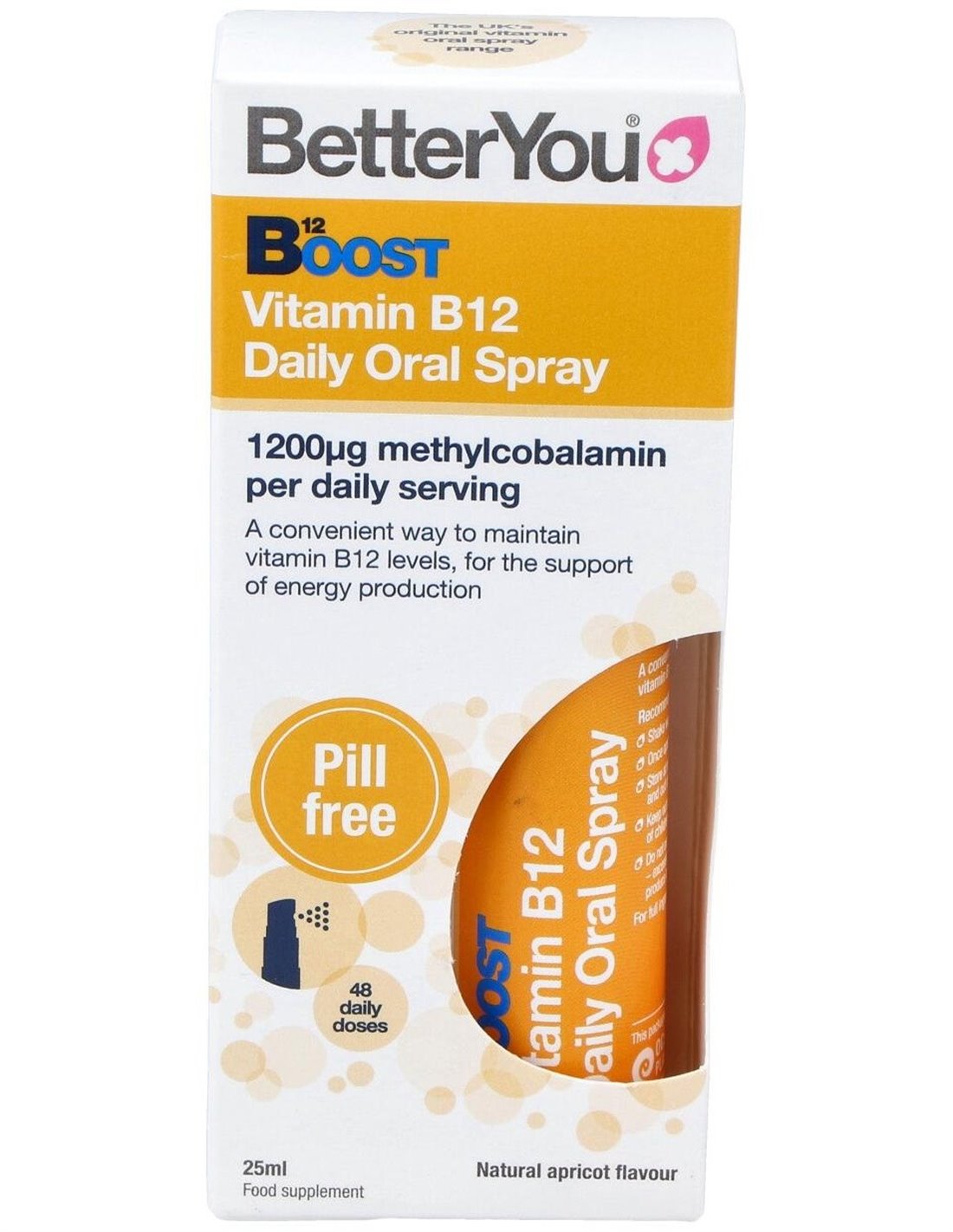 Boost B12 Spray Oral 25ml de BETTER YOU es una forma rápida y práctica de aportar vitamina B12 a tu organismo. Su fórmula en spray permite una absorción eficiente directamente en la boca, ideal para quienes buscan energía natural y apoyo al sistema nervioso. Perfecto para veganos y personas con deficiencia de esta vitamina esencial. Fácil de usar y transportar, es el complemento ideal para mantener tu vitalidad diaria. Disfruta de un impulso saludable con BETTER YOU.