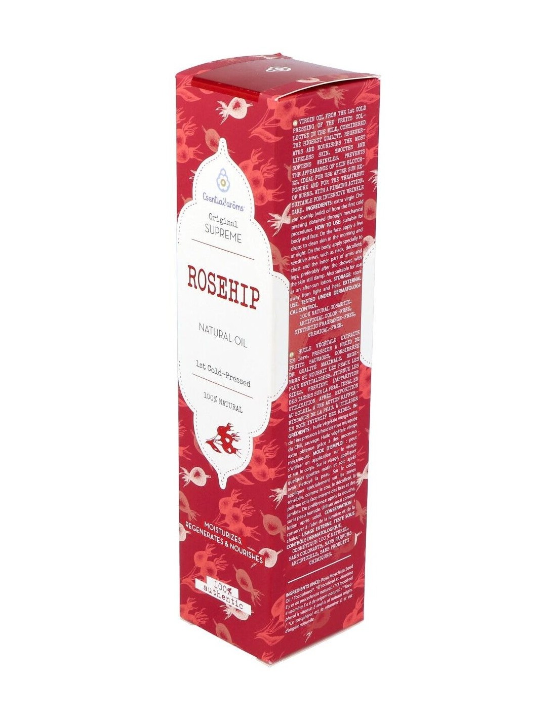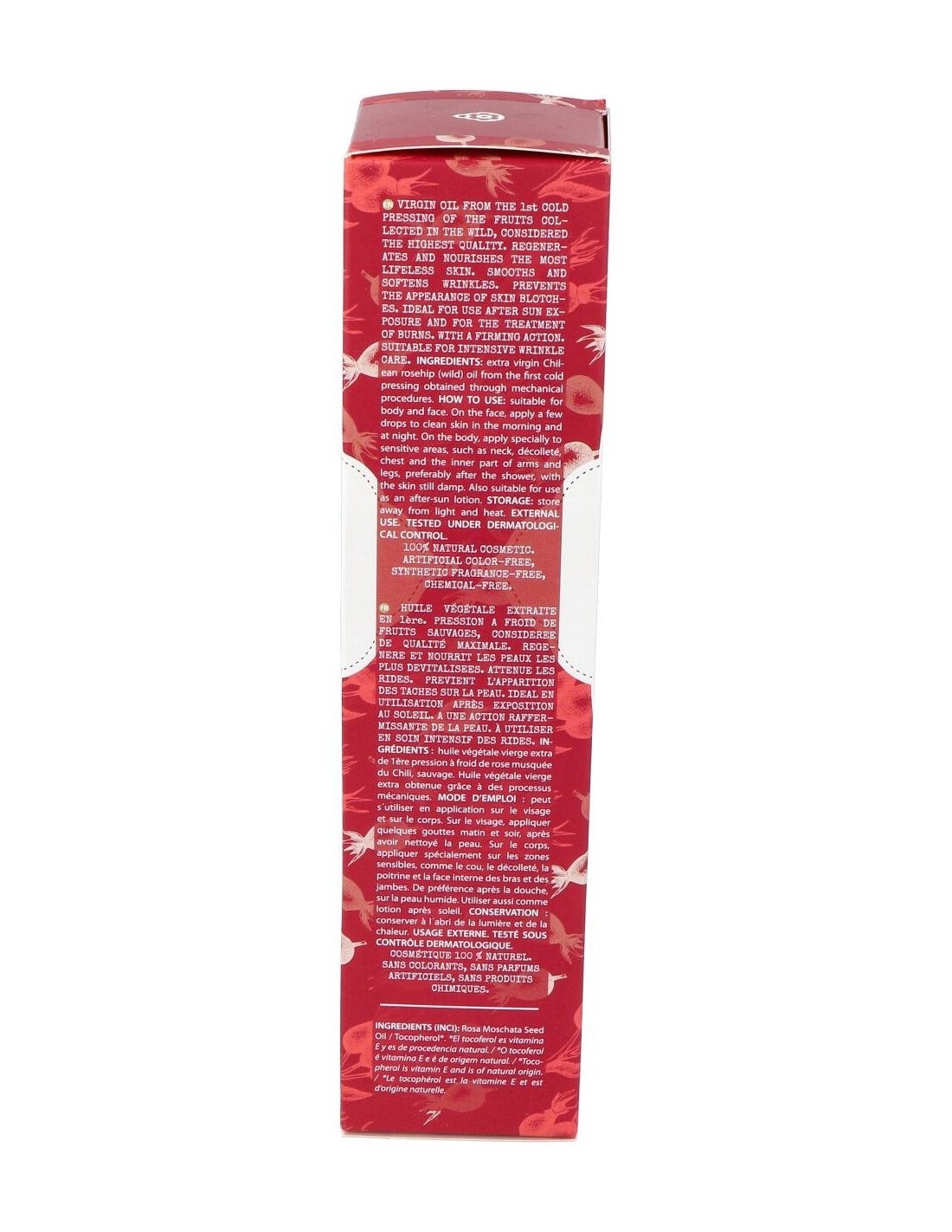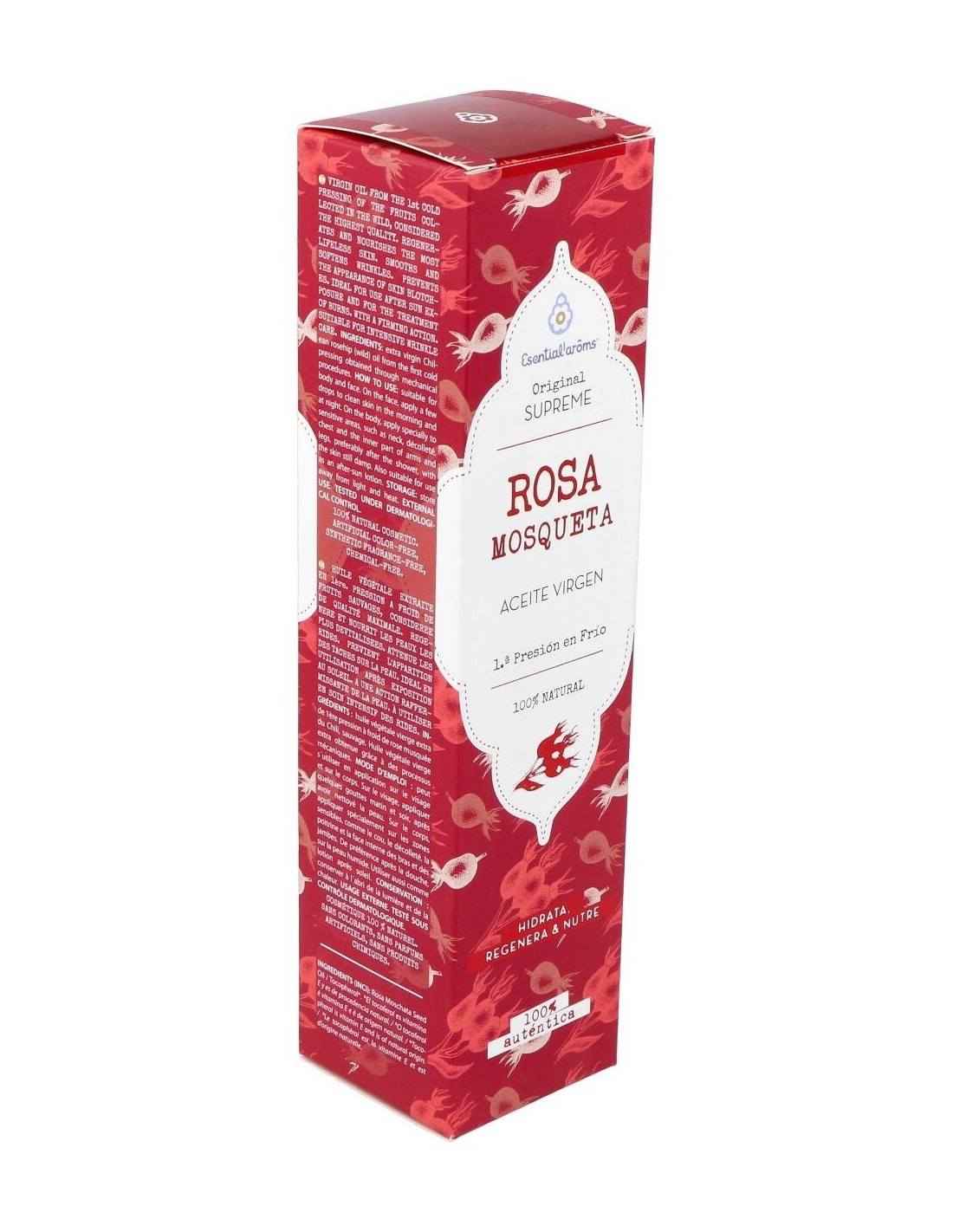 Rosa Mosqueta es un aceite vegetal virgen con un elevado contenido en O-3 vegetal (32%) y O -6(45%) es especialmente rico en compuestos específicos de acción antioxidante, como el licopeno, que le confiere su color anaranjado y sus propiedades altamente antioxidantes y regeneradoras. Con este tipo de aceite se obtendrá los beneficios que la rosa mosqueta auténtica puede proporcionar. Altamente hidratante y nutritivo, regenerador y antioxidante, cicatrizante. Está recomendado en cuidado especial de la piel desnutrida, opaca, desvitalizada y prematuramente envejecida, prevención de la aparición de arrugas, cuidado e hidratación de cicatrices y marcas en la piel y prevención de la aparición de manchas en la piel.