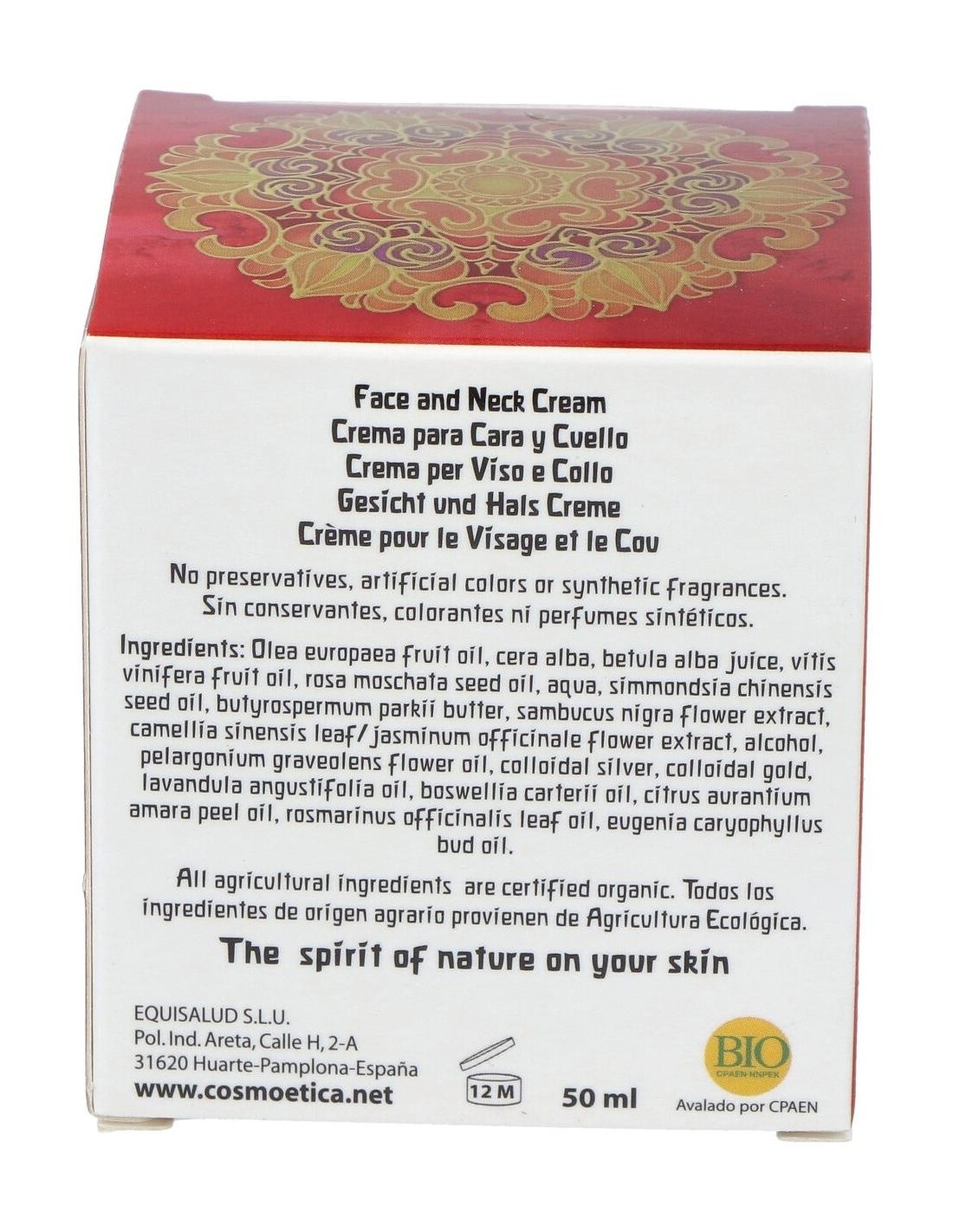 Aceite de oliva, Cera de abejas, Savia de Abedul fermentada, Aceite de pepita de uva, Aceite de Rosa mosqueta, Aceite de Jojoba, Manteca de Karité, Tintura de flores de Sauco, Infusión de Té-Jazmín, Aceite esencial de Geranio, Plata coloidal, Oro coloidal, Aceite esencial de Lavanda, Aceite esencial de incienso, Aceite esencial de Naranja amarga, Aceite esencial de Romero, Aceite esencial de Clavo.