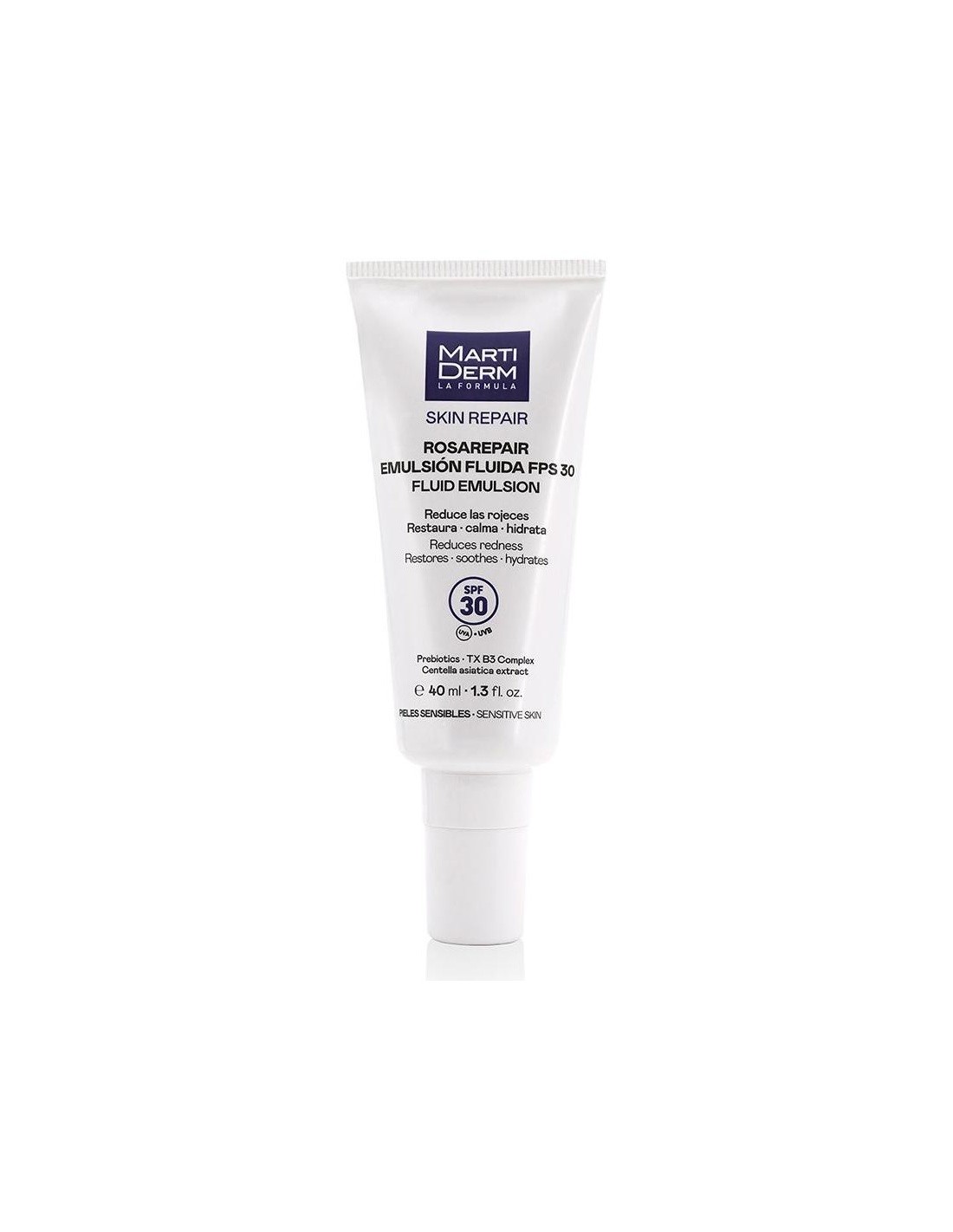 MARTIDERMProducto pensado exclusivamente para controlar las rojeces y cuidar las pieles más sensibles. Rosarepair Emulsión Fluida FPS 30 es un producto para el día a día de pieles con tendencia al enrojecimiento: previene y reduce las rojeces a la vez que alivia la sensación de calor. Hidrata y calma la piel, restaurando su función barrera. Protege la piel de las radiaciones UVA y UVB.