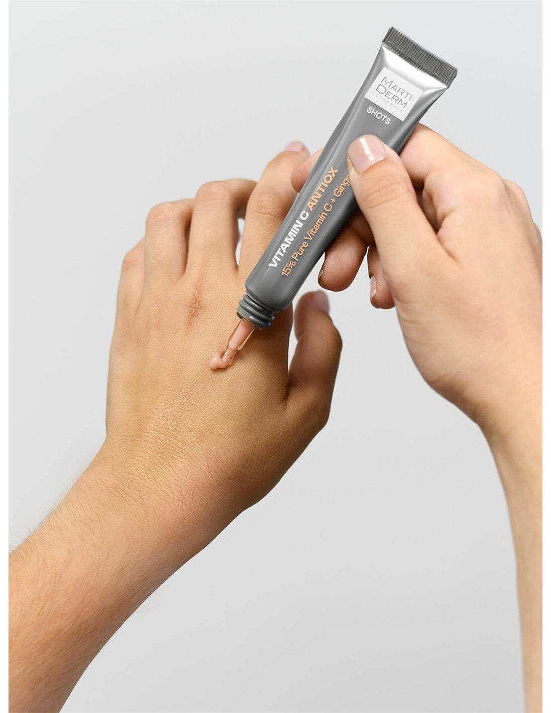Martiderm Shot Vitamin C Antiox 20ml es un tratamiento facial que contribuye a acelerar el proceso de formación natural de las fibras de sostén de la epidermis.