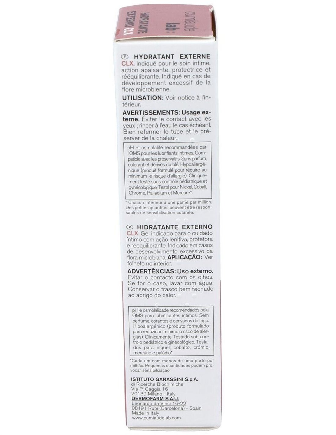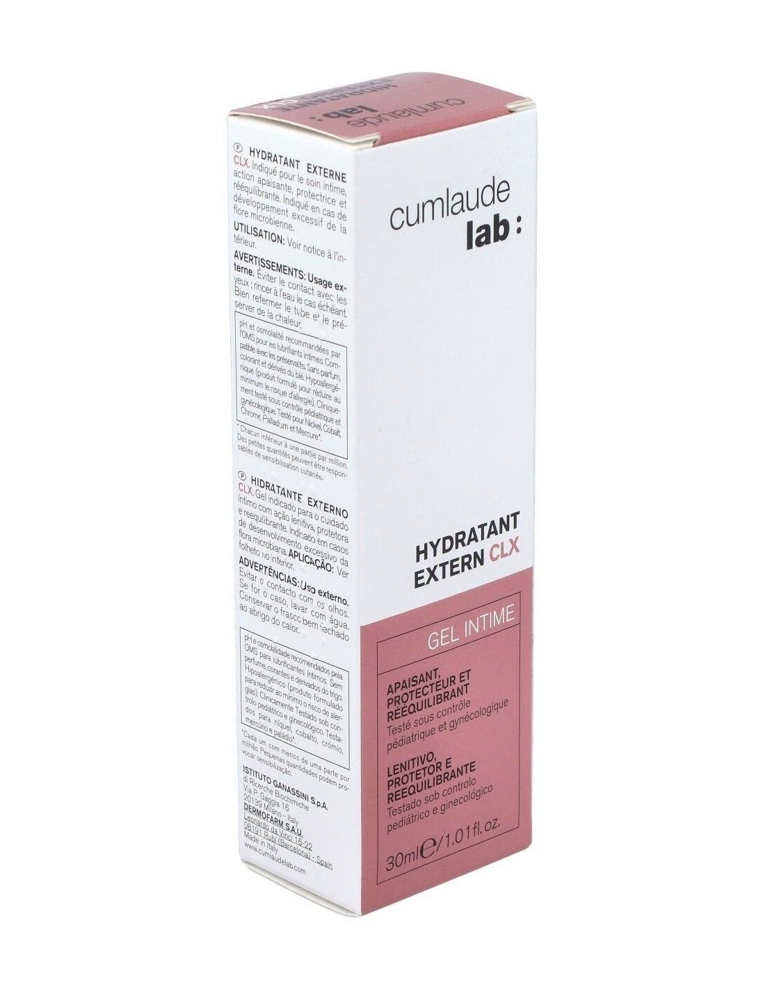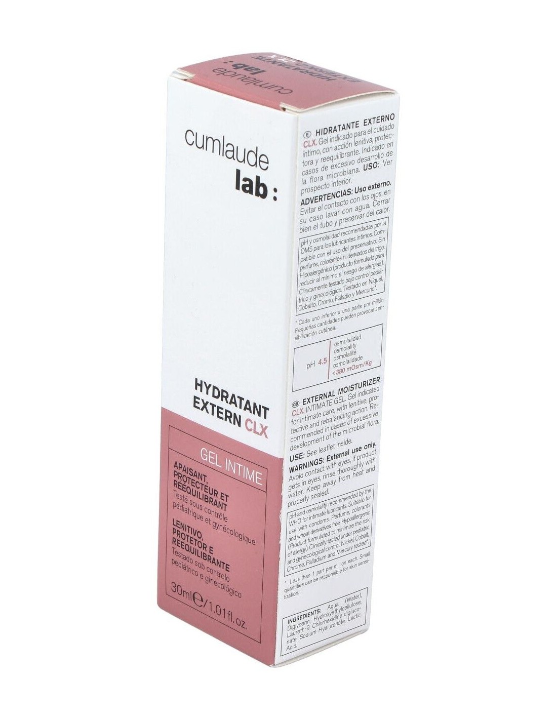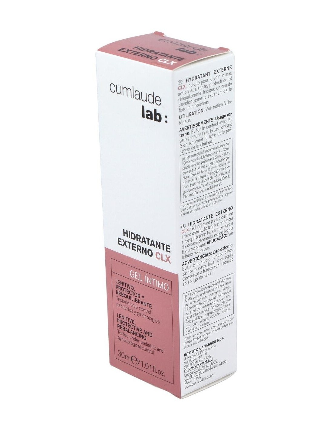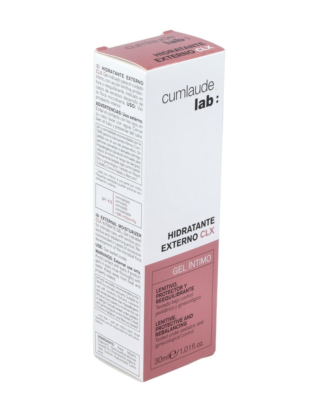 Cumlaude | Cumlaude hidratante externo CLX 30mlCumlaude hidratante externo CLX 30ml es un gel hidratante formulado con clorhexidina con pH6 especialmente indicado para el cuidado íntimo de la zona externa de la vagina.Además, posee una acción calmante, protectora y reequilibrante, especialmente para casos de excesivo desarrollo de flora vaginal, picores, olores desagradables, irritaciones, etc.