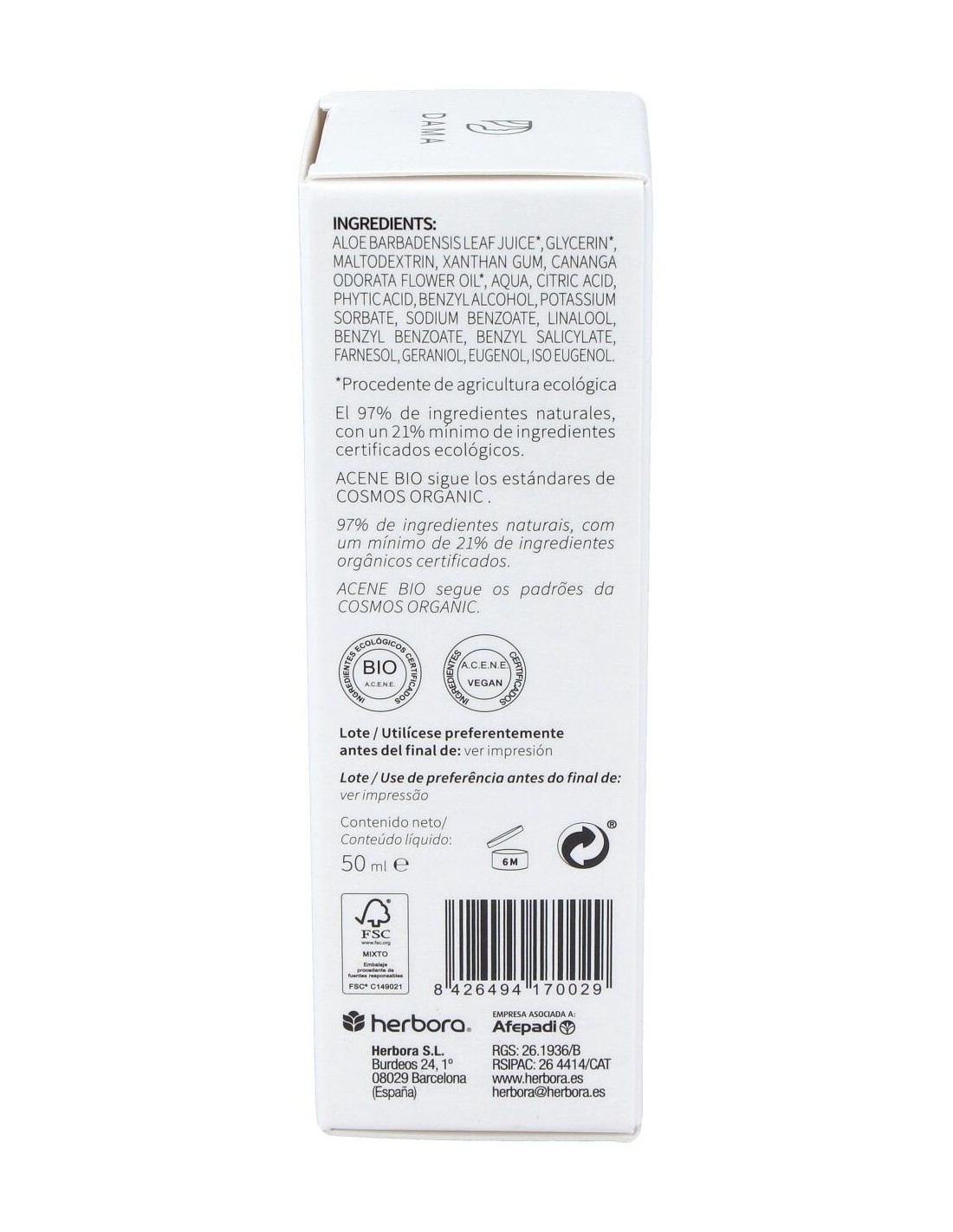 Aloe vera BIO (Aloe bardadensis Miller) 60 %, Glicerina vegetal 37.5 %, Ylang-ylang (Cananga odorata) 0.1 %, Ácido Fítico 0.1 %. Otros ingredientes: Maltodextrin, Xanthan Gum, Aqua, Citric Acid, Benzyl Alcohol, Potassium Sorbate, Sodium Benzoate, Linalool, Benzyl Benzoate, Benzyl Salicylate, Farnesol, Geraniol, Eugenol, Iso Eugenol.