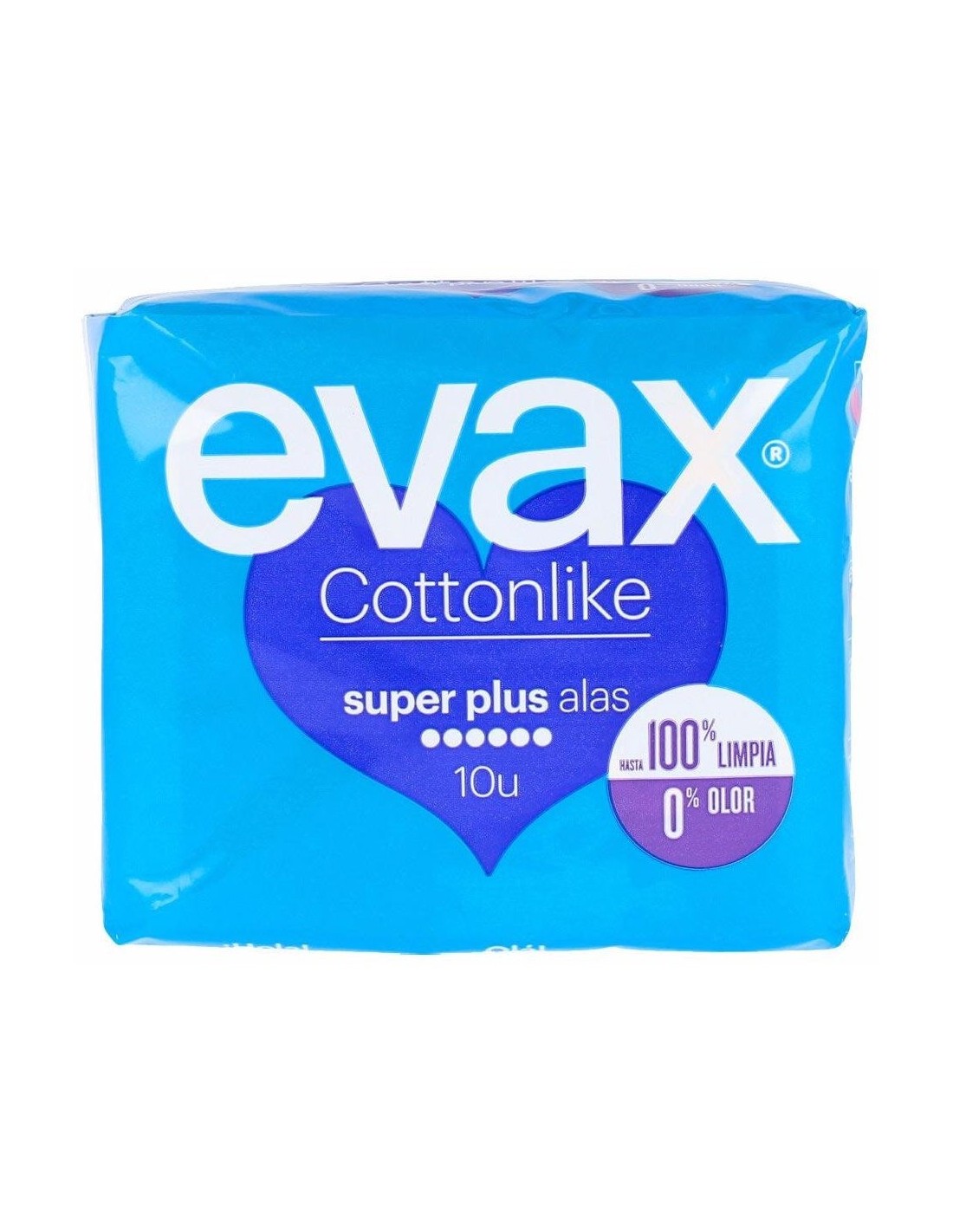 Cuenta con el Sistema EVAX Cottonlike Dual con perlas activas que neutralizan el olor y un núcleo que captura el flujo al instante, para ofrecer una absorción que mantiene hasta 100% limpia y 0% sin rastro de olor. Sus alas mantienen la compresa en su sitio y la cobertura Cottonlike ofrece un confort duradero. Para los días de mayor flujo. Producto testado dermatológicamente.