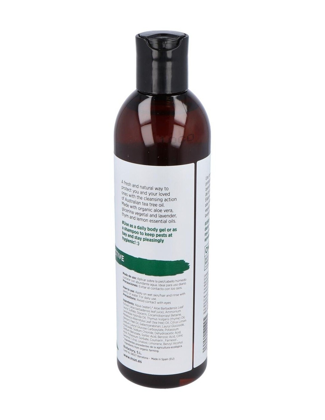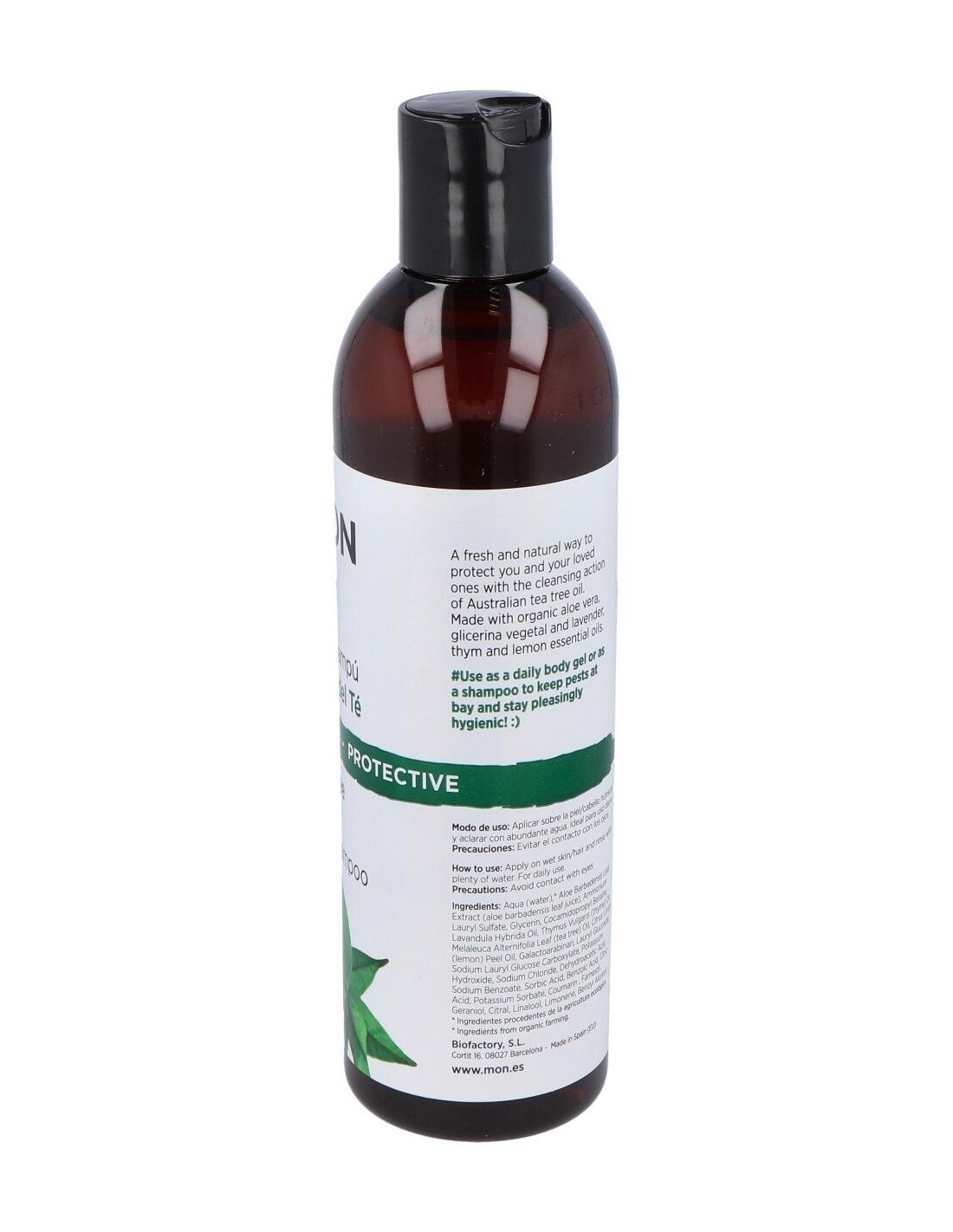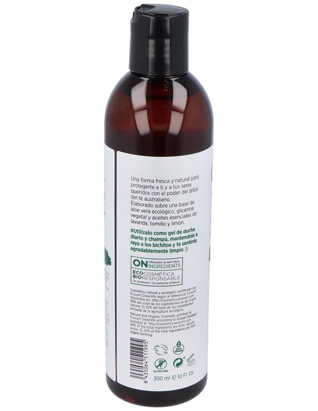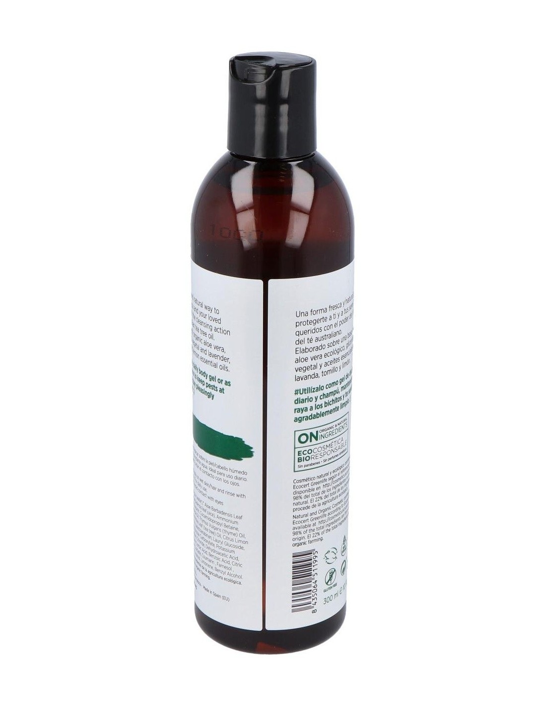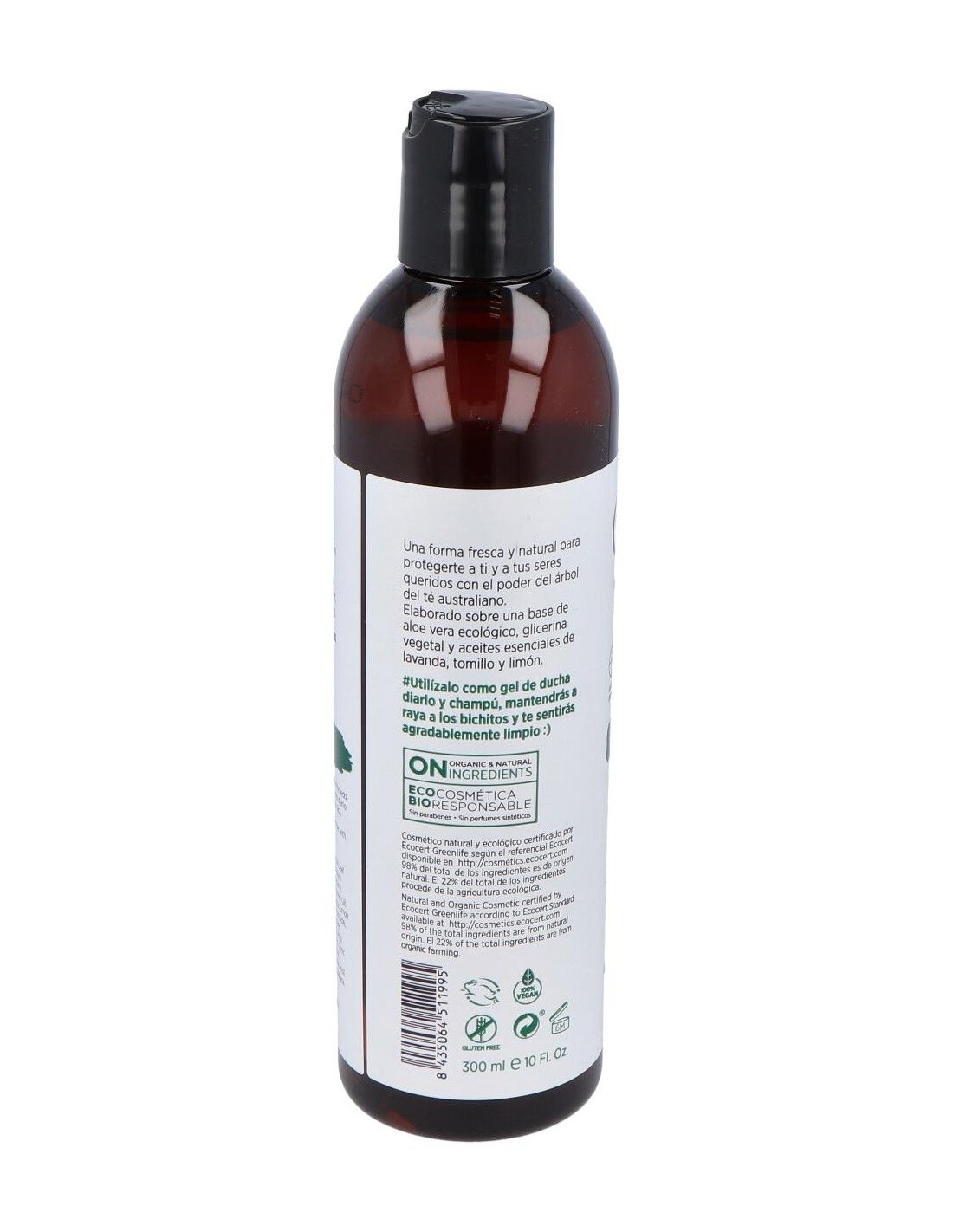 Gel y Champú del árbol del té, compuesto por aceites esenciales biológicos de árbol del té, limón, pachulí, tomillo y lavanda. Es muy recomendable, para la higiene diaria de las personas que acudan a gimnasios o piscinas públicas ya que es un buen fungicida, antiséptico y regenerador de la piel.Está especialmente Indicado para evitar el contagio de piojos y para la higiene íntima de la mujer.No contiene colorantes, parabenos ni perfume.Composición (INCI):Aqua, sodium laureth sulfate, cocamidopropil betaine, citrus limonium, thymus vulgaris, disodium lauryl, melaleuca alternifolia, pagostemon pachuli, hydroxipropil guar, lavandula officinalis, lactic acid, propileneglicol, methylisothiazolinone.Modo de empleo:Aplicar sobre el cabello y cuerpo mojado y aclarar.Presentación:Bote de 300 ml.