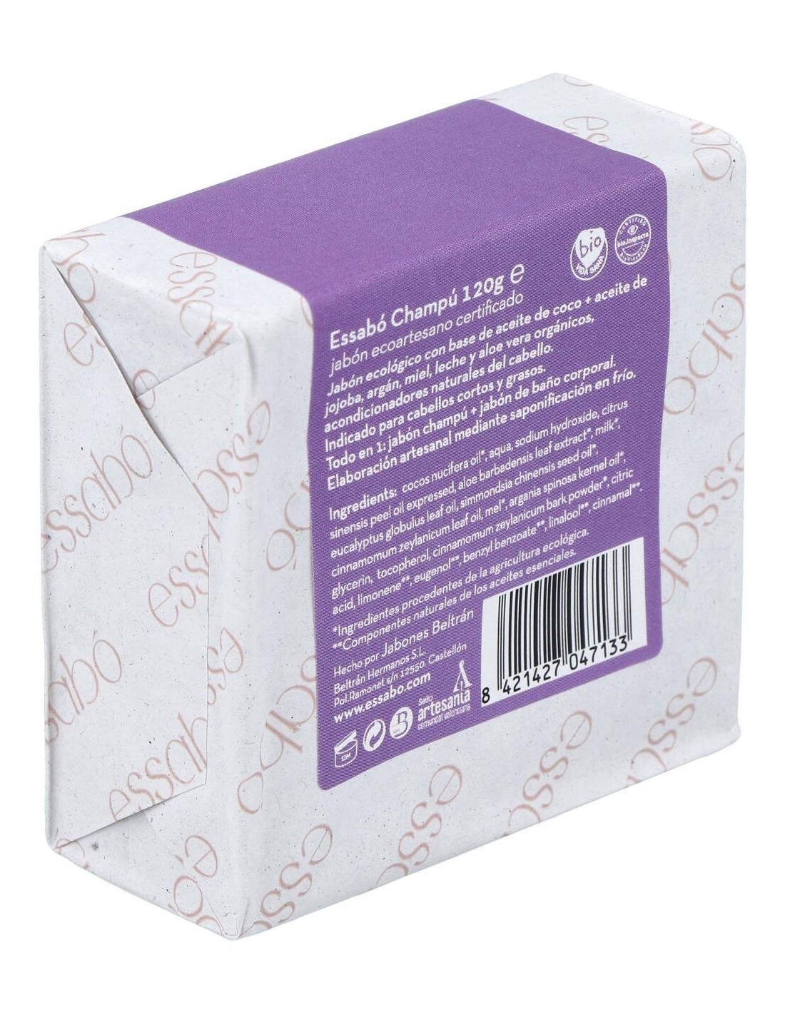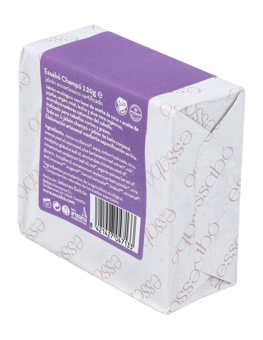 Essabó Champú es un jabón ecológico específico para el lavado del cabello, enriquecido con aceite de jojoba, argán y aloe vera ecológicos, acondiciona