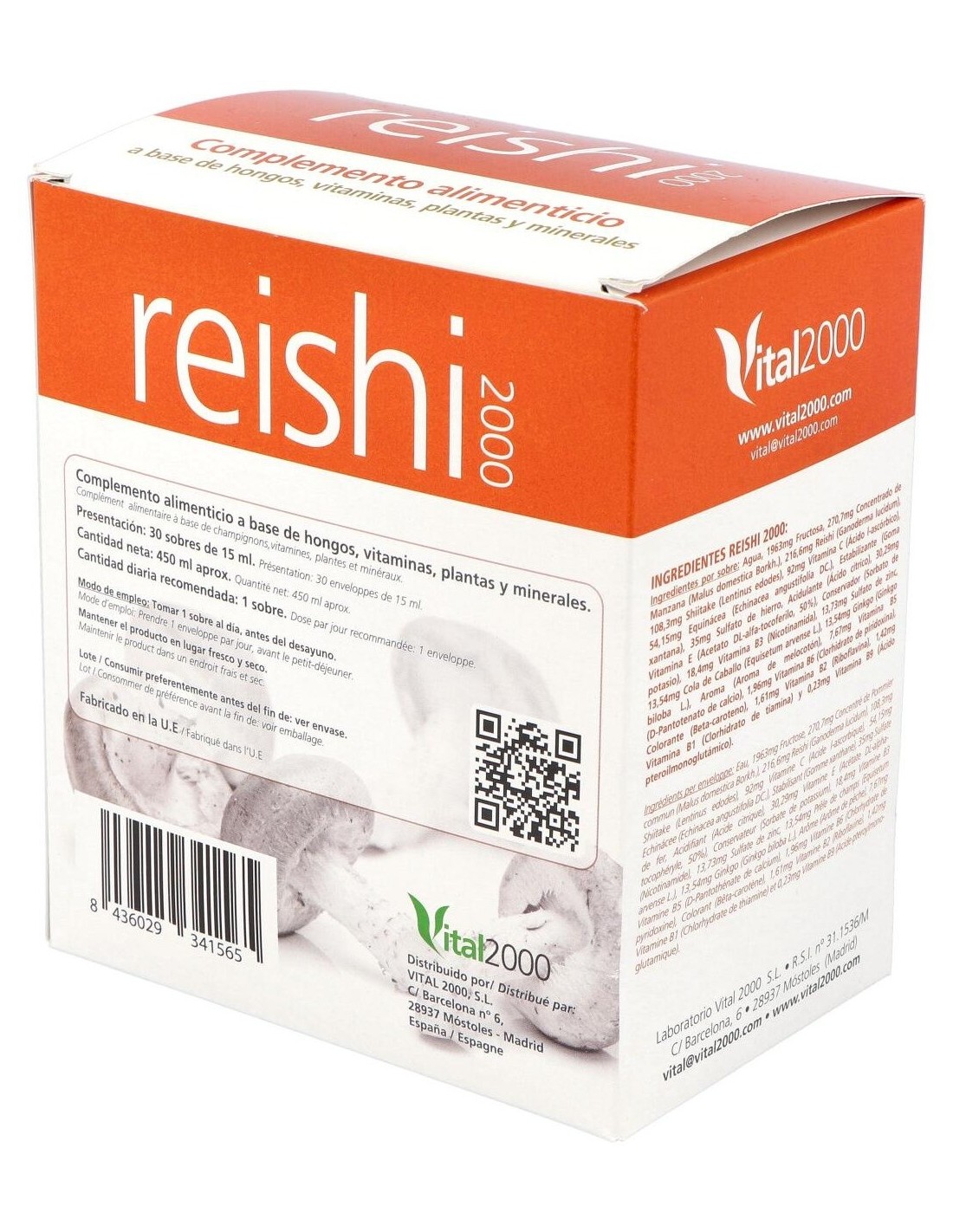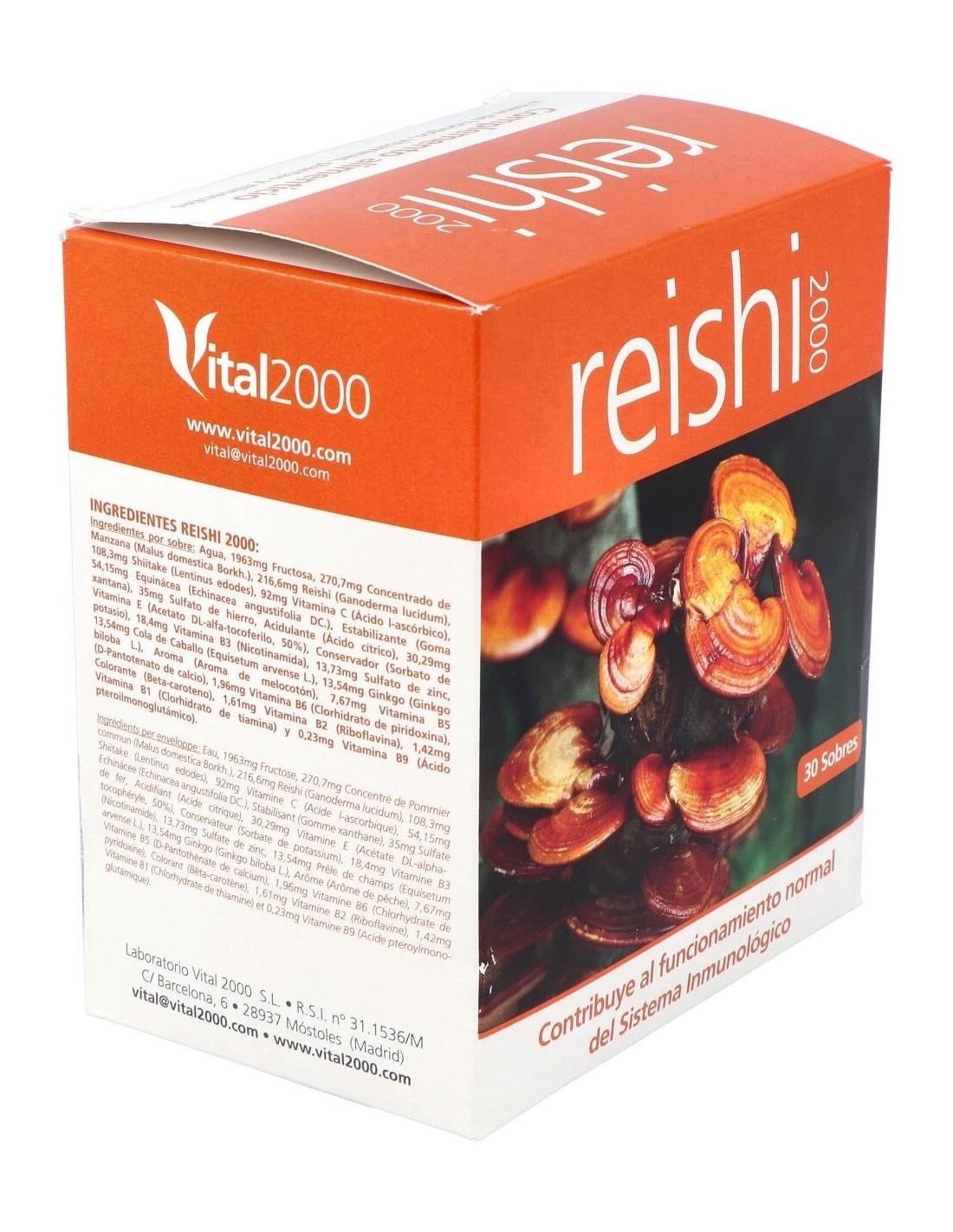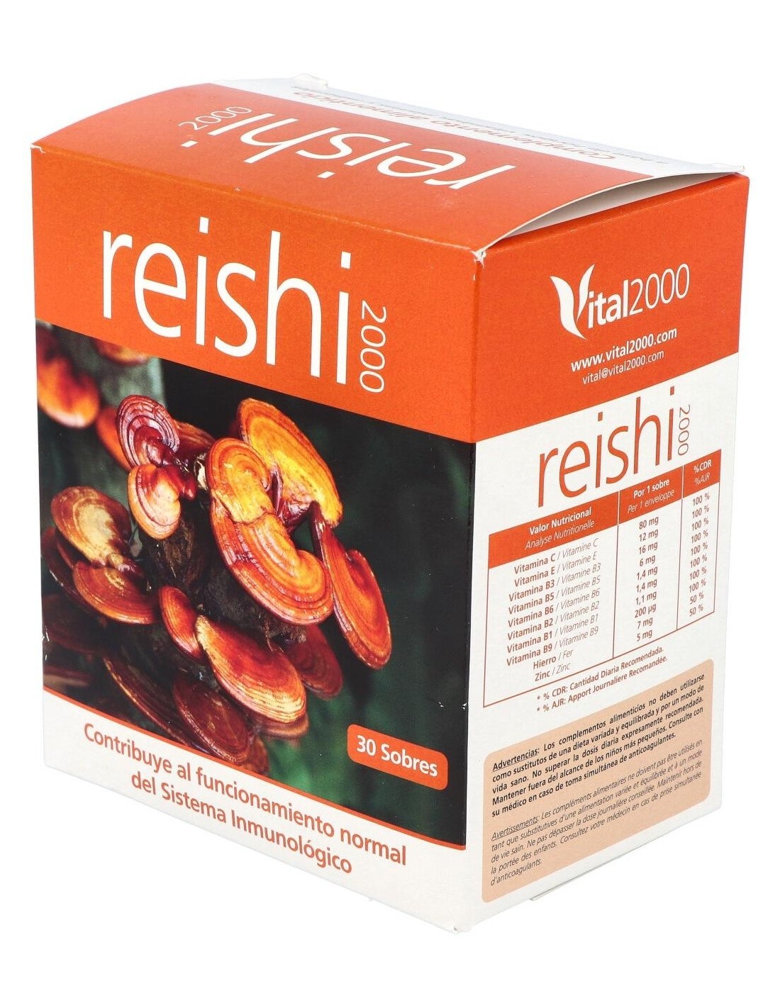 Composición por 1 cápsula: Reishi (216.61 mg), Shiitake (108.3 mg), Vitamina C (92 mg), Equinácea (54.15 mg), Sulfato de hierro heptahidratado (35 mg), Vitamina E (30.29 mg), Vitamina B3 (18.4 mg), Sulfato de zinc monohidrato (13.73 mg), Cola de Caballo (13.54 mg), Ginkgo (13.54 mg), Vitamina B5 (7.67 mg), Vitamina B6 (1.96 mg), Vitamina B2 (1.61 mg), Vitamina B1 (1.42 mg).