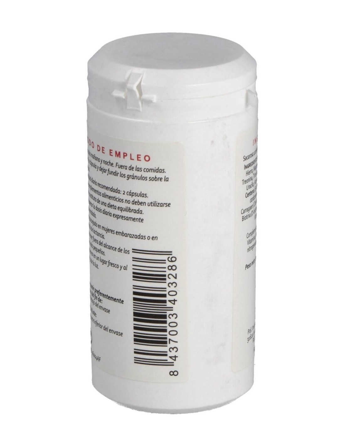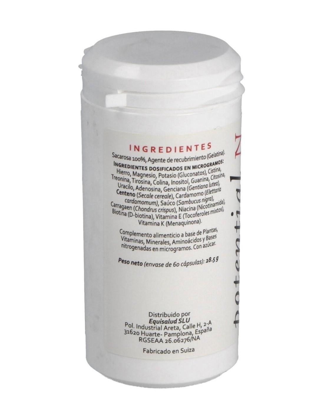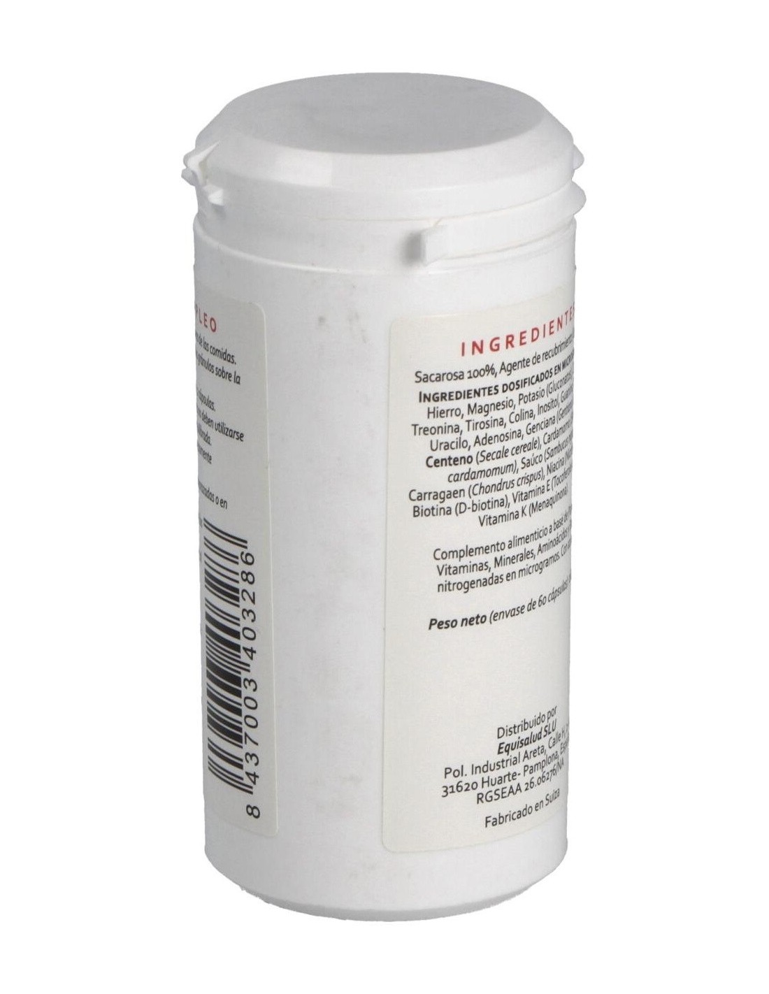 Minerales: hierro, magnesio y potasio (gluconatos). Aminoácidos: cistina, treonina, tirosina, colina, inositol, guanina, citosina, uracilo, adenosina. Plantas: genciana (Gentiana lutea), centeno (Secale cereale), cardamomo (Elattaria cardamomum), saúco (Sambucus nigra), carragaen (Chondrus crispus). Vitaminas: niacina (nicotinamida), biotina (D-biotina), vitamina E (mezcla de tocoferoles), vitamina K (menaquinona). Envoltura: Agente de recubrimiento (gelatina), sacarosa 100%.