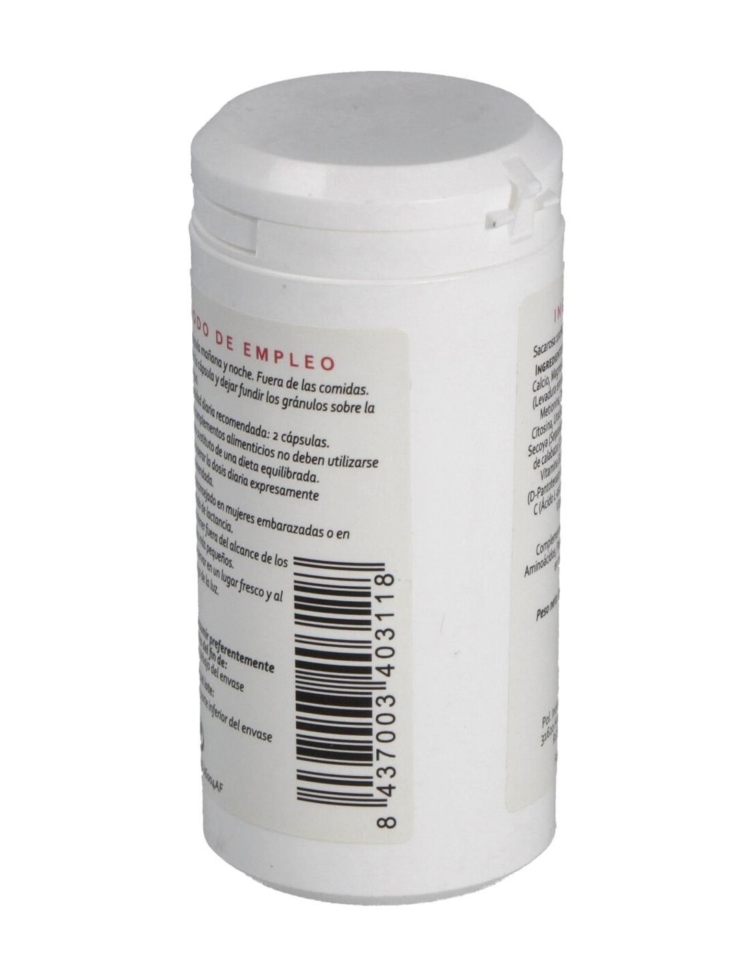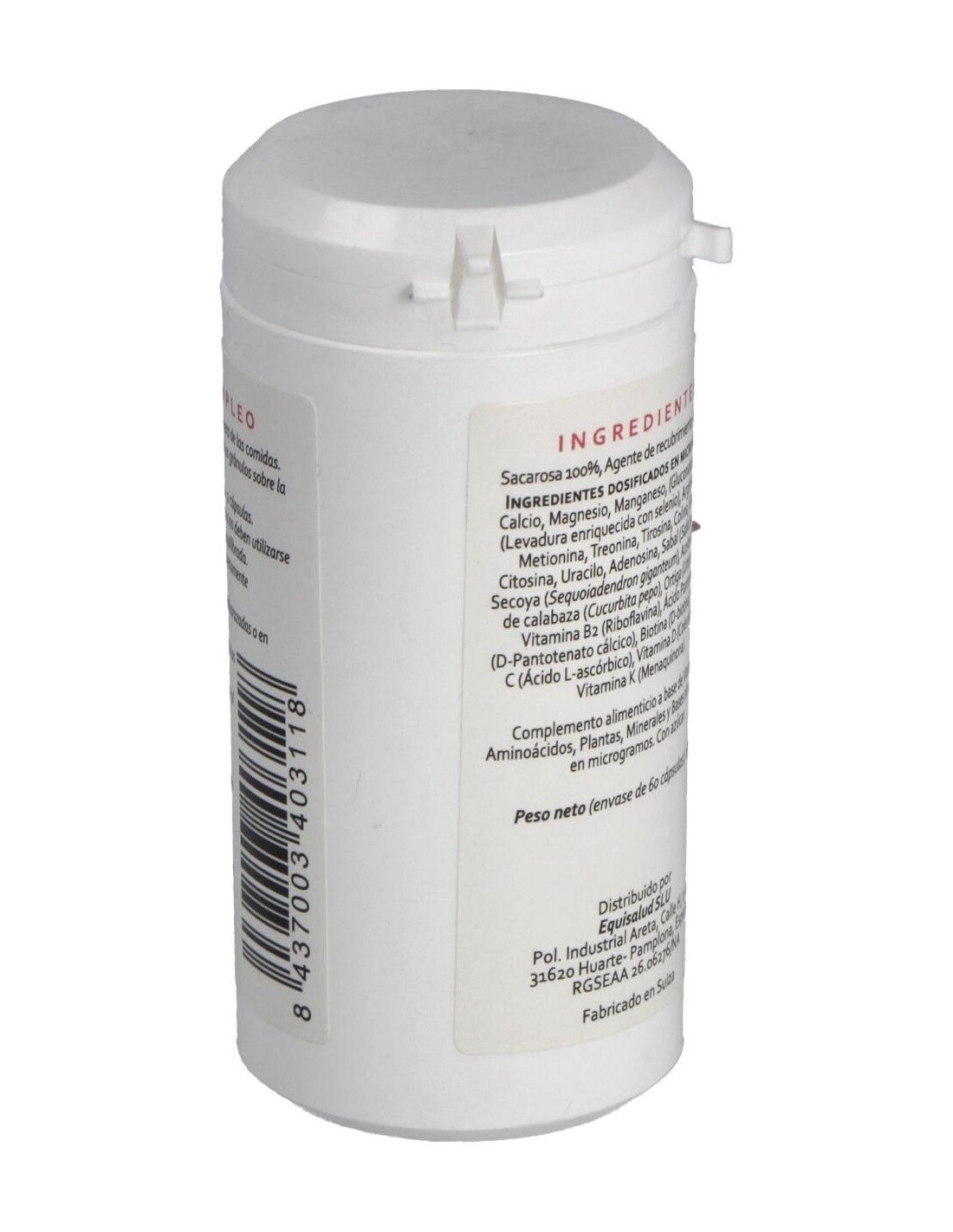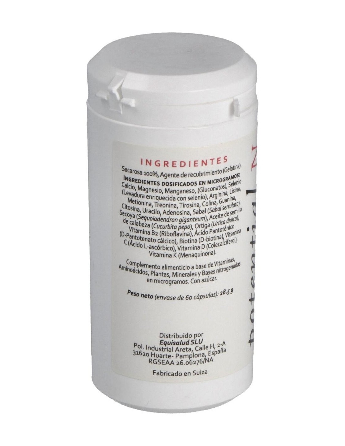 Minerales: calcio, magnesio y manganeso (gluconatos), selenio (levadura enriquecida con selenio). Aminoácidos: arginina, lisina, metionina, treonina, tirosina, colina, guanina, citosina, uracilo, adenosina. Plantas: sabal (Sabal serrulata), secoya (Sequoiadendron giganteum), aceite de semilla de calabaza (Cucurbita pepo), ortiga (Urtica dioica). Vitaminas: vitamina B2 (riboflavina), ácido pantoténico (D pantotenato cálcico), biotina (D-biotina), vitamina C (ácido L-ascórbico), vitamina D (colecalciferol), vitamina K (menaquinona). Envoltura: Agente de recubrimiento (gelatina), sacarosa 100%.