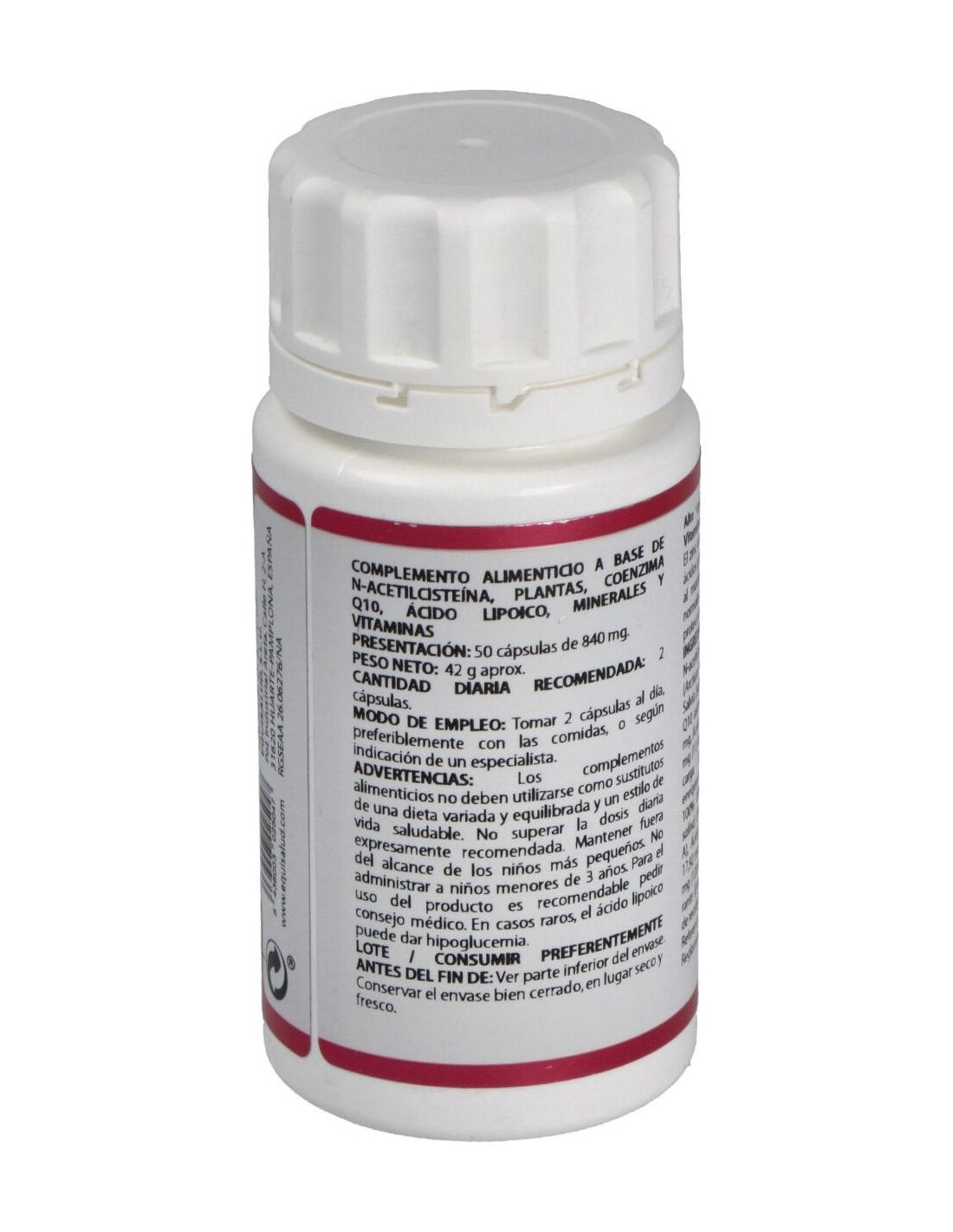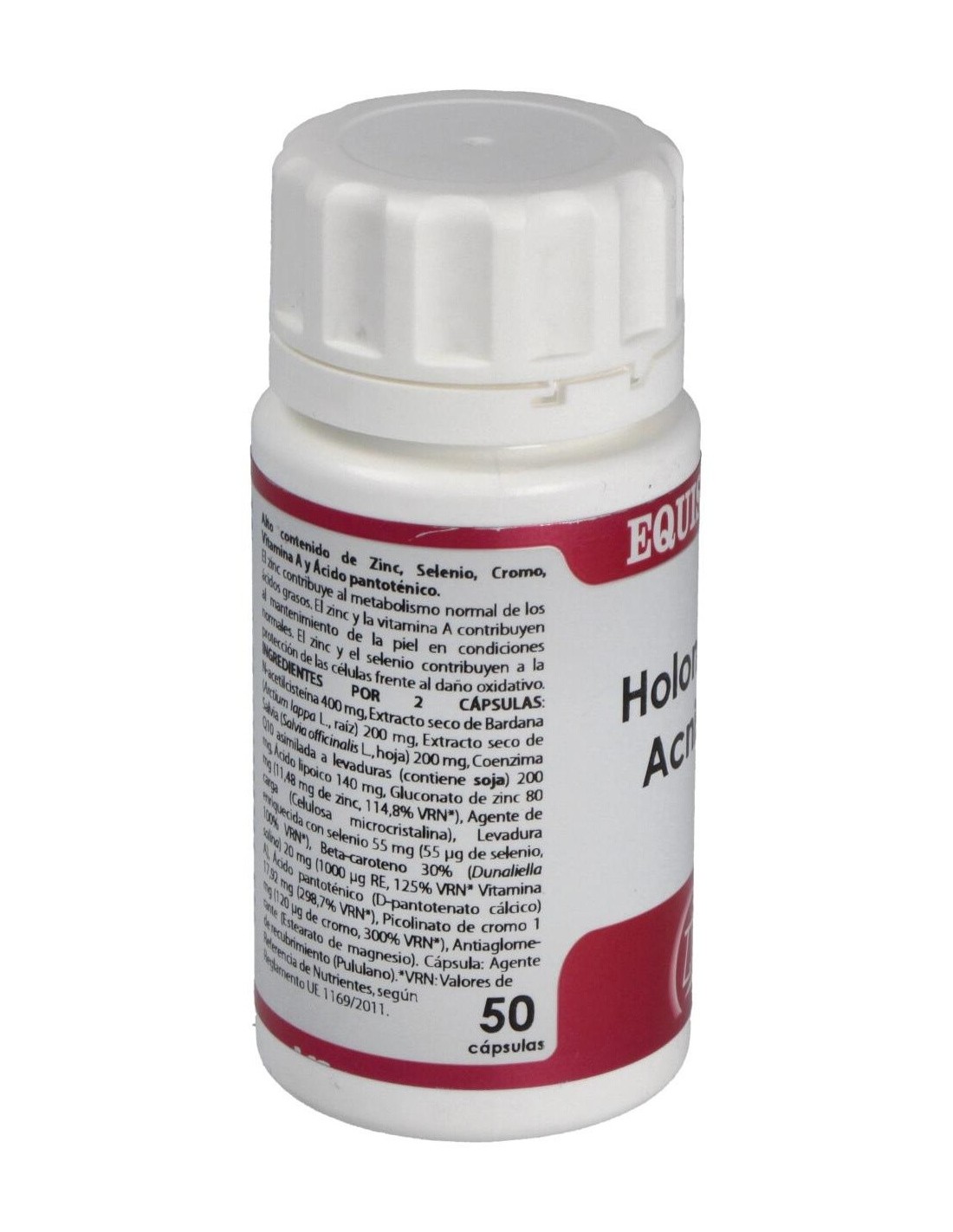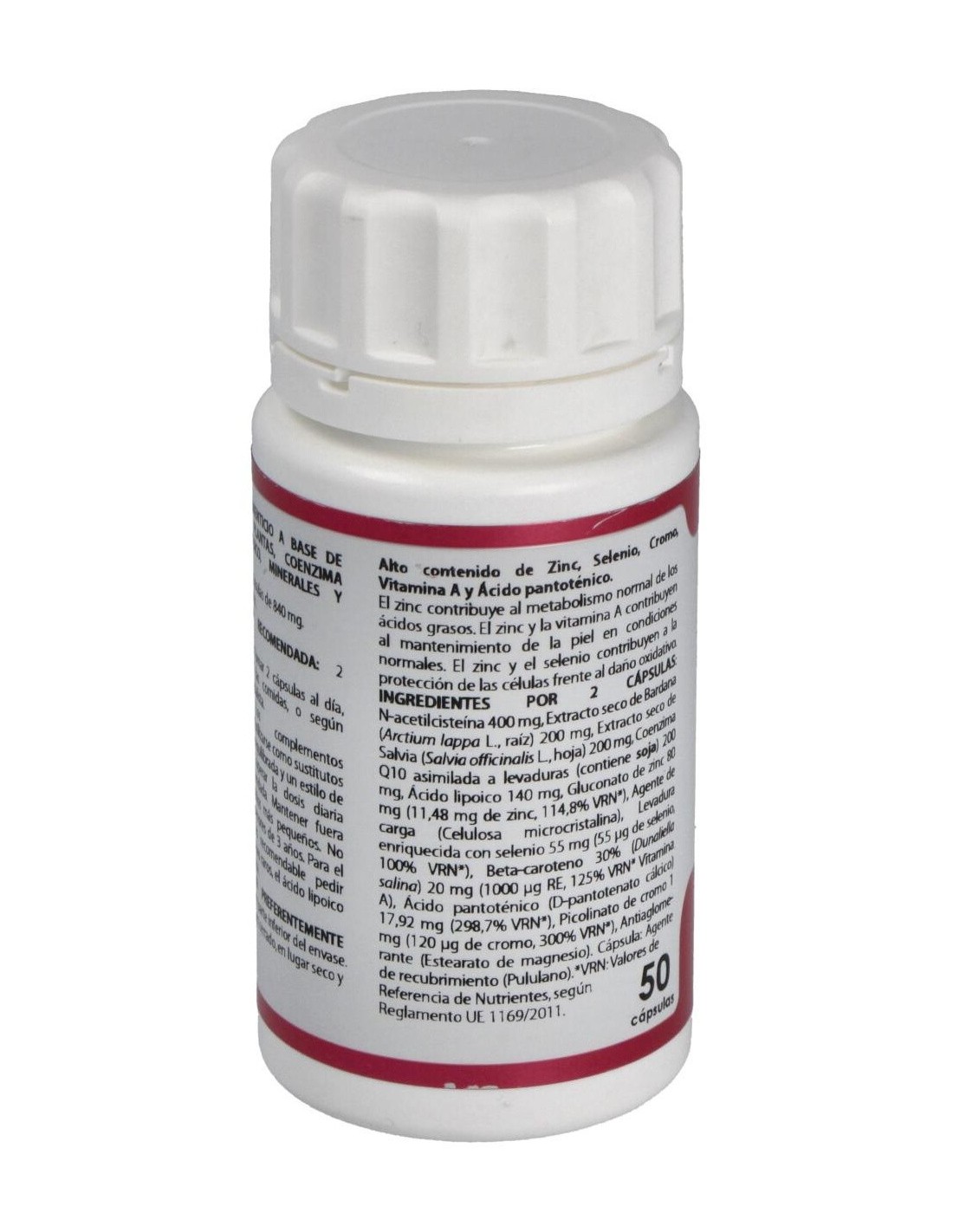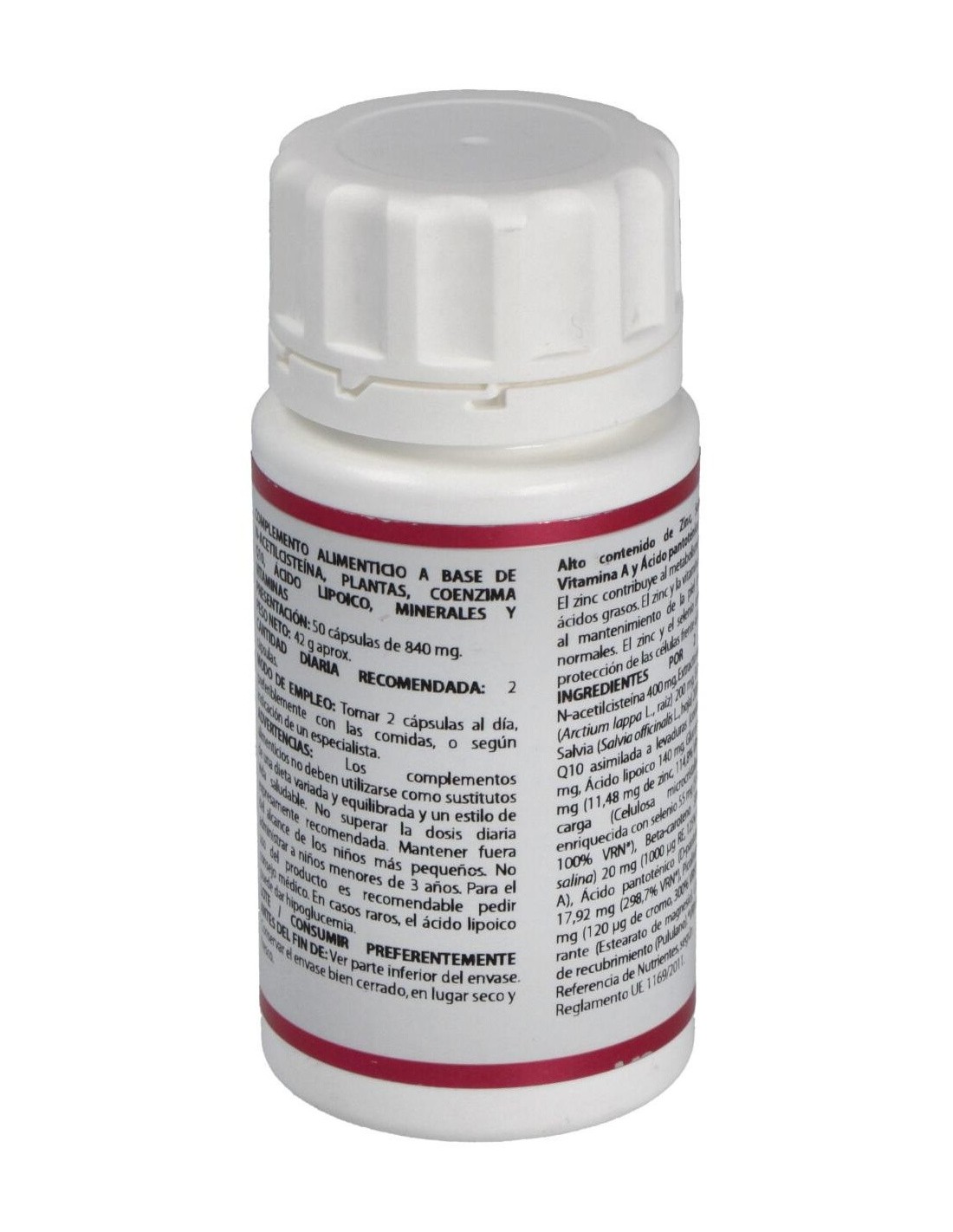 Complemento alimenticio a base de N-acetilcisteína, plantas, coenzima Q10, ácido lipoico, minerales y vitaminas. Apoyo natural contra el acné.