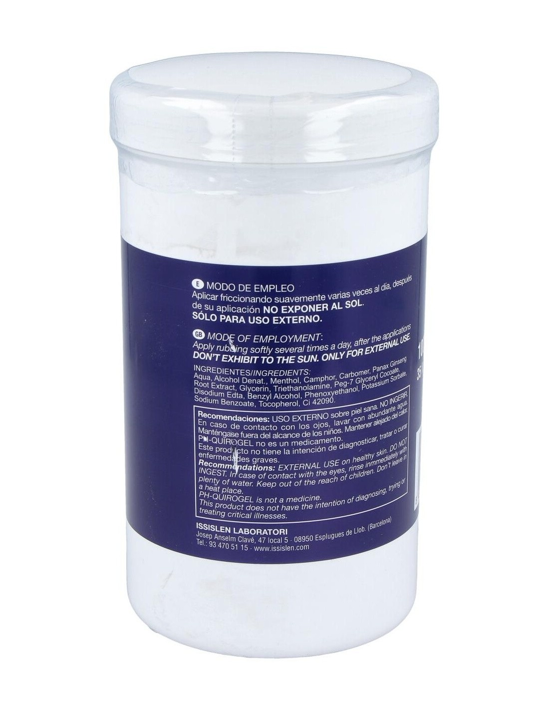 Aqua, Alcohol denat., Menthol, Camphor, Carbomer, PEG-7 Glyceryl Cocoate, Eleuterococo, Triethanolamine, Phenoxyethanol, Methylparaben, Butylparaben, Ethylparaben, Propylparaben.