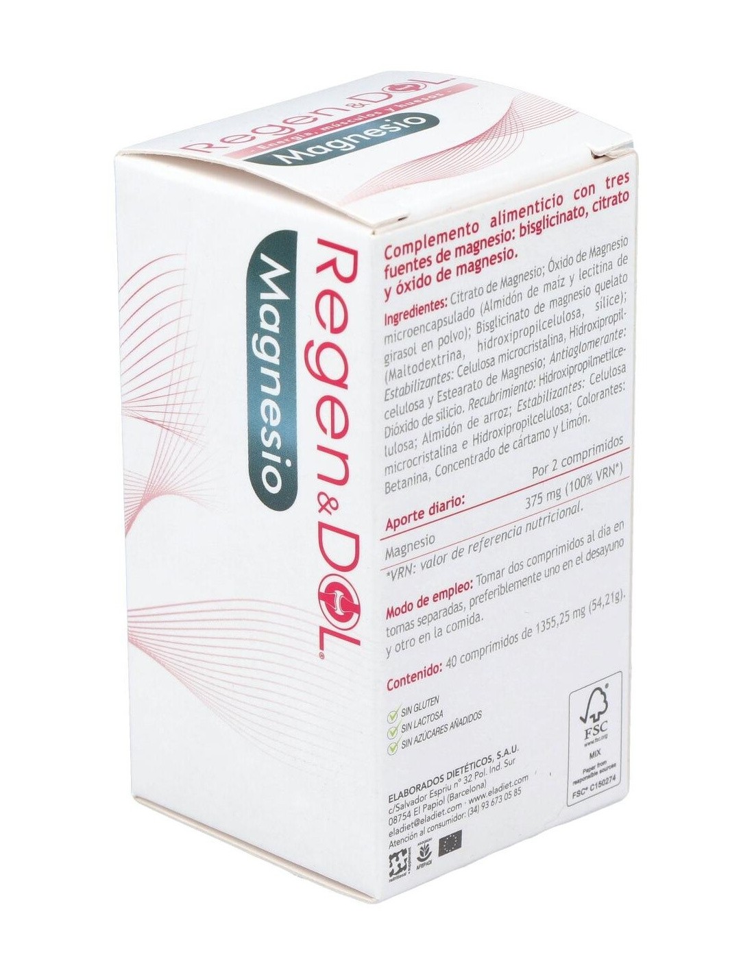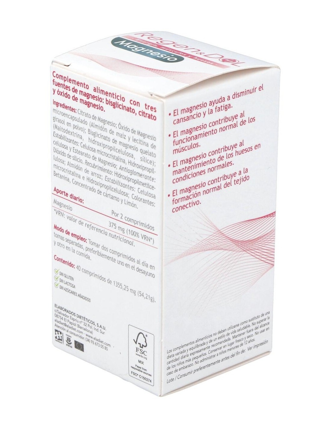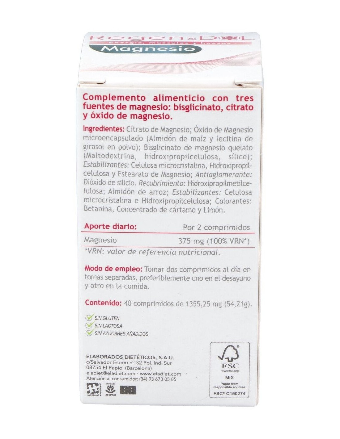 Citrato de Magnesio; Óxido de Magnesio microencapsulado (Almidón de maíz y lecitina de girasol en polvo); Bisglicinato de magnesio quelato (Maltodextrina, hidroxipropilcelulosa, sílice); Estabilizantes: Celulosa microcristalina, Hidropropilcelulosa y Estearato de Magnesio; Antiaglomerante: Dióxido de silicio. Recubrimiento: Hidroxipropilmetilcelulosa; Almidón de arroz; Estabilizantes: Celulosa microcristalina e Hidropropilcelulosa; Colorantes: Betanina, Concentrado de cártamo y Limón.