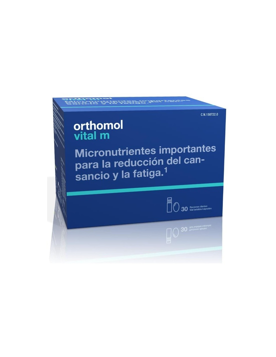 Orthomol vital M contiene una combinación específica de micronutrientes importantes para el sistema nervioso y el metabolismo energético que ayudan a la reducción del cansancio y la fatiga, pensados para el hombre, como: vitamina C, vitamina B2, vitamina B6, vitamina B12, ácido fólico, yodo, manganeso, niacina y biotina, entre otros, que contribuyen a la reducción del cansancio y la fatiga y a la protección del estrés oxidativo.Los ácidos grasos omega 3 EPA y DHA contribuyen a la función normal del corazón. El efecto positivo se establece con una ingesta diaria de 250 mg de EPA y DHA.Composición activa por 1 vial y 2 cápsulas: