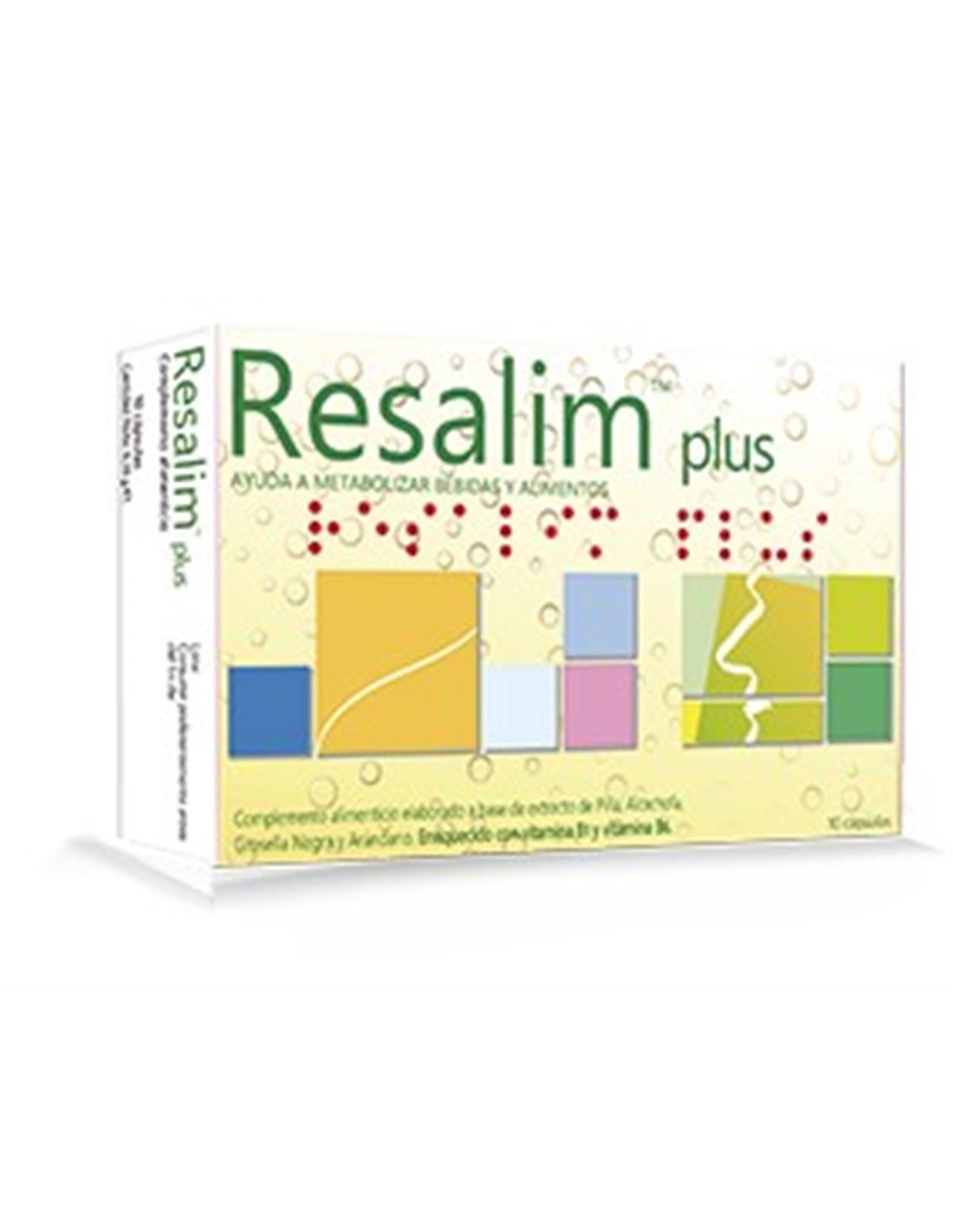 Resalim Plus es un complemento alimenticio elaborado con extractos vegetales (como los extractos de piña, alcachofa, grosella negra y arándano) que ayudan a metabolizar bebidas y alimentos después de una gran ingesta. La fórmula de Resalim plus aporta el 100% de la cantidad diaria recomendada de las vitaminas B1 y B6. Estas vitaminas contribuyen a disminuir el cansancio y la fatiga, además colaborar en el buen funcionamiento del metabolismo energético de las proteínas y del glucógeno.