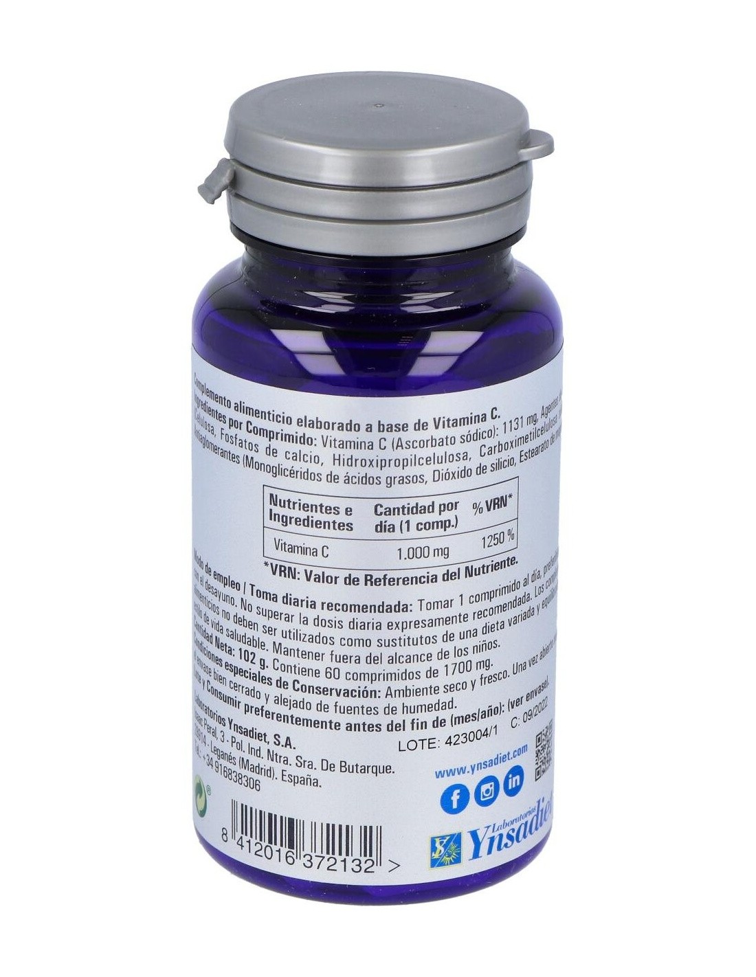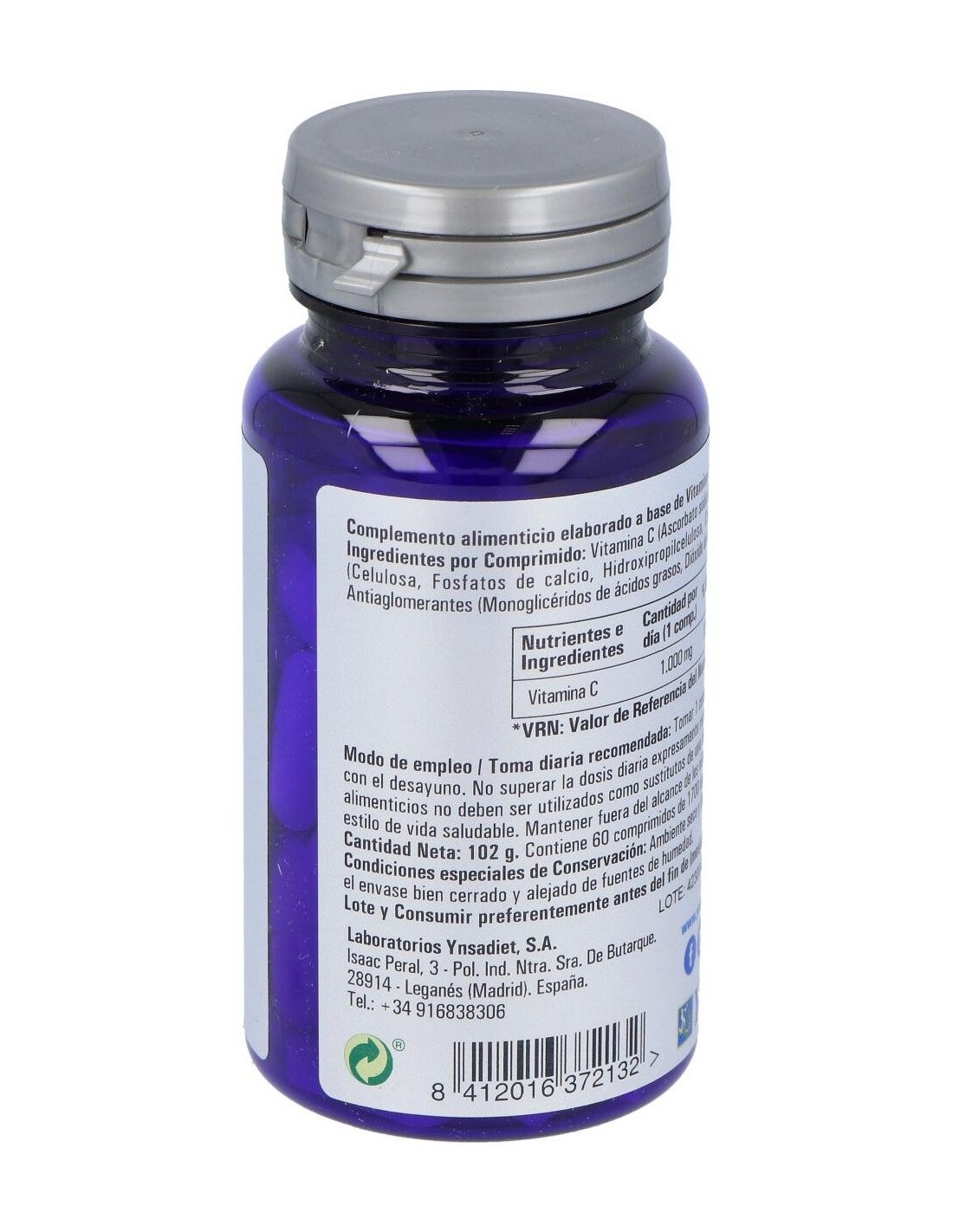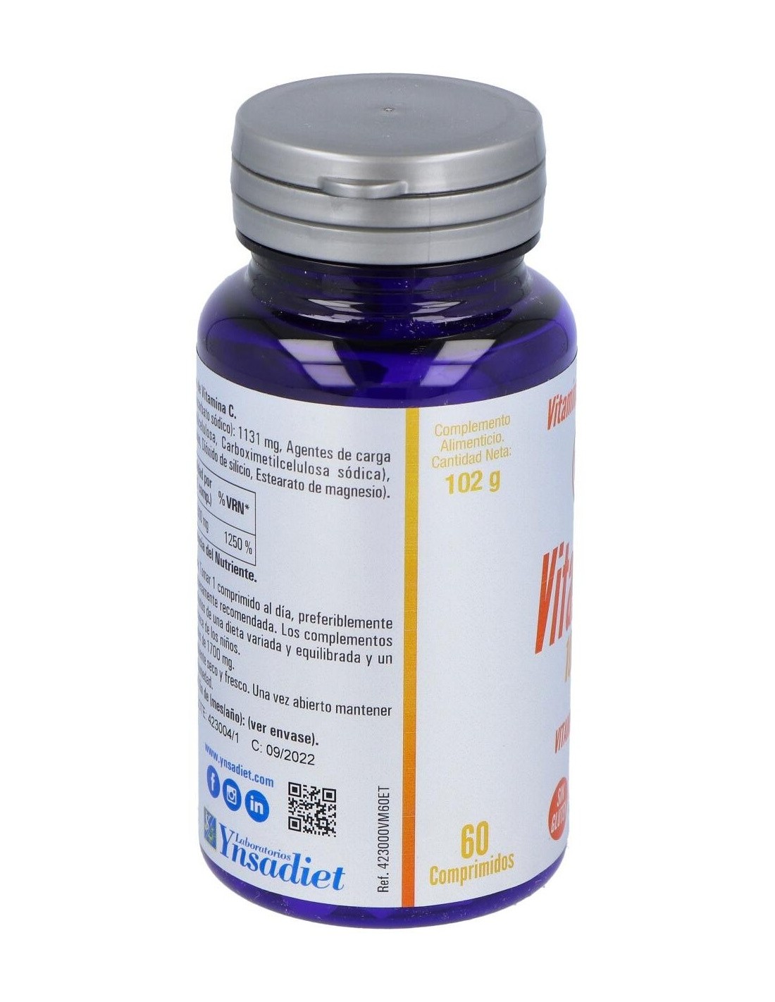 Vitamina C (Ascorbato sódico): 1131 mg, Agentes de carga (Celulosa, Fosfatos de calcio, Hidroxipropilcelulosa, Carboximetilcelulosa sódica), Antiaglomerantes (Monoglicéridos de ácidos grasos, Dióxido de silicio, Estearato de magnesio).