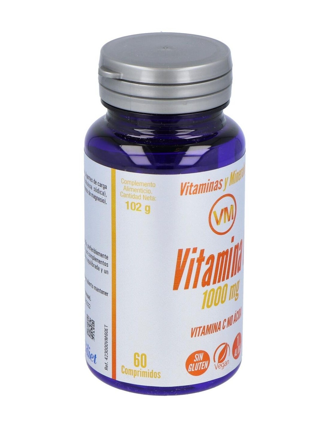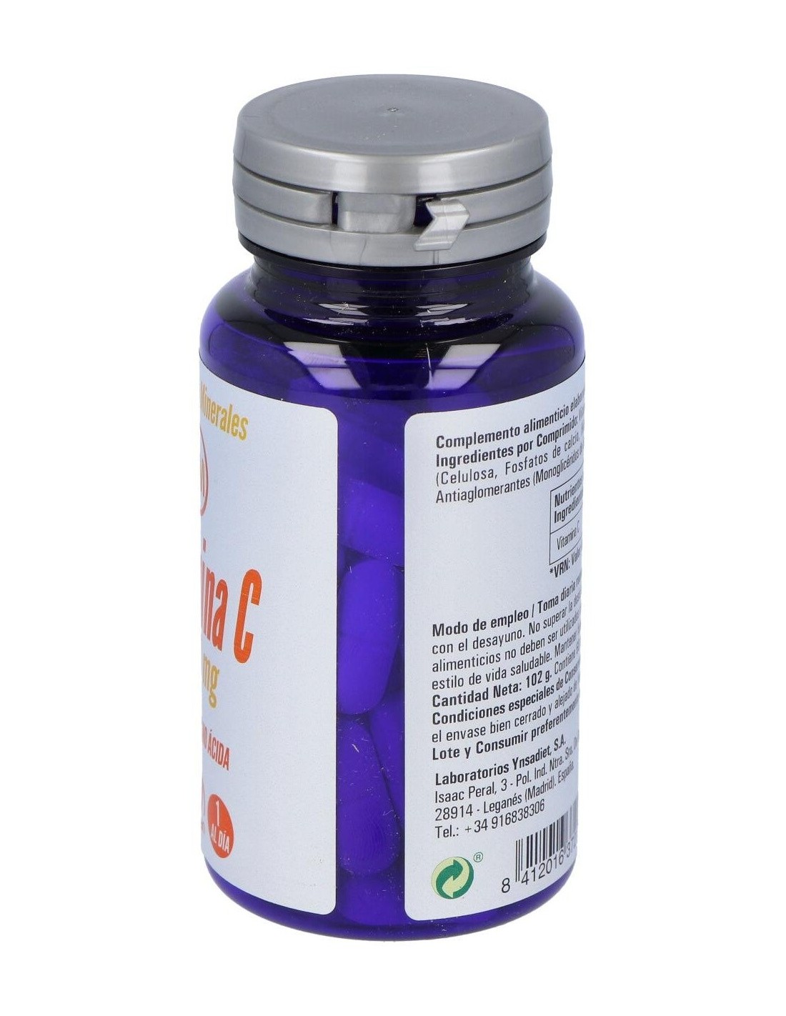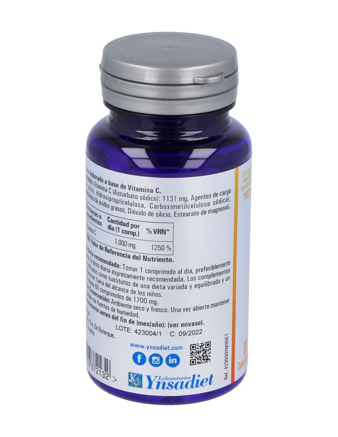 Vitamina C (Ascorbato sódico): 1131 mg, Agentes de carga (Celulosa, Fosfatos de calcio, Hidroxipropilcelulosa, Carboximetilcelulosa sódica), Antiaglomerantes (Monoglicéridos de ácidos grasos, Dióxido de silicio, Estearato de magnesio).