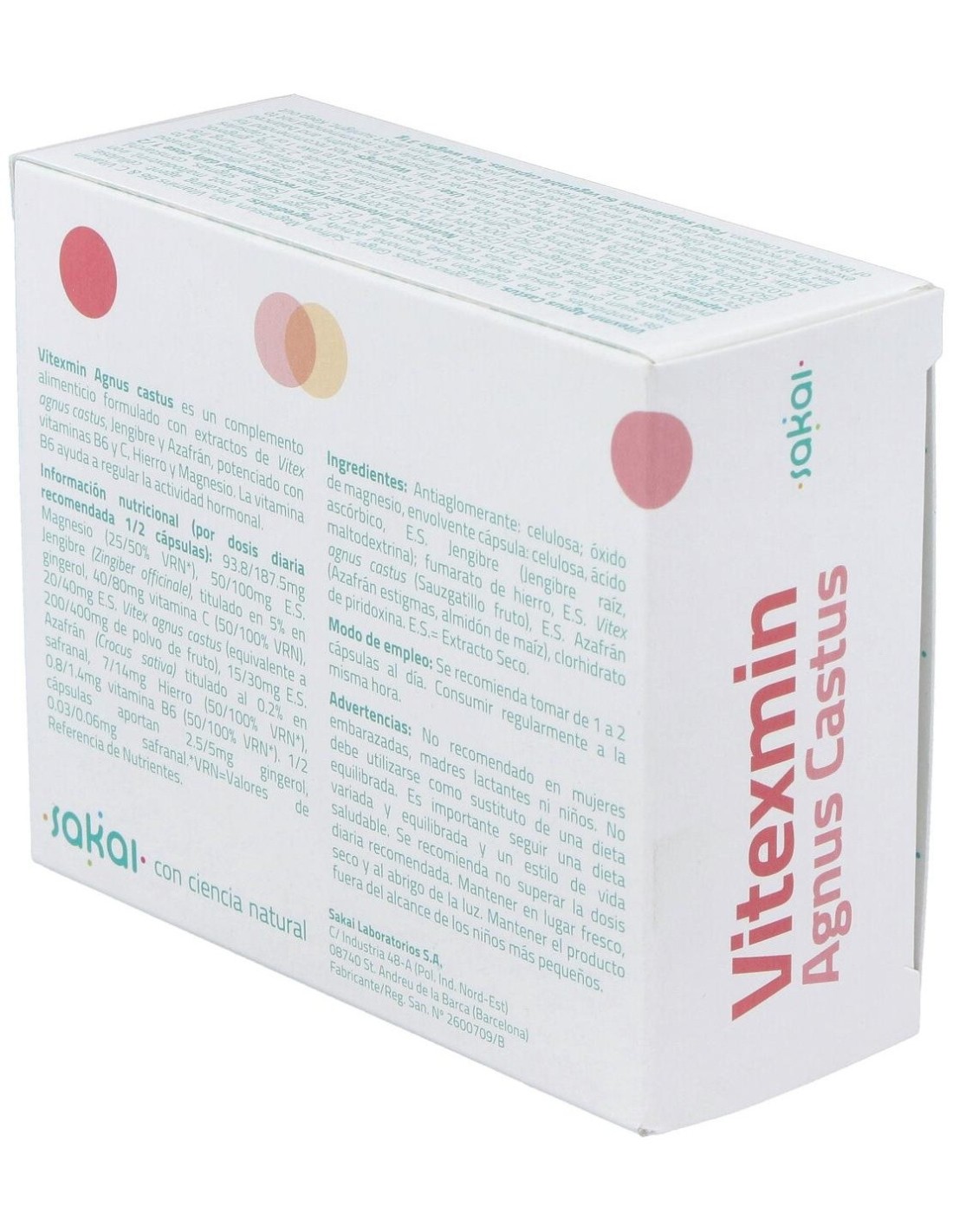 Vitexmin Agnus Castus 60Cap. de Sakai es un suplemento natural dirigido a mujeres que buscan apoyo en el equilibrio hormonal, formulado con extracto de Vitex agnus-castus para favorecer el bienestar femenino.
