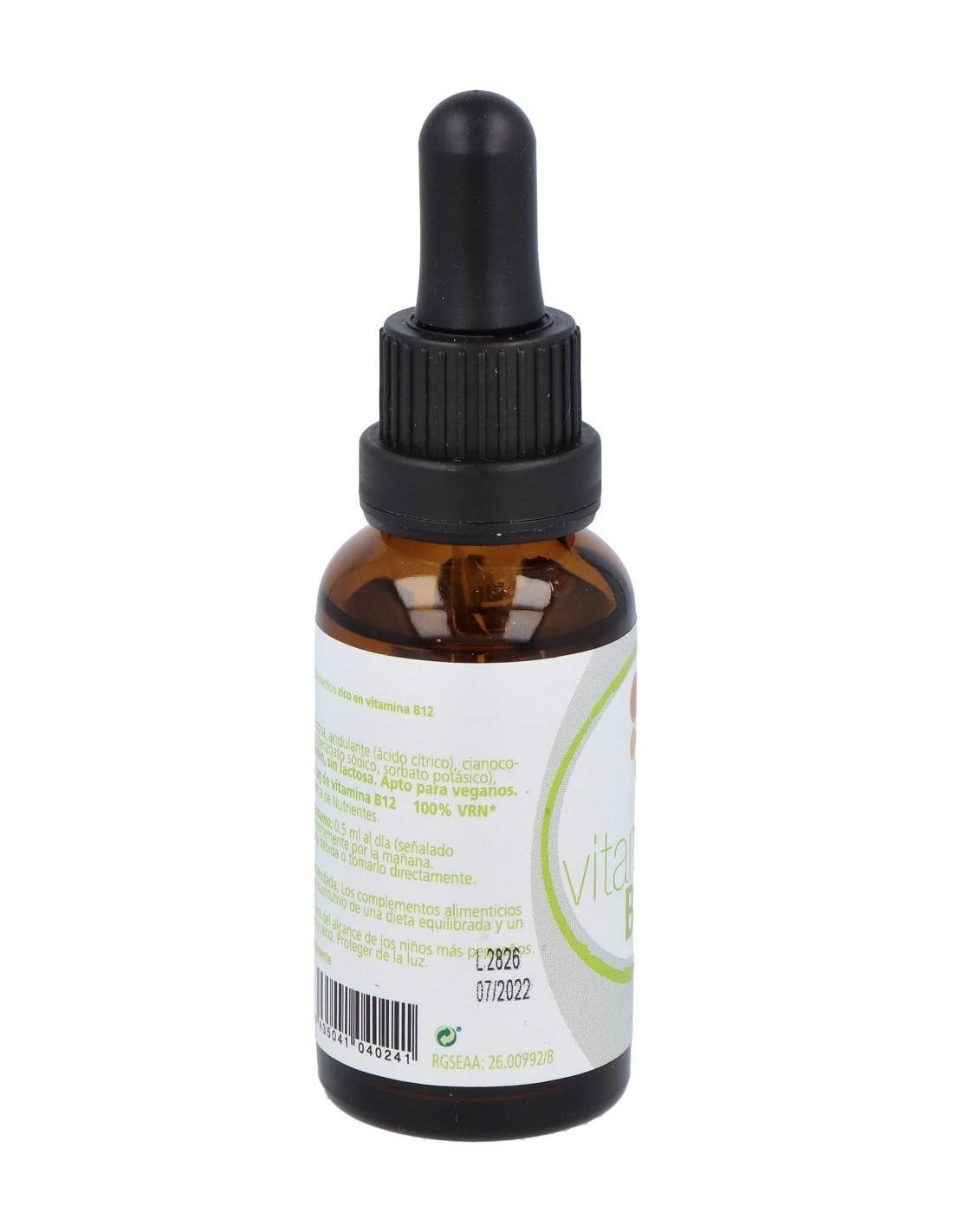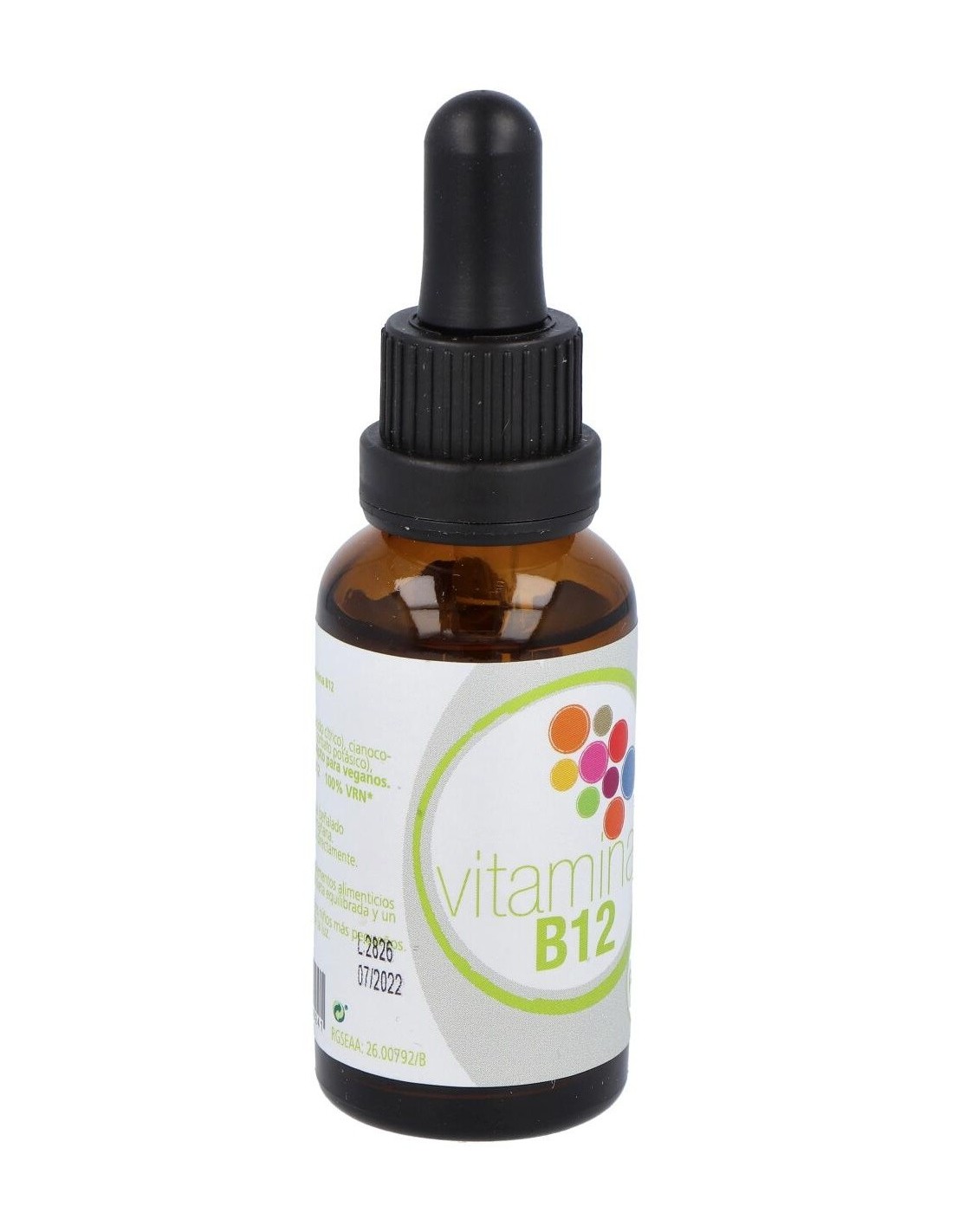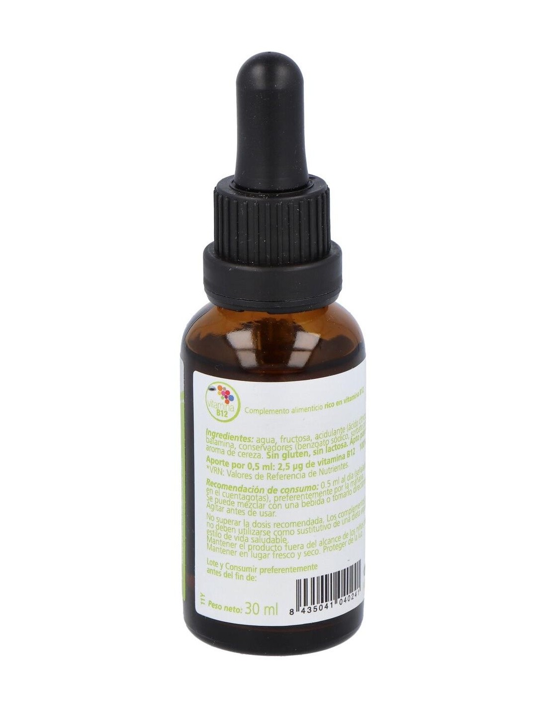 La vitamina B12 es una vitamina hidrosoluble que se sintetiza por un gran número de bacterias intestinales que se hallan de modo habitual en el organismo humano, sin embargo, el aprovechamiento de la vitamina B12 es mínimo, ya que la síntesis ocurre en sitios muy alejados del lugar de absorción fisiológica de la vitamina, por tanto, su ingesta a través de los alimentos es muy necesaria.La vitamina B12 sólo se encuentra en carnes y lácteos y es por ello que veganos y vegetarianos suelen necesitar una suplementación para compensar su déficit. Es necesaria para la elaboración de las células, la síntesis de la hemoglobina y el sistema nervioso nervioso.Composición activa por 0,5 ml:2,5 mcg de vitamina B12.Ingredientes:Agua, fructosa, acidulante (ácido cítrico), cianocobalamina, conservadores (benzoato sódico, sorbato potásico), aroma de cereza.Modo de empleo:Tomar 0.5 ml al día (señalado en el cuenta gotas), preferentemente por la mañana. Se puede mezclar con una bebida o tomarlo directamente. Agitar antes de usar.Presentación:Envase de 30 ml.Recomendaciones y advertencias:No contiene gluten, lactosa. Apto para veganos.