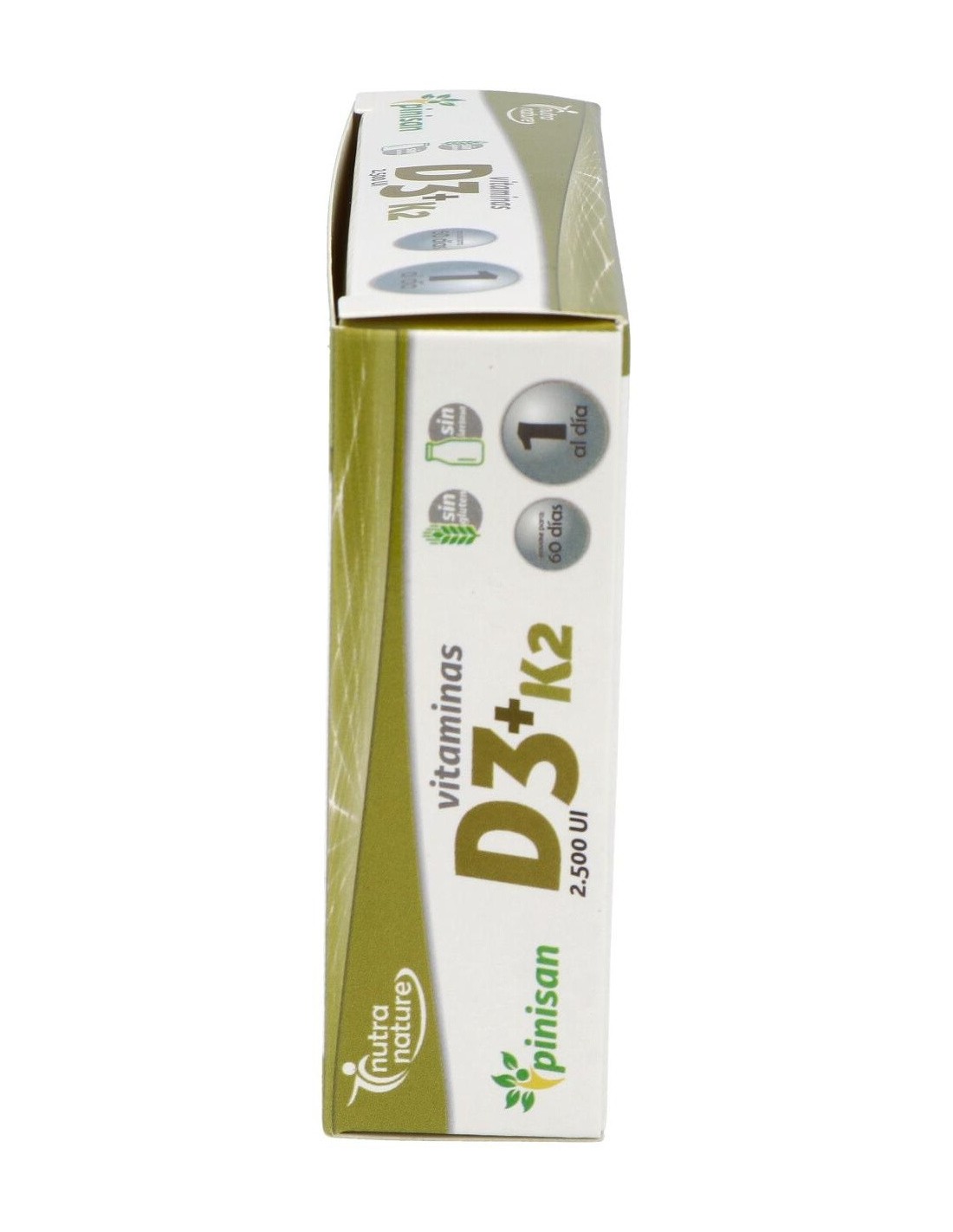 Complemento alimenticio a base de vitamina D3, que contribuye al mantenimiento de los huesos y dientes en condiciones normales, al funcionamiento normal del sistema inmunitario y de los músculos, al mantenimiento de niveles normales de calcio en sangre, a la absorción y utilización normal del calcio y el fósforo, y al proceso de división celular. También incluye vitamina K2, que contribuye al mantenimiento de los huesos en condiciones normales y a la coagulación sanguínea normal. Sin gluten y sin lactosa. Envase con 60 cápsulas. Cápsulas con vitaminas D3 y K2 (2500 UI)
