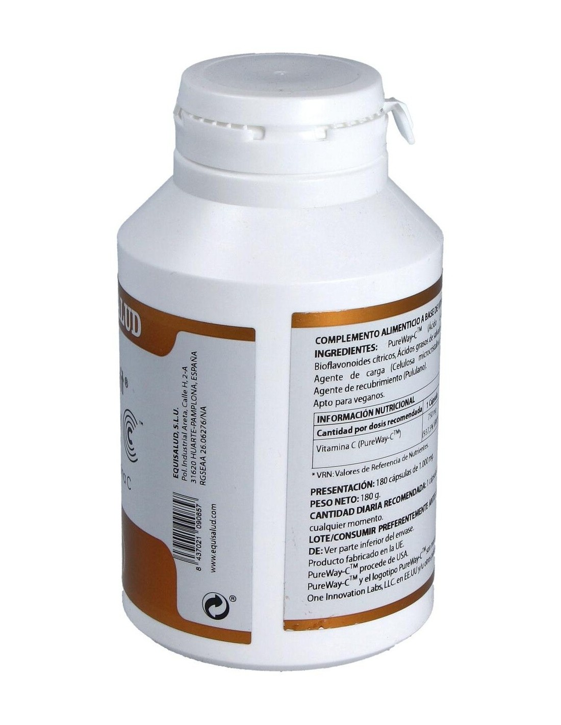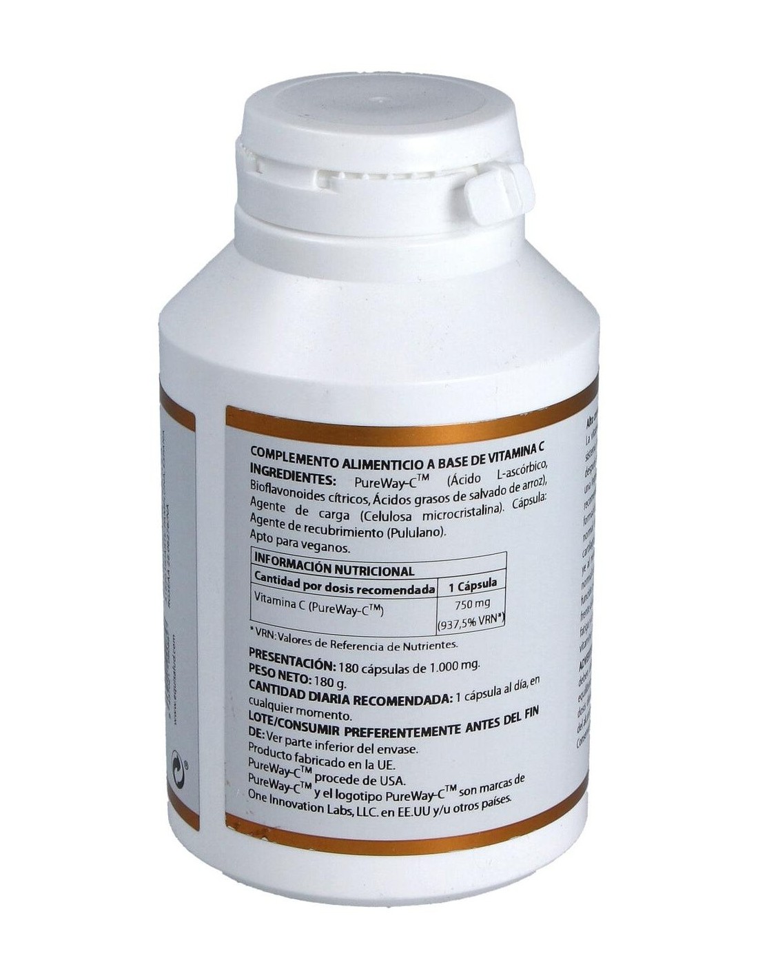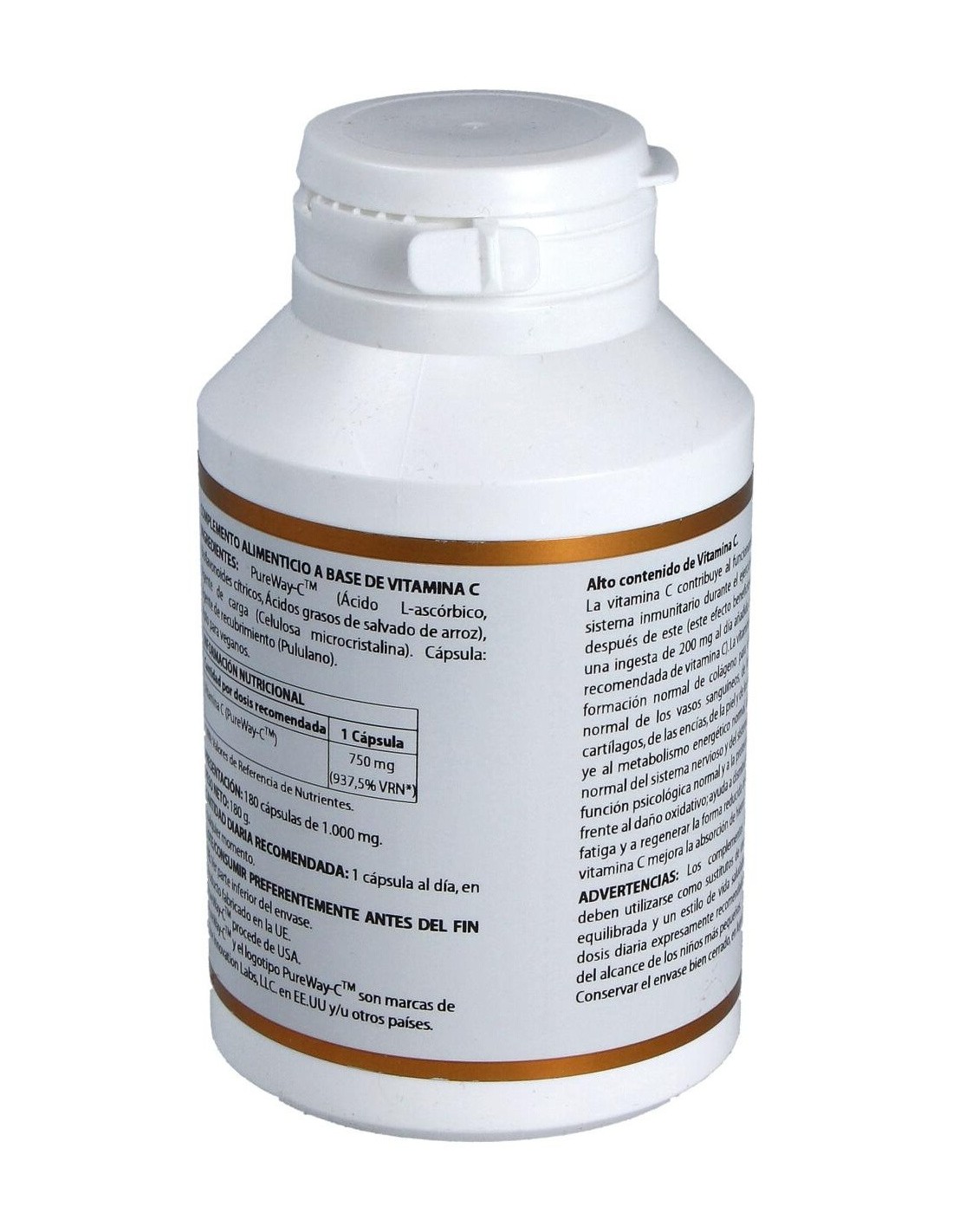 PureWay-CTM (ácido L-ascórbico 90-95%, bioflavonoides cítricos 0,1-5%, ácidos grasos de salvado de arroz 0,1-5%), 833,3 mg (aporta 750 mg de vitamina C). Envoltura: polisacárido de origen vegetal (pululano).