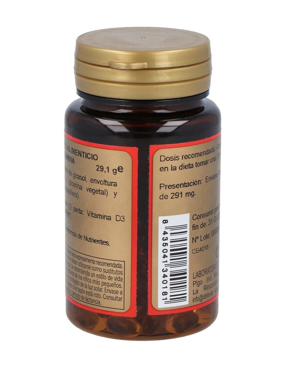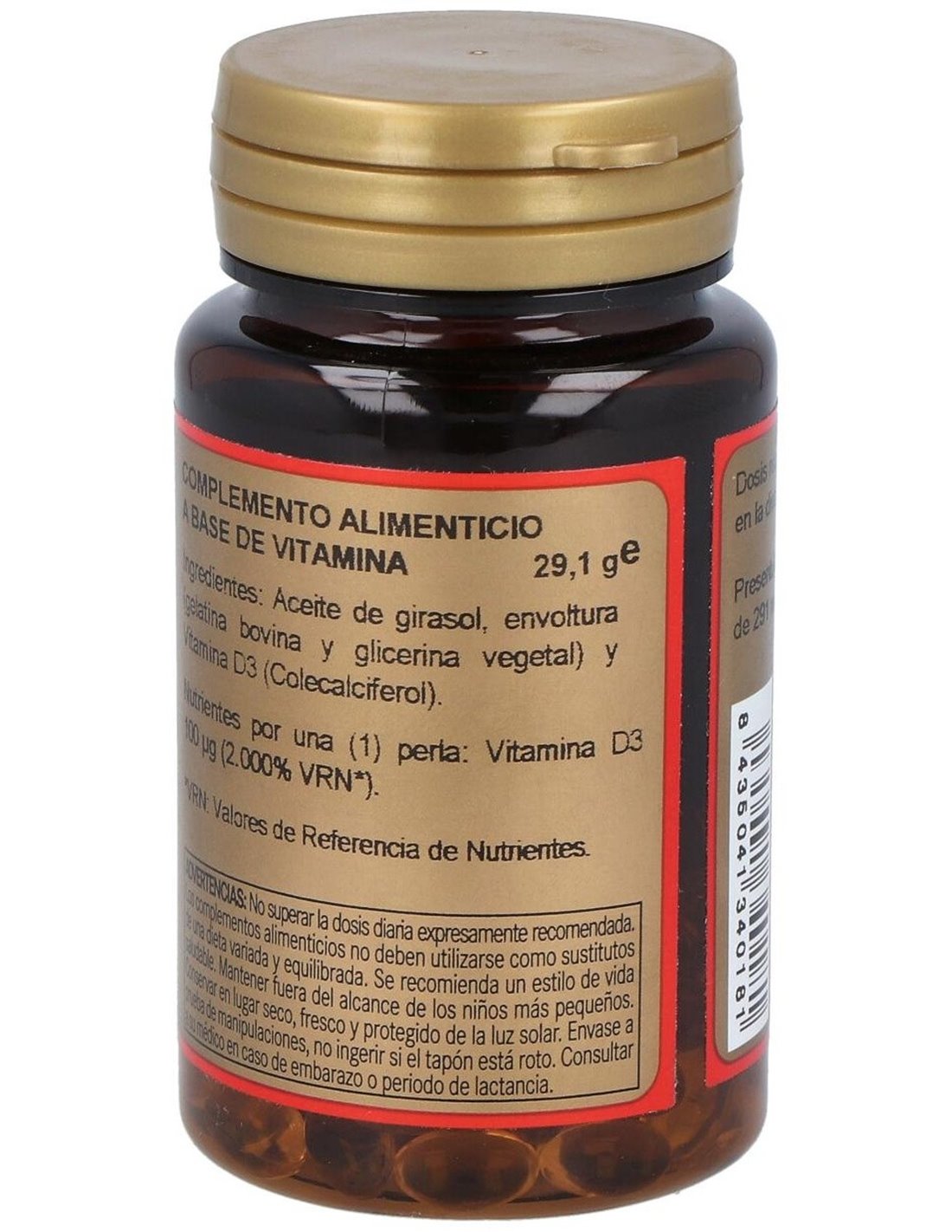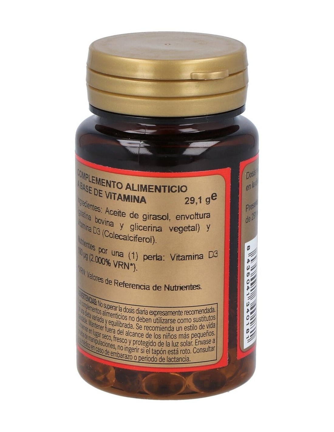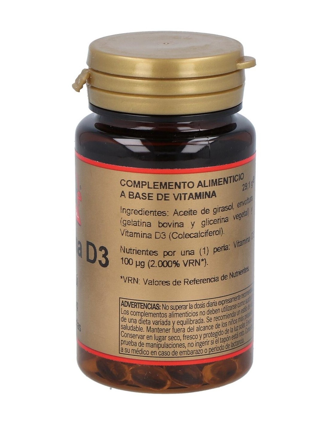 Complemento alimenticio en forma de perlas blandas, elaborado con vitamina D3, que es esencial para reforzar el sistema inmunitario. Contribuye a tener unos huesos y dientes saludables, al funcionamiento normal de los músculos, y es ideal para la absorción y utilización normal del calcio y el fósforo.Contribuye al proceso de división celular y al mantenimiento de los niveles normales de calcio en sangre, por lo que es particularmente importante durante los meses de invierno y sobre todo en las personas mayores, ya que la capacidad del cuerpo para producir vitamina D disminuye con la edad.