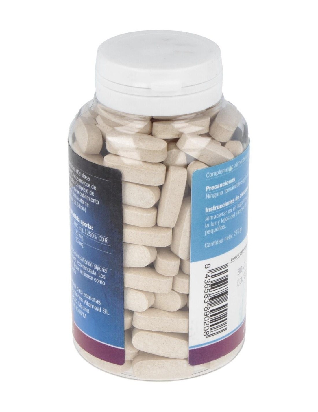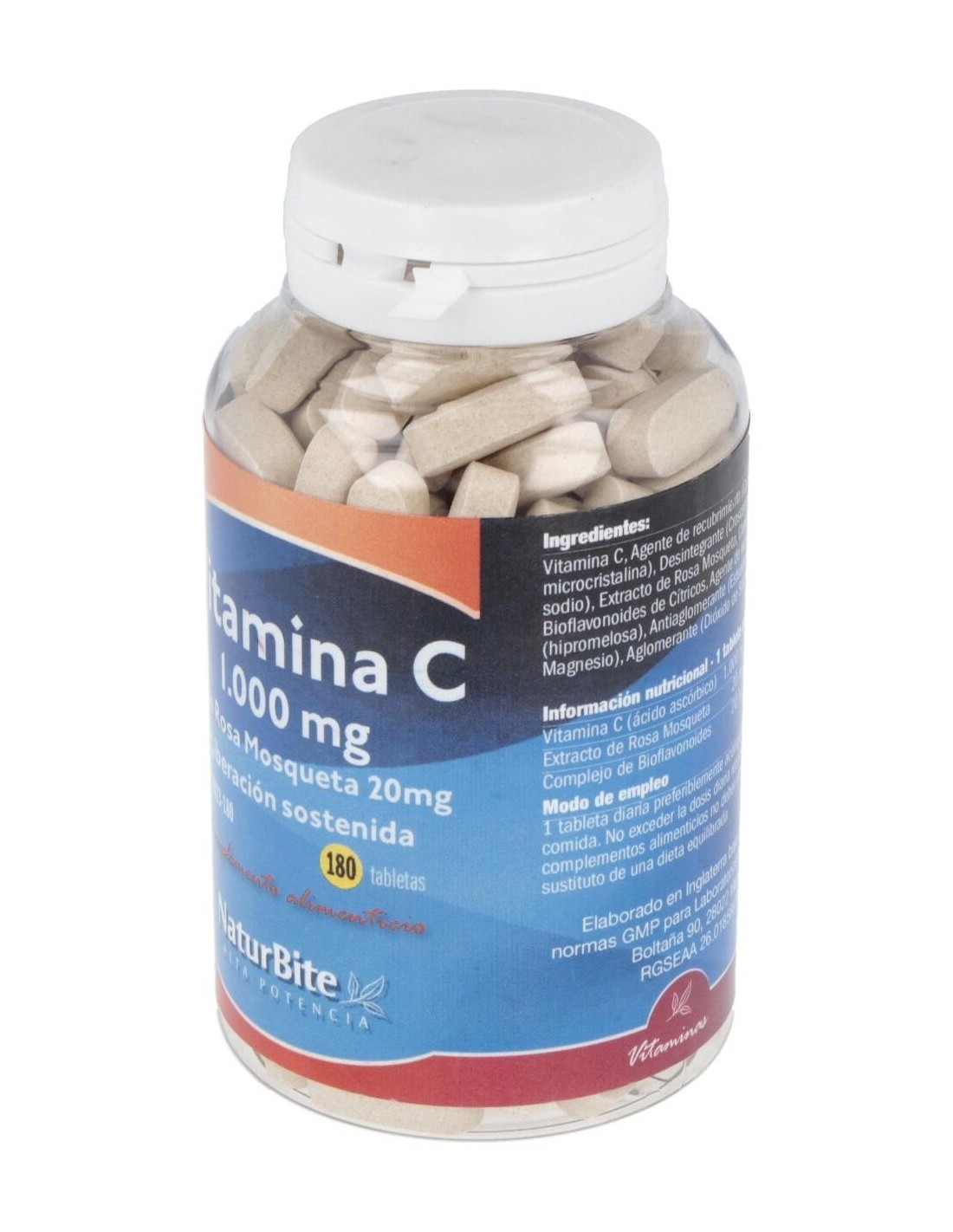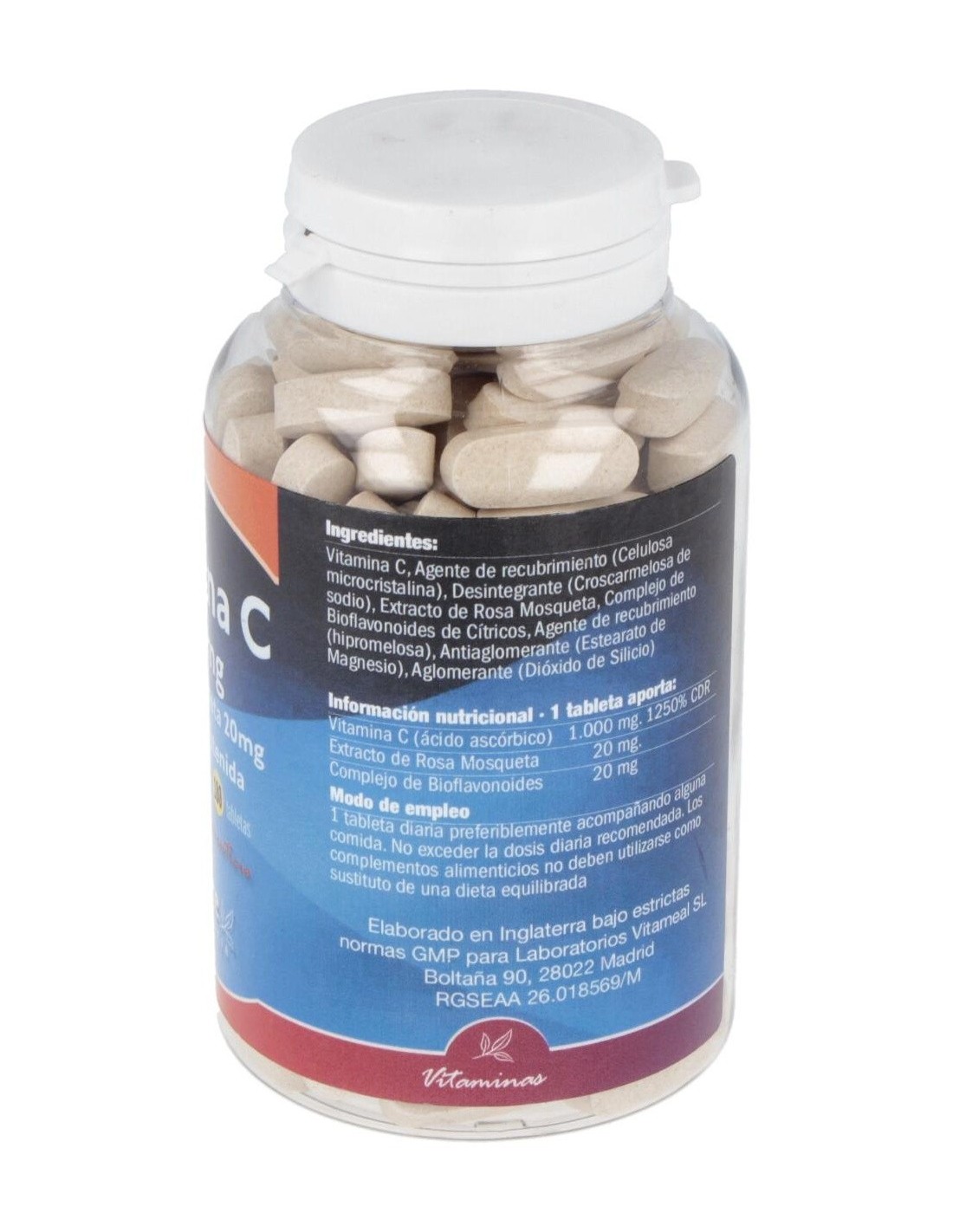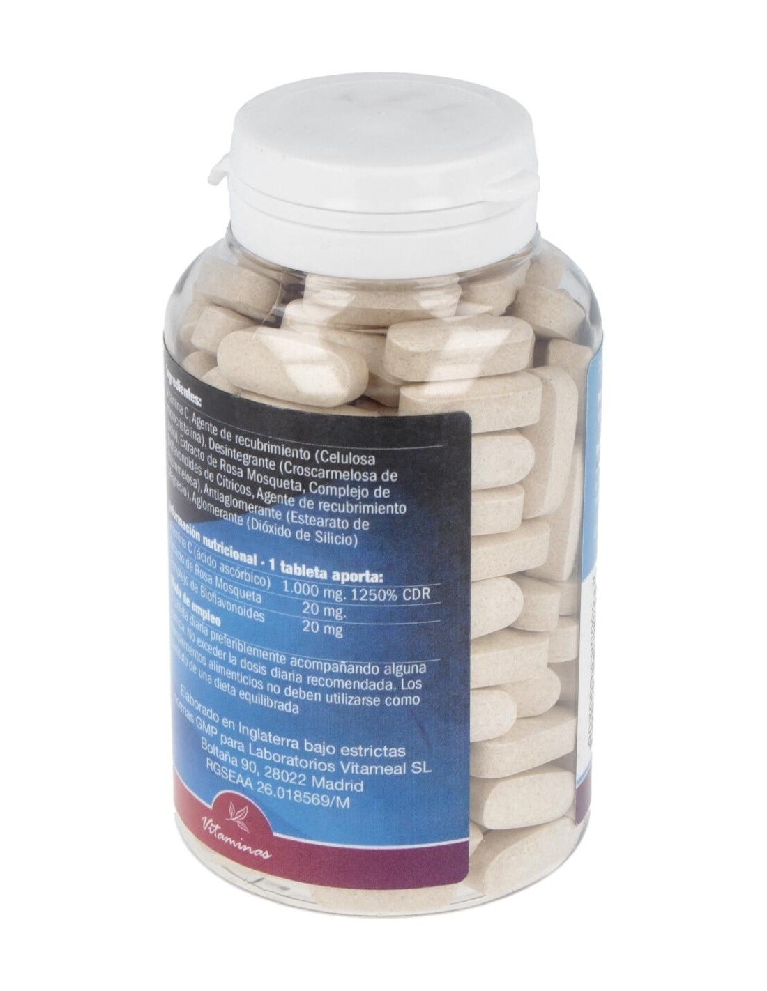 Vitamina C (ácido ascórbico) 1.000 mg, Extracto de Rosa Mosqueta 20 mg, Complejo de Bioflavonoides de Cítricos 20 mg. Celulosa microcristalina, Croscarmelosa de sodio, Agente de recubrimiento (hipromelosa), Estearato de magnesio, Dióxido de Silicio.