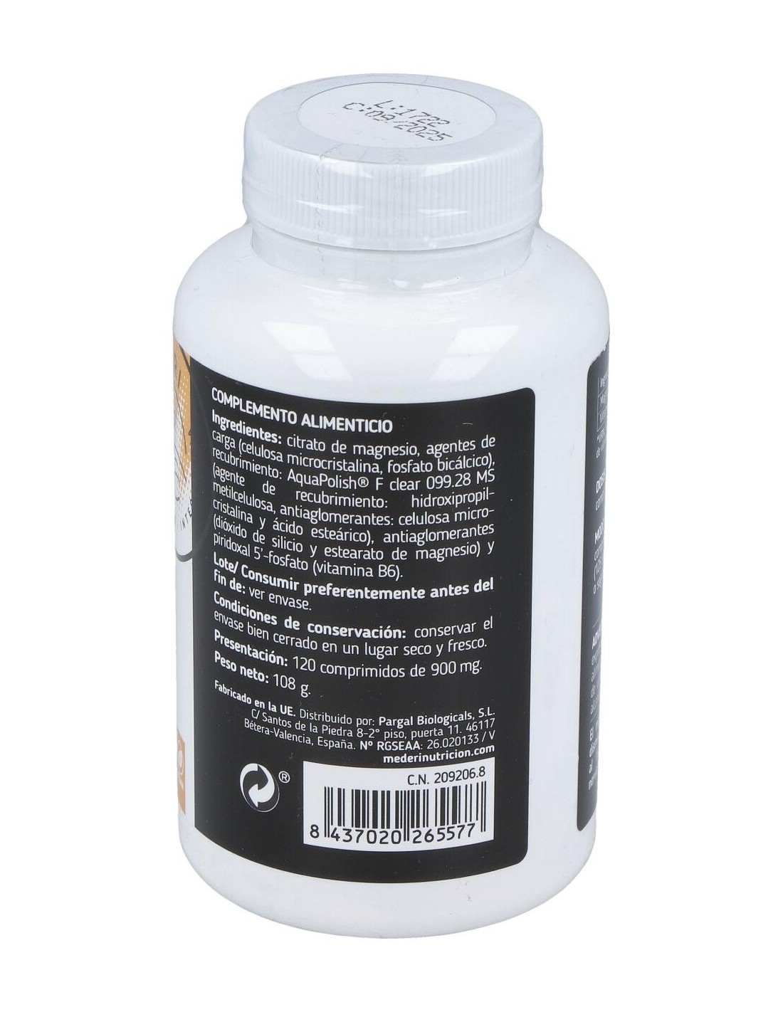 Citrato de magnesio, agentes de carga (celulosa microcristalina, fosfato bicálcico), recubrimiento: AquaPolish® F clear 099.28 MS (agente de recubrimiento: hidroxipropilmetil- celulosa, antiaglomerantes: celulosa microcristalina y ácido esteárico), antiaglomerantes (dióxido de silicio y estearato de magnesio) y piridoxal 5-fosfato (vitamina B6).